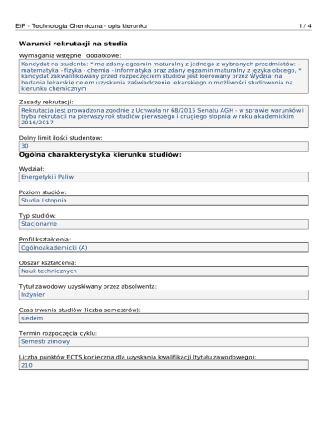 EiP - Technologia Chemiczna - opis kierunku 1/4 Warunki rekrutacji na studia Wymagania wstępne i dodatkowe: Kandydat na studenta: * ma zdany egzamin maturalny z jednego z wybranych przedmiotów: matematyka - fizyka - chemia - informatyka oraz zdany egzamin maturalny z języka obcego, * kandydat zakwalifikowany przed rozpoczęciem studiów jest kierowany przez Wydział na badania lekarskie celem uzyskania zaświadczenie lekarskiego o możliwości studiowania na kierunku chemicznym Zasady rekrutacji: Rekrutacja jest prowadzona zgodnie z Uchwałą nr 68/2015 Senatu AGH - w sprawie warunków i trybu rekrutacji na pierwszy rok studiów pierwszego i drugiego stopnia w roku akademickim 2016/2017 Dolny limit ilości studentów: 30 Ogólna charakterystyka kierunku studiów: Wydział: Energetyki i Paliw Poziom studiów: Studia I stopnia Typ studiów: Stacjonarne Profil kształcenia: Ogólnoakademicki (A) Obszar kształcenia: Nauk technicznych Tytuł zawodowy uzyskiwany przez absolwenta: Inżynier Czas trwania studiów (liczba semestrów): siedem Termin rozpoczęcia cyklu: Semestr zimowy Liczba punktów ECTS konieczna dla uzyskania kwalifikacji (tytułu zawodowego): 210 EiP - Technologia Chemiczna - opis kierunku 2/4 Dziedziny nauk, do których odnoszą się zakładane efekty kształcenia: Nauki techniczne Nauki techniczne Dyscypliny naukowe, do których odnoszą się zakładane efekty kształcenia: Związek kierunku studiów ze strategią rozwoju AGH oraz misją AGH: Zgodnie z Misją Akademii Górniczo-Hutniczej kierunek w pełni realizuje postulat służby dla polskiej gospodarki, szczególnie w sektorze paliwowo-energetycznym, a aktualne przystosowywanie programów pełnego kształcenia na studiach (pierwszego, drugiego, a także trzeciego stopnia) prowadzonych na Wydziale Energetyki i Paliw do zmieniających się realiów i nowych wymagań krajowych/międzynarodowych, scharakteryzowanych w kategoriach efektów kształcenia (wiedzy/umiejętności/kompetencji społecznych) w obszarze Krajowych Ram Kwalifikacji (KRK), wpisuje się ściśle w Strategię Rozwoju Uczelni. Zasady dotyczące struktury studiów (zasady studiowania) Dopuszczalny deficyt punktowy: 15 Semestry kontrolne: pierwszy, drugi, szósty Zasady wpisu na kolejny semestr: Student uzyskuje wpis na kolejny semestr po złożeniu w dziekanacie indeksu z zaliczonymi modułami. Wpis można uzyskać przy deficycie punktów nie większym niż 15 punktów ECTS w skali roku akademickiego. Studia indywidualne: Studia indywidualne SI na pierwszym stopniu studiów na wydziale EiP odbywają się zgodnie z Regulaminem Studiów w AGH i Uchwałą 9/2013 Rady Wydziału w/g następujących zasad: 1. Na studia indywidualne (SI) może być zakwalifikowany student, który ukończył drugi semestr studiów pierwszego stopnia i uzyskał w okresie studiów ocenę średnią co najmniej 4,25. 2. Dziekan kwalifikuje na studia indywidualne (SI) na podstawie wniosku studenta biorąc pod uwagę jego postępy w studiowaniu, zainteresowania, zdolności i osiągnięcia. 3. Dziekan zatwierdza dołączone do wniosku studenta: zaopiniowany przez Wydziałowy Zespół ds. Jakości Kształcenia program studiów indywidualnych, opiekuna naukowego studenta oraz plan studiów indywidualnych. 4. Zmiany w programie kształcenia nie mogą dotyczyć kierunkowych efektów kształcenia i profilu kształcenia. Program studiów indywidualnych może być w części lub całości realizowany na uczelniach zagranicznych np. w ramach wymiany Erasmus. 5. Opiekun naukowy studenta przygotowuje ze studentem program i plan studiów indywidualnych, czuwa nad ich przebiegiem oraz służy pomocą studentowi w czasie realizacji programu studiów indywidualnych. 6. Studia indywidualne (SI) nie mogą przedłużyć terminu ukończenia studiów, a zaliczenie semestru (roku) studiów odbywa się zgodnie z Regulaminem studiów AGH. Zasady ustalania końcowej oceny studiów: Ocena końcowa studiów (OK) zgodnie z Uchwałą D8/2010 Rady Wydziału Energetyki i Paliw jest średnią ważoną: OK = 0,6*S + 0,2*E + 0,2*P gdzie: S - średnia ze studiów E - ocena z egzaminu inżynierskiego P - ocena pracy inżynierskiej/projektu inżynierskiego EiP - Technologia Chemiczna - opis kierunku 3/4 Inne: Kwalifikacje absolwenta: Po ukończeniu studiów absolwent – w oparciu o nabytą wiedzę z zakresu matematyki, fizyki, informatyki, chemii w tym chemii nieorganicznej, organicznej, fizycznej, analitycznej, jądrowej/ radiochemii, chemicznych metod eksperymentalnych, instrumentalnych metod badawczych i technik obliczeniowych, niezbędnych do rozwiązywania zadań inżynierskich, jak również wiedzę i umiejętności jej stosowania z zakresu maszynoznawstwa, budowy aparatury chemicznej, inżynierii i technologii chemicznej, zwłaszcza energochemicznego przetwarzania surowców oraz oceny właściwości fizykochemicznych i użytkowych produktów paliwowych – potrafi zaplanować, zrealizować i zoptymalizować zadanie inżynierskie w obszarze nauk technicznych zgodnie z wymaganiami najlepszych dostępnych technik (BAT). Absolwent studiów zna podstawy ekonomii i socjologii w zakresie niezbędnym do kierowania firmą i zespołami ludzkimi, a także do prowadzenia własnej działalności gospodarczej. Działalność zawodową wykonuje zgodnie z obowiązującym prawem, kierując się zasadami etyki zawodowej. Zna język obcy/angielski na poziomie biegłości B2 Europejskiego Systemu Opisu Kształcenia Językowego oraz umie posługiwać się językiem specjalistycznym z zakresu kierunku studiów. Absolwent ma świadomość konieczności ustawicznego kształcenia oraz jest przygotowany do kontynuowania kształcenia na poziomie studiów drugiego stopnia, zwłaszcza ukierunkowanych na technologię chemiczną, inżynierię materiałową, biotechnologię, inżynierię chemiczną i procesową, inżynierię środowiska, zarządzanie i inżynierię produkcji itp., a także na studiach podyplomowych. Podczas studiów odbywa mini