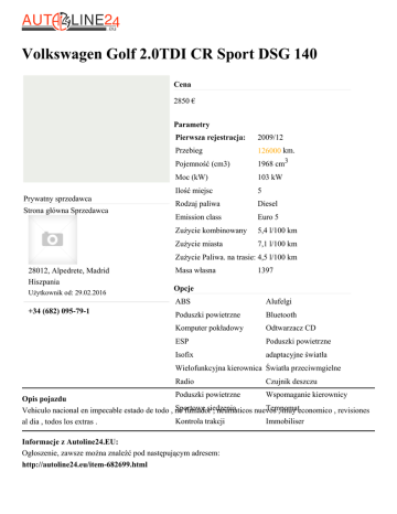 Volkswagen Golf 2.0TDI CR Sport DSG 140 Cena 2850 € Parametry Prywatny sprzedawca Strona główna Sprzedawca Pierwsza rejestracja: 2009/12 Przebieg 126000 km. Pojemność (cm3) 1968 cm3 Moc (kW) 103 kW Ilość miejsc 5 Rodzaj paliwa Diesel Emission class Euro 5 Zużycie kombinowany 5,4 l/100 km Zużycie miasta 7,1 l/100 km Zużycie Paliwa. na trasie: 4,5 l/100 km 28012, Alpedrete, Madrid Hiszpania Użytkownik od: 29.02.2016 +34 (682) 095-79-1 Masa własna 1397 Opcje ABS Alufelgi Poduszki powietrzne Bluetooth Komputer pokładowy Odtwarzacz CD ESP Poduszki powietrzne Isofix adaptacyjne światła Wielofunkcyjna kierownica Światła przeciwmgielne Radio Czujnik deszczu Poduszki powietrzne Wspomaganie kierownicy Opis pojazdu Sportowe siedzenia Tempomat Vehiculo nacional en impecable estado de todo , no fumador , neumaticos nuevos , muy economico , revisiones Kontrola trakcji Immobiliser al dia , todos los extras . Informacje z Autoline24.EU: Ogłoszenie, zawsze można znaleźć pod następującym adresem: http://autoline24.eu/item-682699.html