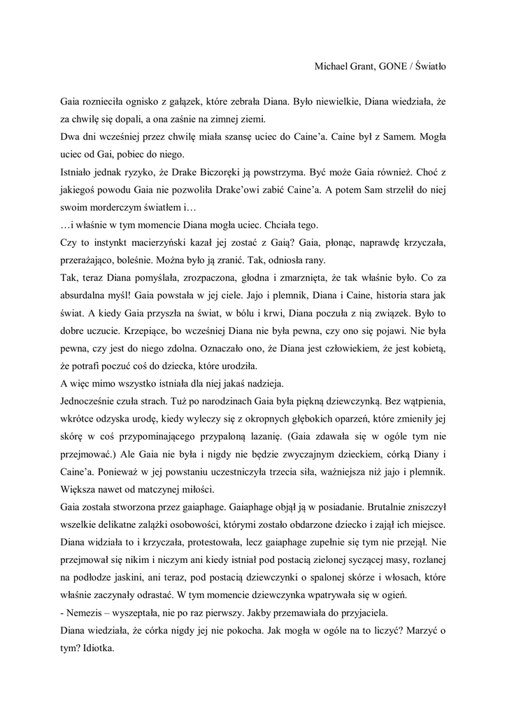Michael Grant, GONE / Światło Gaia roznieciła ognisko z gałązek, które zebrała Diana. Było niewielkie, Diana wiedziała, że za chwilę się dopali, a ona zaśnie na zimnej ziemi. Dwa dni wcześniej przez chwilę miała szansę uciec do Caine’a. Caine był z Samem. Mogła uciec od Gai, pobiec do niego. Istniało jednak ryzyko, że Drake Biczoręki ją powstrzyma. Być może Gaia również. Choć z jakiegoś powodu Gaia nie pozwoliła Drake’owi zabić Caine’a. A potem Sam strzelił do niej swoim morderczym światłem i… …i właśnie w tym momencie Diana mogła uciec. Chciała tego. Czy to instynkt macierzyński kazał jej zostać z Gaią? Gaia, płonąc, naprawdę krzyczała, przerażająco, boleśnie. Można było ją zranić. Tak, odniosła rany. Tak, teraz Diana pomyślała, zrozpaczona, głodna i zmarznięta, że tak właśnie było. Co za absurdalna myśl! Gaia powstała w jej ciele. Jajo i plemnik, Diana i Caine, historia stara jak świat. A kiedy Gaia przyszła na świat, w bólu i krwi, Diana poczuła z nią związek. Było to dobre uczucie. Krzepiące, bo wcześniej Diana nie była pewna, czy ono się pojawi. Nie była pewna, czy jest do niego zdolna. Oznaczało ono, że Diana jest człowiekiem, że jest kobietą, że potrafi poczuć coś do dziecka, które urodziła. A więc mimo wszystko istniała dla niej jakaś nadzieja. Jednocześnie czuła strach. Tuż po narodzinach Gaia była piękną dziewczynką. Bez wątpienia, wkrótce odzyska urodę, kiedy wyleczy się z okropnych głębokich oparzeń, które zmieniły jej skórę w coś przypominającego przypaloną lazanię. (Gaia zdawała się w ogóle tym nie przejmować.) Ale Gaia nie była i nigdy nie będzie zwyczajnym dzieckiem, córką Diany i Caine’a. Ponieważ w jej powstaniu uczestniczyła trzecia siła, ważniejsza niż jajo i plemnik. Większa nawet od matczynej miłości. Gaia została stworzona przez gaiaphage. Gaiaphage objął ją w posiadanie. Brutalnie zniszczył wszelkie delikatne zalążki osobowości, którymi zostało obdarzone dziecko i zajął ich miejsce. Diana widziała to i krzyczała, protestowała, lecz gaiaphage zupełnie się tym nie przejął. Nie przejmował się nikim i niczym ani kiedy istniał pod postacią zielonej syczącej masy, rozlanej na podłodze jaskini, ani teraz, pod postacią dziewczynki o spalonej skórze i włosach, które właśnie zaczynały odrastać. W tym momencie dziewczynka wpatrywała się w ogień. - Nemezis – wyszeptała, nie po raz pierwszy. Jakby przemawiała do przyjaciela. Diana wiedziała, że córka nigdy jej nie pokocha. Jak mogła w ogóle na to liczyć? Marzyć o tym? Idiotka. Może jednak… Może co? Może co? Diana zaczęła drwić w duchu. Osądzała samą siebie równie bezlitośnie jak innych. „Jakiej to idiotycznej nadziei czepiasz się, Diano? Wiesz, czym jest ta dziewczynka. Wiesz, że tak naprawdę nie jest twoja. Wiesz, że nawet nie powinnaś nazywać jej ona, lecz to.” Ale była taka śliczna w blasku ognia. „Wyobraź sobie”, torturowała się w myślach Diana, „wyobraź sobie, że to naprawdę tylko mała dziewczynka, twoja córka. Wyobraź sobie, jakim byłaby cudem. Wyobraź sobie, co mogłabyś poczuć, gdyby ta piękna dziewczynka naprawdę była twoim dzieckiem. Twoim i jego. Piękna doskonała dziewczynka… Ciemna, przerażająca istota. - To nie będzie bolało, Nemezis – powiedziała Gaia. Nie zwracała się do Diany. Diana zastanawiała się, czy ponownie dopuści do tego, by zapanował nad nią ktoś zły. Najpierw Caine, teraz Gaia? Czy bezsilny sarkazm to jedyny sposób, w jaki mogła się temu przeciwstawić? Podczas ciąży, krótszej niż to normalnie, wyobrażała sobie, jak to będzie zostać matką. Lepszą matką niż jej własna. Wyobrażała sobie, że stanie się lepszą osobą. Powtarzała sobie, że potrafi. Że nie musi na zawsze pozostać taka, jaką zawsze była, nie musi pozostać tym, kim się stała. Istniał dla niej ratunek. - Zakończenie to najlepsza część każdej historii – wyszeptała Gaia. Rozmawiała z kimś, kto dla Diany pozostawał niewidoczny. – Koniec. Diana wyobrażała sobie, że jako matka dostąpi odkupienia, wybaczenia, że będzie jej dany nowy początek. Ale była matką potwora, który w ogóle o nią nie dbał. - Zawsze podejmuję błędne decyzje – szepnęła sama do siebie, leżąc na ziemi i obejmując się ciasno ramionami, by zapewnić sobie nieco ciepła. - Co? – warknęła Gaia, spoglądając na nią. - Ech – odparła Diana z westchnieniem. – Nic takiego. Mały Pete robił się coraz mniejszy. W każdym razie takie odnosił wrażenie. Czuł się, jakby się kurczył i chyba nie było to złe uczucie. Może nawet ulga. Życie zawsze było trudne i dziwne dla Petera Ellingsona. Od chwili, gdy się narodził, świat atakował go hałasem, światłem i szorstkim dotykiem. Te wszystkie wrażenia, które inni ludzie rozpoznawali i odpowiednio interpretowali, jemu przedstawiały się jako coś przerażającego i przytłaczającego. Inni ludzie potrafili je filtrować. Inni ludzie potrafili wyciszyć dźwięk, ale Pete nie potrafił. Nie wtedy, kiedy znajdował się w swoim ciele. To ciało stanowiło prawdziwy problem. Poważny autyzm, który uczynił z niego kalekę, znajdował się w jego ciele, w jego mózgu. Poczuł prawdziwą ulgę, kiedy wyzwolił się z tego ciała i umysłu. Kiedy Astrid, jego siostra o przenikliwych niebieskich oczach i żółtych wężowych włosach, skazała go na fizyczną śmierć, poczuł się… wolny. Pete stworzył sobie nowe miejsce, które nie było jego ciałem. Nosił swoją moc ze sobą, ale ta moc popełniała okropne błędy. Teraz to widział. Zrozumiał, co zrobił Taylor. Nie mógł już robić takich rzeczy, nie mógł bawić się abstrakcyjnymi kształtami, które w rzeczywistości były bytami ludzkimi. Teraz zanikał, niczym światło z tym specjalnym przełącznikiem. Mieli taki w jadalni, w domu, w kt