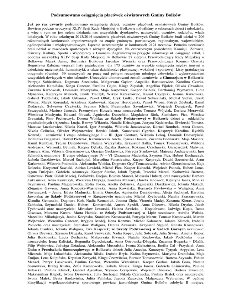 Podsumowano osiągnięcia placówek oświatowych Gminy Bolków Już po raz czwarty podsumowano osiągnięcia dzieci, uczniów placówek oświatowych Gminy Bolków. Bowiem podczas uroczystej XLIV Sesji Rady Miejskiej w Bolkowie mówiliśmy o sukcesach dzieci i młodzieży, a więc o tym co jest celem działania nas wszystkich: dyrektorów, nauczycieli, uczniów, rodziców, władz lokalnych. W roku szkolnym 2013/2014 uczniowie placówek oświatowych Gminy Bolków brali udział w 206 różnorodnych konkursach organizowanych na etapie gminnym, powiatowym, regionalnym, wojewódzkim, ogólnopolskim i międzynarodowym. Łącznie uczestniczyło w konkursach 2121 uczniów. Ponadto uczniowie brali udział w zawodach sportowych z różnych dyscyplin. Na czerwcowym posiedzeniu Komisji Zdrowia, Oświaty, Kultury, Sportu i Współpracy z Gminami Zagranicznymi przyjęto informacje nt. osiągnięć szkół, a podczas niezwykłej XLIV Sesji Rady Miejskiej w Bolkowie 27 sierpnia Przewodniczący Rady Miejskiej w Bolkowie Marek Janas, Burmistrz Bolkowa Jarosław Wroński oraz Przewodnicząca Komisji Oświaty Bogusława Kałużna wręczyli listy gratulacyjne dla 173 uczniów za wysokie osiągnięcia między innymi w dziedzinie matematyki, humanistyki, a także działalności plastycznej, wokalnej i sportowej. Listy gratulacyjne otrzymało również 59 nauczycieli za pracę nad pełnym rozwojem młodego człowieka i wykorzystaniem wszystkich tkwiących w nim talentów. Uroczyście uhonorowani zostali uczniowie z Gimnazjum w Bolkowie: Patrycja Sobiesińska, Dagmara Strzelecka, Małgorzata Gąsior, Angelika Bartoszewicz, Karolina Czarka, Aleksandra Kamińska, Kinga Gancarz, Ewelina Gajda, Kinga Ziętalak, Angelika Fijołek, Oliwia Chwalana, Zuzanna Karbowiak, Dominika Morzyńska, Maja Karpowicz, Kacper Skibiak, Bartłomiej Wymazała, Lidia Mynarska, Katarzyna Makuch, Jakub Traczyk, Wiktor Krzeszowiec, Kamil Czyżycki, Joanna Karkowska, Gabriel Tuchliński, Jakub Urbaniak, Paweł Olbik, Eryk Ludke, Dawid Sobiesiński, Michał Stefan, Jakub Witosz, Marek Korendał, Arkadiusz Karbowiak, Kacper Horodyński, Paweł Wrona, Patryk Zdebiak, Kamil Dudaczyk, Sylwester Czyżycki, Szymon Klich, Przemysław Szymkowiak, Wojciech Durajczyk, Paweł Szczepański, Mariusz Janusek, Przemysław Koszela oraz nauczyciele: Tomasz Wójciak, Dariusz Morawski, Wiesława Machynia, Edward Nowak, Agnieszka Duszeńko, Magdalena Rink, Stanisława Fica, Wiesław Drewniak, Piotr Pęcherczyk, Dorota Wolska; ze Szkoły Podstawowej w Bolkowie dzieci z oddziałów przedszkolnych (Ajzenbau Łucja, Bzowy Wiktoria, Natalia Kritschgau, Justyna Kędzierska, Siwierski Tomasz, Mateusz Łuczkowiec, Nikola Krasel, Igor Szmajda, Wiktoria Januszewicz, Kornel Rombek, Anna Gonera, Nikola Celińska, Oliwier Wojnarowicz, Bezdel Jakub, Karasowski Cyprian, Kasprzyk Karolina, Rychlik Konrad); uczniowie I etapu edukacyjnego I – III (Igor Gontarz, Wiktoria Łokaj, Dominik Dołoszyński, Dominika Biegańska, Dawid Pietrzak, Kazimierczak Aneta, Tyńska Danuta, Zuzanna Bednarska, Maja Maziarz, Kamil Rembisz, Tycjan Delendowski, Natalia Warzyńska, Krzysztof Hałka, Tomek Tomaszewski, Wiktoria Andreasik, Weronika Belniak, Kacper Dębski, Rączka Bartosz, Roksana Czachurska, Garncarczyk Malwina, Gancarz Alan, Viktoria Gierasimowicz, Gracjan Gackiewicz, Patrycja Stankowiak, Mateusz Andrzejewski, Igor Schmidt); uczniowie II etapu edukacyjnego IV – VI (Zuzanana Madurska, Szymon Fica, Hubert Kucharczyk, Izabela Daszkiewicz, Marcel Suchojad, Marcelina Panasiewicz, Kacper Kasprzyk, Dawid Szemberski, Artur Karkowski, Wiktoria Podmokła, Aleksandra Wolska, Dagmara Gryf Tomaszewska, Adrian Gierasimowicz, Kaja Dolecka, Krzysztof Sawicki, Adrian Lewicki, Michał Fica, Kacper Kubacki, Wojciech Psonak, Hubert Janas, Agata Turlejska, Gabriela Adamczyk, Kacper Stanke, Jakub Tyrpak, Trzeciak Marcel, Karbowiak Bartosz, Ostrowski Piotr, Ołdak Maciej, Podkówka Dacjan, Bolesta Marcel, Mieszała Hubert) oraz nauczyciele: Barbara Łukasińska, Anna Krawczyk, Wiesława Drzyzga, Karolina Maziarz, Dorota Janowicz, Krystyna Janas, Monika Szymańska, Paulina Magierowska, Zofia Foksa, Anetta Żołyńska, Agnieszka Daszkiewicz, Jolanta Makuch, Zbigniew Gawron, Anna Konopka-Wasilewska, Anna Kowalska, Bernarda Pawłowska – Waligóra, Anna Siwiaszczyk – Jenny, Edyta Madurska, Emilia Onoszko, Agnieszka Daszkiewicz, Alicja Suchojad, Karolina Jaworska; ze Szkoły Podstawowej w Kaczorowie uczniowie: Michał Żychowski, Natalia Szaszarowska, Klaudia Siemaszko, Dagmara Koń, Nadia Romaniuk, Joanna Zieja, Victoria Madej, Zuzanna Kieras, Jowita Zabłocka, Szymański Daniel, Hubert Komarnicki, Aurora Syzdół, Anna Olszowa, Nikola Drytko, Jakub Tychowski oraz nauczyciele: Mirosław Jaworski, Helena Sawicka – Kręcichwost, Jadwiga Kupis, Beata Olszowa, Marzena Kustra, Marta Habiak; ze Szkoły Podstawowej w Lipie uczniowie: Aurelia Wolska, Marcelina Mikołajczyk, Janina Korybska, Stanisław Krosnowski, Patrycja Mazur, Tomasz Krosnowski, Marcin Wójtowicz, Weronika Gancarz, Brygida Madej, Ilona Rozmus, Michał Kałamarz, Jolanta Klimek, Izabella Pociecha oraz nauczyciele: Stanisław Waligóra, Danuta Zaworska, Krzysztof Stępień, Renata Krosnowska, Jolanta Pisulska, Jolanta Waligóra, Ewa Kasperek; ze Szkoły Podstawowej w Sadach Górnych uczniowie: Oliwia Drewicz, Szymon Dżugała, Karol Szewczyk, Nadia Koper, Julia Sobczak, Julia Siwiec, Amelia Koper, Julia Borkowska, Lucia Zuchantke, Małgorzata Hrymak, Natalia Kozłowska, Jakub Podkówka oraz nauczyciele: Irena Kaliciak, Bogumiła Ogrodniczak, Anna Ostrowska-Dżugała, Zuzanna Bogacka – Dżalik, Filip Wojtowicz, Jadwiga Dziadura, Aleksandra Muszalska, Iwona Zielezińska, Emilia Cal –Przydział, Anna Duda; z Przedszkola Samorządowego w Bolkowie dzieci: Julia Antecka, Katarzyna Tyrpak- Argyelan, Lena Mieszała, Maja Łukasińska, Aleksandra Bilska, Izabela Bryła, Kalina Brymerska, Martyma Drabińska, Maja Żmijan, Lena Kulpińska, Krystian Zarz