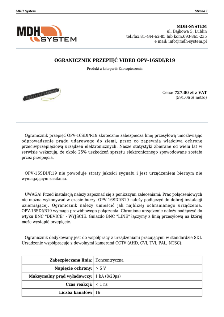 MDH System Strona 1 MDH-SYSTEM ul. Bajkowa 5, Lublin tel./fax.81-444-62-85 lub kom.693-865-235 e mail: [email protected] OGRANICZNIK PRZEPIĘĆ VIDEO OPV-16SDI/R19 Produkt z kategorii: Zabezpieczenia Cena: 727.00 zł z VAT (591.06 zł netto) Ogranicznik przepięć OPV-16SDI/R19 skutecznie zabezpiecza linię przesyłową umożliwiając odprowadzenie prądu udarowego do ziemi, przez co zapewnia właściwą ochronę przeciwprzepięciową urządzeń elektronicznych. Nasze statystyki zbierane od wielu lat w serwisie wskazują, że około 25% uszkodzeń sprzętu elektronicznego spowodowane zostało przez przepięcia. OPV-16SDI/R19 nie powoduje straty jakości sygnału i jest urządzeniem biernym nie wymagającym zasilania. UWAGA! Przed instalacją należy zapoznać się z poniższymi zaleceniami: Prac połączeniowych nie można wykonywać w czasie burzy. OPV-16SDI/R19 należy podłączyć do dobrej instalacji uziemiającej. Ogranicznik należy umieścić jak najbliżej ochranianego urządzenia. OPV-16SDI/R19 wymaga prawidłowego połączenia. Chronione urządzenie należy podłączyć do wtyku BNC "DEVICE" - WYJŚCIE. Gniazdo BNC "LINE" łączymy z linią przesyłową na której może wystąpić przepięcie. Ogranicznik dedykowany jest do współpracy z urządzeniami pracującymi w standardzie SDI. Urządzenie współpracuje z dowolnymi kamerami CCTV (AHD, CVI, TVI, PAL, NTSC). Zabezpieczana linia: Koncentryczna Napięcie ochrony: > 5 V Maksymalny prąd wyładowczy: 1 kA (8/20µs) Czas reakcji: < 1 ns Liczba kanałów: 16 MDH System Strona 2 Prędkość transmisji: 1.485 Gb/s HD-SDI SMPTE-292M Tłumienie przelotowe: 1.1 dB Uziemienie: Pośrednie, przez wyprowadzony przewód Typ złącza wejścia: 16 x Gniazdo BNC Typ złącza wyjścia: 16 x Gniazdo BNC Długość przewodu 0.5 m uziemiającego: • kamery HD-SDI, AHD, CVI, TVI, PAL/NTSC • Rejestratory HD-SDI, AHD, CVI, TVI, PAL/NTSC Zastosowanie: • monitory • CCTV • CATV Temperatura pracy: - 20 °C ... 55 °C Dopuszczalna względna < 95 % wilgotność otoczenia: Waga: 0.425 kg Wymiary: 483 x 44 x 37 mm Rack 19", 1U Panel przedni: Widok z tyłu: Widok z góry: Sposób działania: 1) Przepięcie 2) Kabel koncentryczny 3) ogranicznik przepięć 4) odgromnik gazowy 5) bloker prądu przepięcia 6) dioda zabezpieczająca 7) Uziemienie 8) Chronione urządzenia MDH System Strona 3 Schemat połączeniowy: 1) Kamera 2) Kabel koncentryczny 3) Przepięcie 4) Uziemienie 5) Monitor Aby w pełni zabezpieczyć wszystkie urządzenia podłączone do linii przed skutkami przepięć należy zastosować poniższy schemat: 1) Kamera 2) Kabel koncentryczny 3) Przepięcie 4) Uziemienie 5) Monitor Zapraszamy do naszego sklepu internetowego www.mdh-system.pl Dokument wygenerowany 2017-03-03 o godzinie 00:24