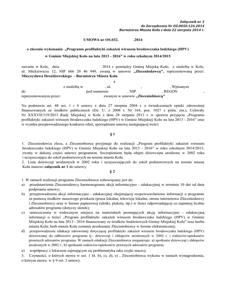 Załącznik nr 3 do Zarządzenia Nr OZ.0050.126.2014 Burmistrza Miasta Koła z dnia 22 sierpnia 2014 r. UMOWA nr OS.032. .2014 o zlecenie wykonania „Programu profilaktyki zakażeń wirusem brodawczaka ludzkiego (HPV) w Gminie Miejskiej Koło na lata 2013 - 2016” w roku szkolnym 2014/2015 zawarta w Kole, dnia 2014 r. pomiędzy Gminą Miejską Koło, z siedzibą w Kole, ul. Mickiewicza 12, NIP 666 20 46 949, zwaną w umowie „Zleceniodawcą", reprezentowaną przez: Mieczysława Drożdżewskiego - Burmistrza Miasta Koła a z siedzibą w , ul. , , Wpisanym do pod numerem , NIP , REGON , reprezentowanym przez: zwanym w umowie „Zleceniobiorcą" Na podstawie art. 48 ust. 1 i 4 ustawy z dnia 27 sierpnia 2004 r. o świadczeniach opieki zdrowotnej finansowanych ze środków publicznych (Dz. U. z 2008 r. Nr 164, poz. 1027 z późn. zm.), Uchwały Nr XXXVII/319/2013 Rady Miejskiej w Kole z dnia 28 sierpnia 2013 r. w sprawie przyjęcia „Programu profilaktyki zakażeń wirusem brodawczaka ludzkiego (HPV) w Gminie Miejskiej Koło na lata 2013 - 2016” oraz w wyniku przeprowadzonego konkursu ofert, sporządzono umowę następującej treści: §1 1. Zleceniodawca zleca, a Zleceniobiorca przyjmuje do realizacji „Program profilaktyki zakażeń wirusem brodawczaka ludzkiego (HPV) w Gminie Miejskiej Koło na lata 2013 - 2016” w roku szkolnym 2014/2015, zwany w dalszej części umowy programem. Szczepieniem będą objęte dziewczęta urodzone w 2002 roku i uczęszczające do szkół podstawowych na terenie miasta Koła. 2. Lista dziewcząt urodzonych w 2002 roku i uczęszczających do szkół podstawowych na terenie miasta Koła stanowi załącznik nr 1 do umowy. §2 1. W ramach realizacji programu Zleceniobiorca zobowiązany jest do: a) przedstawienia Zleceniodawcy harmonogramu akcji informacyjno - edukacyjnej w terminie 10 dni od dnia podpisania umowy; b) przeprowadzenia akcji informacyjno - edukacyjnej obejmującej rozpowszechnienie informacji o programie za pomocą środków masowego przekazu (prasa lokalna, telewizja lokalna, strona internetowa Zleceniodawcy i Zleceniobiorcy oraz w formie papierowej (ulotki, plakaty, itp.) w ilości odpowiadającej co najmniej liczbie adresatów programu (dotyczy ulotek); c) umieszczenia w widocznym miejscu na materiałach promujących akcję informacyjno - edukacyjną informacji o treści „Program profilaktyki zakażeń wirusem brodawczaka ludzkiego (HPV) w Gminie Miejskiej Koło na lata 2013 - 2016 finansowany ze środków budżetowych Gminy Miejskiej Koło" oraz herbu miasta Koła; herb miasta Koła zostanie przekazany Zleceniobiorcy w formie elektronicznej; d) przeprowadzenia edukacji zdrowotnej dotyczącej profilaktyki zakażeń wirusem brodawczaka ludzkiego (HPV) skierowanej do odbiorców programu tj.: dziewcząt i chłopców urodzonych w 2002 r. i rodziców/opiekunów prawnych adresatów programu. W ramach edukacji Zleceniobiorca zorganizuje: a) spotkanie dziewcząt i chłopców urodzonych w 2002 r., b) spotkanie rodziców/opiekunów prawnych adresatów programu; e) współpracy z lekarzem zajmującym się problematyką raka szyjki macicy. 3. Czynności, o których mowa w ust. 1 lit. b), c), d), e) , Zleceniobiorca wykona w ramach wynagrodzenia, o którym mowa w § 9 ust. 3 umowy. §3 1. W celu przeprowadzenia szczepień Zleceniobiorca zobowiązany jest do: a) dostarczenia Zleceniodawcy harmonogramu realizacji szczepień w terminie do 15 dni od podpisania umowy, harmonogram podlega zatwierdzeniu przez Zleceniodawcę; b) uzyskania pisemnej zgody od rodzica lub opiekuna prawnego dziecka na wykonanie cyklu szczepień obejmującego 3 dawki, na formularzach przesłanych przez Zleceniodawcę do rodziców /opiekunów prawnych, dotyczących wyrażenia zgody na zaszczepienie; c) przeprowadzenia badania lekarskiego kwalifikującego do szczepienia przed każdą dawką szczepienia; d) wykonania szczepienia obejmującego 3 dawki podane w odstępach czasowych zalecanych przez producenta szczepionki; w przypadku niezaszczepienia z powodów zdrowotnych dziewcząt Zleceniobiorca w porozumieniu ze Zleceniodawcą ustali dodatkowy termin szczepienia poszczególnej dawki; e) wpisu o szczepieniu do wymaganej dokumentacji medycznej (książeczka zdrowia, karta szczepień); wydania stosownego zaświadczenia osobie zaszczepionej po podaniu każdej kolejnej dawki szczepionki; pisemnego powiadomienia o fakcie szczepienia lekarzy rodzinnych właściwych dla zaszczepionych dziewczynek w terminie 14 dni od daty przeprowadzenia szczepienia ostatniego z serii; ustalenie lekarza rodzinnego dla osoby szczepionej należy do zadań Zleceniobiorcy; f) udostępnienia przynajmniej jednej linii telefonicznej przeznaczonej do udzielania informacji odnośnie szczepień; g) zutylizowania materiałów i sprzętu medycznego na swój koszt zgodnie z obowiązującymi przepisami. 2. Czynności, o których mowa w ust. 1 lit. b), c), d), e) Zleceniobiorca wykona w ramach wynagrodzenia, o którym mowa w § 9 ust. 3 umowy. 3. W razie potrzeby zatrudnienia podwykonawców obowiązek doboru podwykonawców należy do Zleceniobiorcy. §4 Przy realizacji programu Zleceniobiorca zobowiązany jest do zachowania praw pacjenta, należytej staranności, zgodnej ze wskazaniami aktualnej wiedzy medycznej i zasadami etyki zawodowej, zapewnienia sprzętu medycznego i urządzeń niezbędnych do realizacji programu, spełniających normy prawne. §5 Zleceniodawca zobowiązuje się do: a) wysłania imiennych zaproszeń na szczepienia przeciwko zakażeniom wirusem brodawczaka ludzkiego (HPV) do rodziców/ opiekunów prawnych dziewczynek urodzonych w 2002 r. oraz formularza dotyczącego wyrażenia zgody rodziców/ opiekunów prawnych na zaszczepienie dziecka; b) udostępnienia sali na spotkanie inauguracyjne oraz inne spotkania organizowane przez Zleceniobiorcę w ramach programu, po wcześniejszym uzgodnieniu terminu pomiędzy stronami; c) powiadomienia Państwowego Powiatowego Inspektora Sanitarnego o rozstrzygnięci