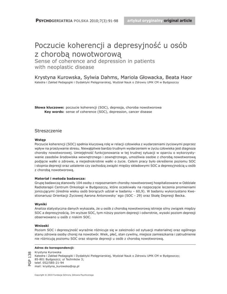 PSYCHOGERIATRIA POLSKA 2010;7(3):91-98 artykuł oryginalny original article Poczucie koherencji a depresyjność u osób z chorobą nowotworową Sense of coherence and depression in patients with neoplastic disease Krystyna Kurowska, Sylwia Dahms, Mariola Głowacka, Beata Haor Katedra i Zakład Pedagogiki i Dydaktyki Pielęgniarskiej, Wydział Nauk o Zdrowiu UMK CM w Bydgoszczy Słowa kluczowe: poczucie koherencji (SOC), depresja, choroba nowotworowa Key words: sense of coherence (SOC), depression, cancer disease Streszczenie Wstęp Poczucie koherencji (SOC) spełnia kluczową rolę w relacji człowieka z wydarzeniami życiowymi poprzez wpływ na przeżywanie stresu. Niewątpliwie bardzo trudnym wydarzeniem w życiu człowieka jest diagnoza choroby nowotworowej. Umiejętność funkcjonowania w tej trudnej sytuacji w oparciu o wykorzystywanie zasobów środowiska wewnętrznego i zewnętrznego, umożliwia osobie z chorobą nowotworową podjęcie walki o zdrowie, a niejednokrotnie walki o życie. Celem pracy było określenie poziomu SOC i stopnia depresji oraz ustalenie czy zachodzą związki między składowymi SOC a depresyjnością u osób z chorobą nowotworową. Materiał i metoda badawcza: Grupę badawczą stanowiły 104 osoby z rozpoznaniem choroby nowotworowej hospitalizowane w Oddziale Radioterapii Centrum Onkologii w Bydgoszczy, które oczekiwały na rozpoczęcie leczenia promieniami jonizującymi (średnia wieku osób biorących udział w badaniu – 60,9). W badaniu wykorzystano Kwestionariusz Orientacji Życiowej Aarona Antonowsky`ego (SOC - 29) oraz Skalę Depresji Becka. Wyniki Analiza statystyczna danych wykazała, że u osób z chorobą nowotworową istnieje silny związek między SOC a depresyjnością. Im wyższe SOC, tym niższy poziom depresji i odwrotnie, wysoki poziom depresji obserwowano u osób z niskim SOC. Wnioski Poziom SOC i depresyjność wyraźnie różnicuje się w zależności od sytuacji materialnej oraz ogólnego stanu zdrowia osoby chorej na nowotwór. Wiek, płeć, stan cywilny, miejsce zamieszkania i zatrudnienie nie różnicują poziomu SOC oraz stopnia depresji u osób z chorobą nowotworową. PGP 138 Adres do korespondencji: Krystyna Kurowska Katedra i Zakład Pedagogiki i Dydaktyki Pielęgniarskiej, Wydział Nauk o Zdrowiu UMK CM w Bydgoszczy; 85-801 Bydgoszcz; ul Techników 3; telef. 052/585-21-94 mail: [email protected] Copyright © 2010 Fundacja Ochrony Zdrowia Psychicznego 92 Krystyna Kurowska i wsp.: Poczucie koherencji a depresyjność u osób z chorobą nowotworową Abstract Introduction The sense of coherence (SOC) influences people’s abilities to manage stressful life events. Undoubtedly, diagnosis of neoplastic disease is a very stressful event. Ability to function in a difficult situation based on resources of external and internal environment enables patients with neoplastic disease to fight for health and even life. The aim of the study was to assess the level of SOC and degree of depression and find relationships between SOC components and depression in patients with neoplastic disease. Material and method The study included 104 patients with neoplastic disease, hospitalised on the radiotherapy ward in the Oncological Centre, Bydgoszcz, who were scheduled for radiotherapy treatment (mean age of the patients – 60.9). Antonovsky’s life orientation questionnaire (SOC-29) and BDI were used in the study. Results Statistical analysis of the data shows that there is a strong relationship in patients with neoplastic disease between SOC and depression. Patients with high SOC level were less depressed than patients with low SOC level Conclusions The SOC level and depression are influenced by the financial situation and general condition of the patient with neoplastic disease. Age, gender, marital status, address and employment do not differentiate the SOC level or degree of depression in these patients. Wstęp Dla większości współczesnego społeczeństwa choroba jest zjawiskiem, które można uznać za nieuniknione, jednakże to jej ciężkość ma istotny wpływ na zachowanie się człowieka i jego otoczenia. Uniemożliwia ona zaspokojenie licznych potrzeb życiowych, nie pozwala cieszyć się życiem. Możliwość samoakceptacji i kierowania swoim życiem sprawia, że osoba chora może adoptować się do zmieniających się warunków życia, w tym także do choroby - poprzez mobilizację własnych sił i dostępnych zasobów. Ważnym elementem w momencie pojawienia się choroby są osoby z najbliższego otoczenia chorego, które tworzą fizyczną przestrzeń i warunki sprzyjające sytuacji chorowania, mogą one również wywrzeć istotny wpływ na przebieg choroby. Niejednokrotnie pojawiają się takie sytuacje, w których ciężko pogodzić się z chorobą, niepełnosprawnością, czy też nieuniknioną śmiercią. Z takimi sytuacjami spotykamy się szczególnie w przypadku rozpoznania choroby nowotworowej. Na nowotwór złośliwy zachoruje w ciągu swego życia, co czwarty Polak, a co piąty z tego powodu umrze (tak kształtują się dane statystyczne). Dane te również mówią nam, że na nowotwór chorują wszyscy, niezależnie od rasy, płci, wieku, pochodzenia, sytuacji materialnej [1]. Badania ostatnich lat dostarczają nam dowodów przemawiających za związkiem ważnych wydarzeń życiowych, a wystąpieniem chorób lub też istotnych zaburzeń w fizycznym i psychicznym stanie zdrowia człowieka [2]. Rozpoznanie choroby nowotworowej stawia człowieka w sytuacji niepożądanego życiowego doświadczenia. Słowo „nowotwór” wzbudza różne reakcje, każdy chory reaguje inaczej, indywidualnie. Osoby te jednak łączy coś wspólnego, a mianowicie niepokój, lęk, strach, walka o każdy dzień, o życie. Związany z tą sytuacja stres powoduje, że ta walka u każdego człowieka chorego na nowotwór jest inna, dłuższa bądź też niezwykle krótka. Celem niniejszej pracy było określenie poziomu poczucia koherencji (SOC)