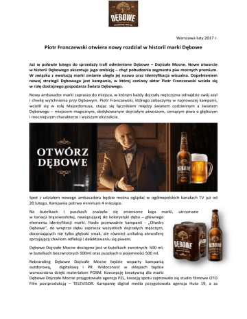 Warszawa luty 2017 r. Piotr Fronczewski otwiera nowy rozdział w historii marki Dębowe Już w połowie lutego do sprzedaży trafi odmienione Dębowe – Dojrzałe Mocne. Nowe otwarcie w historii Dębowego akcentuje jego ambicję – chęć pobudzenia segmentu piw mocnych premium. W związku z ewolucją marki zmianie uległa jej nazwa oraz identyfikacja wizualna. Dopełnieniem nowej strategii Dębowego jest kampania, w której ceniony aktor Piotr Fronczewski wciela się w rolę dostojnego gospodarza Świata Dębowego. Nowy ambasador marki zaprasza do miejsca, w którym każdy dojrzały mężczyzna odnajdzie swój azyl i chwilę wytchnienia przy Dębowym. Piotr Fronczewski, którego zobaczymy w najnowszej kampanii, wcielił się w rolę Majordomusa, stając się łącznikiem między światem codziennym a światem Dębowego – miejscem magicznym, dedykowanym dojrzałym piwoszom, ceniącym piwo o głębszym i mocniejszym charakterze i wyższym ekstrakcie. Spot z udziałem nowego ambasadora będzie można oglądać w ogólnopolskich kanałach TV już od 20 lutego. Kampania potrwa minimum 4 miesiące. Na butelkach i puszkach znalazło się zmienione logo marki, w tonacji brązowozłotej, nawiązującej do kolorystyki dębu – głównego elementu identyfikacji marki. Hasło przewodnie kampanii - „Otwórz Dębowe”, do wnętrza dębu zaprasza wszystkich dojrzałych mężczyzn, doceniających nie tylko głęboki smak, ale również unikalną atmosferę sprzyjającą chwilom refleksji i delektowaniu się piwem. utrzymane Dębowe Dojrzałe Mocne dostępne jest w butelkach zwrotnych: 500 ml, w butelkach bezzwrotnych 500ml oraz puszkach o pojemności 500 ml. Rebranding Dębowe Dojrzałe Mocne będzie wsparty kampanią outdorową, digitalową i PR. Widoczność w sklepach będzie wzmocniona dzięki materiałom POSM. Koncepcję kreatywną dla marki Dębowe Dojrzałe Mocne przygotowała agencja PZL, kreacją spotu zajmowało się studio filmowe OTO Film postprodukcją – TELEVISOR. Kampanię digital media przygotowała agencja Huta 19, a za kampanię w social mediach oraz PR odpowiada Tailor Made PR. Za zakup mediów odpowiada Zenith Optimedia. Design opakowań zaprojektował Mango Design. Link do spotu na FB: https://www.facebook.com/piwodebowe/videos/ Link do FB: https://www.facebook.com/piwodebowe/ Więcej informacji udzielą: Joanna Kwiatkowska kierownik ds. public relations Corporate Affairs Kompania Piwowarska Mail: [email protected] Kom. +48 695 797 890 Konrad Kapłoński Tailor Made PR Mail: [email protected] Kom.: +48 534 760 676 ******* Kompania Piwowarska skupia trzy browary o wieloletniej historii: Tyskie Browary Książęce (rok założenia - 1629), Browar Dojlidy w Białymstoku (1768) i Lech Browary Wielkopolski w Poznaniu (1895). To w nich warzymy najchętniej wybierane przez Polaków piwa, między innymi: Żubra, Tyskie, Lecha, Dębowe, Redd'sa oraz kolekcję specjalności Książęcego. Sprawdzone receptury, naturalne składniki, nieskazitelna czystość w naszych browarach a przede wszystkim umiejętności doświadczonych piwowarów - to wszystko sprawia, że warzone przez nas piwa są cenione w Polsce i za granicą. Jako firma odpowiedzialna społecznie troszczymy się o ludzi i środowisko wokół nas. Realizując strategię „Postaw na piwo” promujemy odpowiedzialność i umiarkowanie w spożywaniu alkoholu, szkolimy sprzedawców, oszczędzamy wodę i energię, wspieramy rozwój naszych partnerów biznesowych i angażujemy się w wolontariat. Mamy zaszczyt być sponsorem wielu lokalnych drużyn.