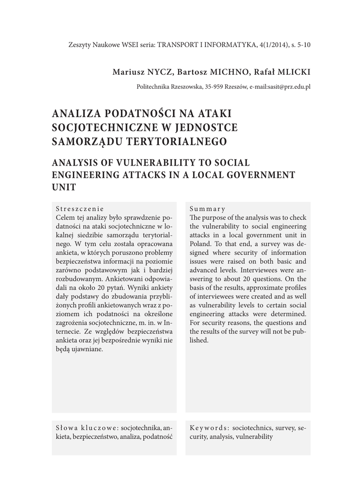 Zeszyty Naukowe WSEI seria: TRANSPORT I INFORMATYKA, 4(1/2014), s. 5-10 Mariusz NYCZ, Bartosz MICHNO, Rafał MLICKI Politechnika Rzeszowska, 35-959 Rzeszów, e-mail:[email protected] ANALIZA PODATNOŚCI NA ATAKI SOCJOTECHNICZNE W JEDNOSTCE SAMORZĄDU TERYTORIALNEGO ANALYSIS OF VULNERABILITY TO SOCIAL ENGINEERING ATTACKS IN A LOCAL GOVERNMENT UNIT Streszczenie Celem tej analizy było sprawdzenie podatności na ataki socjotechniczne w lokalnej siedzibie samorządu terytorialnego. W tym celu została opracowana ankieta, w których poruszono problemy bezpieczeństwa informacji na poziomie zarówno podstawowym jak i bardziej rozbudowanym. Ankietowani odpowiadali na około 20 pytań. Wyniki ankiety dały podstawy do zbudowania przybliżonych profili ankietowanych wraz z poziomem ich podatności na określone zagrożenia socjotechniczne, m. in. w Internecie. Ze względów bezpieczeństwa ankieta oraz jej bezpośrednie wyniki nie będą ujawniane. Summar y The purpose of the analysis was to check the vulnerability to social engineering attacks in a local government unit in Poland. To that end, a survey was designed where security of information issues were raised on both basic and advanced levels. Interviewees were answering to about 20 questions. On the basis of the results, approximate profiles of interviewees were created and as well as vulnerability levels to certain social engineering attacks were determined. For security reasons, the questions and the results of the survey will not be published. S ł o w a k l u c z o w e : socjotechnika, ankieta, bezpieczeństwo, analiza, podatność K e y w o r d s : sociotechnics, survey, security, analysis, vulnerability Zeszyty Naukowe WSEI seria: TRANSPORT I INFORMATYKA, 4(1/2014) 6 Mariusz Nycz, Bartosz Michno, Rafał Mlicki, Analiza podatności na ataki... 1 . Wp r o w a d z e n i e Socjotechnika jest opisywana jako kategoria ataków, w której atakujący manipuluje innych w celu uzyskania prywatnych i istotnych informacji. Definicja ta obejmuje jedno z najszerszych zagadnień socjotechniki, ale nie jest kompletna. Socjotechnika to nie tylko manipulacja ludźmi, ale także nieautoryzowany dostęp do przedmiotów fizycznych i używanie w sposób niedozwolony publicznie dostępnych informacji. Na przykład, zbieranie numerów telefonów i list mailingowych w celu szkodliwej działalności jest również uważane za socjotechnikę. W socjotechnice występuje wiele różnych typów ataków. W zależności od potrzeb typy ataków mogą być wymyślane, ulepszane bądź też łączone ze sobą. Jednak większość z nich bazuje na znanych popularnych typach. Oto niektóre z nich: t kradzież urządzeń mobilnych Najstarszy typ ataku. W czasach, gdy urządzenia przenośne nabierają coraz większego znaczenia i stają się co raz bardziej popularne, ten typ ataku okazuje się być jednym z najbardziej skutecznych. Prawdopodobieństwo sukcesu rośnie w firmach / instytucjach, gdzie wdrożona jest polityka BYOD. t shoulder-surfing Jest to najprostszy typ ataku. Atakujący stara się monitorować fizyczną aktywność użytkownika i jego urządzenia. Atakujący może monitorować ekran, klawiaturę lub ruchy rąk w celu przechwycenia prywatnych informacji. t monitorowanie sieci Monitorowanie sieci może ukazać typy usług najczęściej używane przez użytkowników. Poprzez ich identyfikację atakujący może rozpocząć rekonesans zabezpieczeń danej usługi i przeprowadzić ewentualny atak. t digital dumpster diving Co raz krótszy czas życia urządzeń elektronicznych z racji postępującego rozwoju technologii sprawia, że przestarzałe urządzenia w składowiskach np. elektrośmieci mogą mieć pozostawione w swojej pamięci prywatne i poufne dane. t phishing Przeważnie związany z fałszywymi stronami oraz wiadomościami e-mail. W przypadku fałszywych wiadomości e-mail atakujący używa nieprawdziwej tożsamości internetowej w celu oszukania odbiorcy [1]. 2. Ankieta Ankieta została umieszczona na specjalnej witrynie przeznaczonej do ankietowania użytkowników. Znajdowała się ona pod prywatnym linkiem URL, niedostępnym z poziomu publicznego dla wyszukiwarek i użytkowników nieznających pełnego adresu. Zeszyty Naukowe WSEI seria: TRANSPORT I INFORMATYKA, 4(1/2014) Mariusz Nycz, Bartosz Michno, Rafał Mlicki, Analiza podatności na ataki... 7 Ankietowani odpowiadali na ponad 20 pytań. Niektóre z ich miały charakter pouczający, sugerujący prawidłową odpowiedź. Pytania te były nieliczne i znajdowały się na końcu ankiety. W zamyśle autorów ankieta miała oprócz weryfikacji wiedzy użytkowników uzupełnianie jej. Pytania wstępne zawierały podstawowy zestaw typowej ankiety dotyczącej tematów informatycznych. Pytano w niej o system operacyjny oraz rodzaj używanej przeglądarki internetowej. Ankieta była całkowicie anonimowa. 3. Analiza otrzymanych wyników Analiza opisuje kolejno metody oszustw socjotechnicznych stosowanych w ankiecie. Na jej podstawie obliczono prawdopodobieństwo skuteczności danej metody. Są one posortowane malejąco według prawdopodobieństwa skuteczności. Nie wszystkie z nich są czysto socjotechniczne, ale przenoszone są z wykorzystaniem ataków socjotechnicznych. W takich przypadkach socjotechnika jest dopiero pierwszym etapem przeprowadzania ataku, a właściwe wykorzystywanie luk bezpieczeństwa występuje jako faza druga. 3.1. Java Z przeprowadzonej analizy wynika, że najwięcej użytkowników może być narażonych na ataki związane ze środowiskiem programistycznym Java. Java jest bardzo popularnym oprogramowaniem wśród internautów – często wymagana jest do poprawnego wyświetlania stron internetowych. W przeglądarkach internetowych Java występuje pod postacią wtyczek włączanych na żądanie. W nowszych wersjach przeglądarek wtyczki te wyłączane są automatycznie. Jedna z nich, Mozilla Firefox, informuje użytkownika o niebezpieczeństwie związanym z użytkowaniem Javy. Z pr