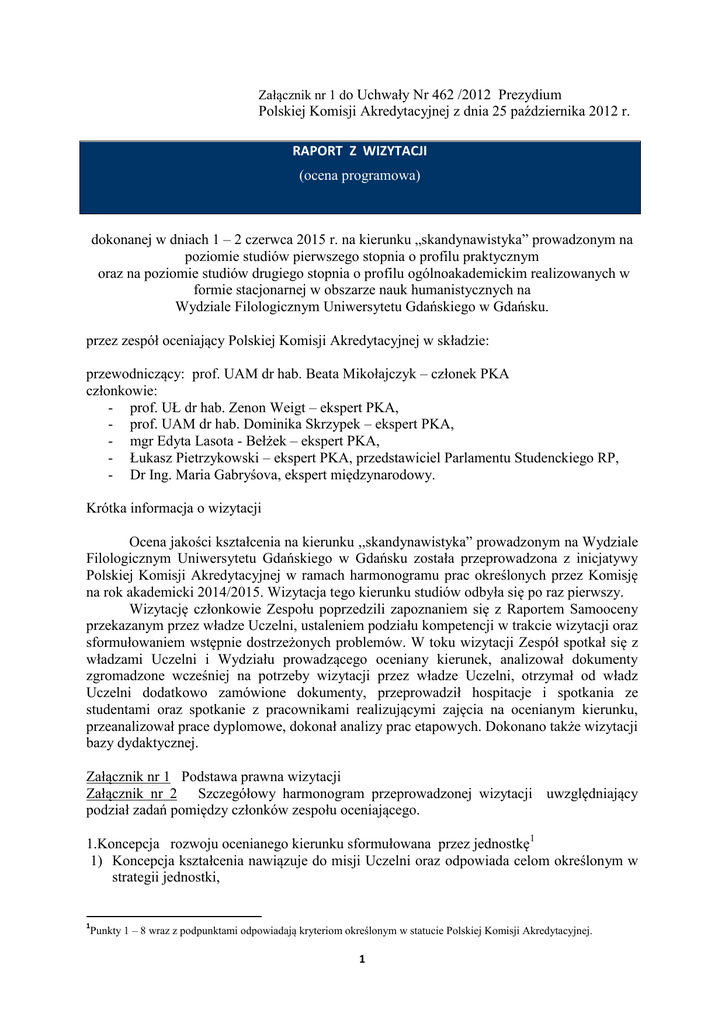 Załącznik nr 1 do Uchwały Nr 462 /2012 Prezydium Polskiej Komisji Akredytacyjnej z dnia 25 października 2012 r. RAPORT Z WIZYTACJI (ocena programowa) dokonanej w dniach 1 – 2 czerwca 2015 r. na kierunku „skandynawistyka” prowadzonym na poziomie studiów pierwszego stopnia o profilu praktycznym oraz na poziomie studiów drugiego stopnia o profilu ogólnoakademickim realizowanych w formie stacjonarnej w obszarze nauk humanistycznych na Wydziale Filologicznym Uniwersytetu Gdańskiego w Gdańsku. przez zespół oceniający Polskiej Komisji Akredytacyjnej w składzie: przewodniczący: prof. UAM dr hab. Beata Mikołajczyk – członek PKA członkowie: - prof. UŁ dr hab. Zenon Weigt – ekspert PKA, - prof. UAM dr hab. Dominika Skrzypek – ekspert PKA, - mgr Edyta Lasota - Bełżek – ekspert PKA, - Łukasz Pietrzykowski – ekspert PKA, przedstawiciel Parlamentu Studenckiego RP, - Dr Ing. Maria Gabryśova, ekspert międzynarodowy. Krótka informacja o wizytacji Ocena jakości kształcenia na kierunku ,,skandynawistyka” prowadzonym na Wydziale Filologicznym Uniwersytetu Gdańskiego w Gdańsku została przeprowadzona z inicjatywy Polskiej Komisji Akredytacyjnej w ramach harmonogramu prac określonych przez Komisję na rok akademicki 2014/2015. Wizytacja tego kierunku studiów odbyła się po raz pierwszy. Wizytację członkowie Zespołu poprzedzili zapoznaniem się z Raportem Samooceny przekazanym przez władze Uczelni, ustaleniem podziału kompetencji w trakcie wizytacji oraz sformułowaniem wstępnie dostrzeżonych problemów. W toku wizytacji Zespół spotkał się z władzami Uczelni i Wydziału prowadzącego oceniany kierunek, analizował dokumenty zgromadzone wcześniej na potrzeby wizytacji przez władze Uczelni, otrzymał od władz Uczelni dodatkowo zamówione dokumenty, przeprowadził hospitacje i spotkania ze studentami oraz spotkanie z pracownikami realizującymi zajęcia na ocenianym kierunku, przeanalizował prace dyplomowe, dokonał analizy prac etapowych. Dokonano także wizytacji bazy dydaktycznej. Załącznik nr 1 Podstawa prawna wizytacji Załącznik nr 2 Szczegółowy harmonogram przeprowadzonej wizytacji uwzględniający podział zadań pomiędzy członków zespołu oceniającego. 1.Koncepcja rozwoju ocenianego kierunku sformułowana przez jednostkę1 1) Koncepcja kształcenia nawiązuje do misji Uczelni oraz odpowiada celom określonym w strategii jednostki, 1 Punkty 1 – 8 wraz z podpunktami odpowiadają kryteriom określonym w statucie Polskiej Komisji Akredytacyjnej. 1 Obecne brzmienie misji i strategii zostało ustalone Uchwałą Senatu UG nr 25S/10 z dnia 25 lutego 2010 (z późn. zm.). Strategia ta została opracowana na czas do roku 2020. Kierunek skandynawistyka jest jednym z 9 kierunków prowadzonych na Wydziale Filologicznym Uniwersytetu Gdańskiego w Gdańsku. Kształcenie na kierunku skandynawistyka realizowane jest na poziomie studiów I stopnia o profilu praktycznym oraz na poziomie studiów II stopnia o profilu ogólnoakademickim i wpisuje się w misję Uczelni oraz strategię Wydziału, które są wzajemnie spójne, i które podkreślają, że misją Uczelni jest ‘kształcenie cenionych absolwentów wyposażonych we wszechstronną wiedzę, umiejętności i kompetencje niezbędne w życiu gospodarczo-społecznym opartym na wiedzy oraz wnoszenie trwałego wkładu w naukowe poznanie świata i rozwiązywanie jego istotnych współczesnych problemów’. Przyświecającą jej wizją ‘będzie tworzenie nowej jakości w kształceniu, badaniach naukowych i współpracy z otoczeniem. Kształcenie obejmie szerszy wachlarz kierunków wzbogaconych o nowe wartościowe i utylitarne treści programowe przekazywane innowacyjnymi metodami nauczania.’ Strategia Wydziału Filologicznego sformułowana na lata 2012-2016 nawiązuje do misji uczelni wskazując dodatkowo na cel jakim jest ‘Restrukturyzacja oferty kształcenia: dostosowywanie oferty kształcenia do potrzeb rynku przy wykorzystaniu możliwości kadrowych Wydziału; (..) zwiększenie oferty kierunków o profilu praktycznym’, a także ‘Podnoszenie poziomu kształcenia na wszystkich kierunkach studiów stacjonarnych, niestacjonarnych oraz studiach podyplomowych poprzez m.in. (..) nawiązanie efektywnej współpracy z pracodawcami w ramach tworzenia profilu praktycznego oraz organizowanie praktyk zawodowych’. Poprzez wprowadzenie studiów o profilu praktycznym na I stopniu Skandynawistyki, Wydział realizuje postulat zawarty w strategii w zakresie efektywnej współpracy z pracodawcami i przygotowuje się do bardziej wydajnej organizacji praktyk zawodowych. Podczas wizyty ZO PKA aspekt nawiązywania i podtrzymywania kontaktów ze środowiskiem zewnętrznym oraz transfer wiedzy do praktyki, eksponowane w misji Uczelni, znalazły potwierdzenie na poziomie Katedry Skandynawistyki. Istotnym celem UG jest rozwijanie wśród studentów zdolności do adaptacji na dynamicznie zmieniającym się rynku pracy w Gdańsku i w regionie, jak również w Polsce i w Unii Europejskiej. Kładzie się nacisk na uświadomienie studentom związków nauki z praktyką i na interdyscyplinarność kształcenia. Skandynawistyka nawiązuje do powyższych elementów misji Uczelni i strategii Wydziału przede wszystkim poprzez uwypuklanie w swoich programach kształcenia wymiaru praktycznego przekazywanej wiedzy i rozwijanych umiejętności (szczególnie na studiach I stopnia) a także poprzez interdyscyplinarność kształcenia i przekazywanie podstawowej wiedzy o charakterze uniwersalnym (szczególnie na studiach II stopnia). Wymiar praktyczny w koncepcji kształcenia znalazł odzwierciedlenie w ofercie dydaktycznej kierunku skandynawistyka, która na studiach I stopnia (profil praktyczny) obejmuje dwie specjalności: Komunikacja międzykulturowa oraz Media i społeczeństwo w krajach nordyckich, a na studiach II stopnia (profil ogólnoakademicki) specjalności Translatoryczną oraz Studia regionalne. Przekazywanie wied