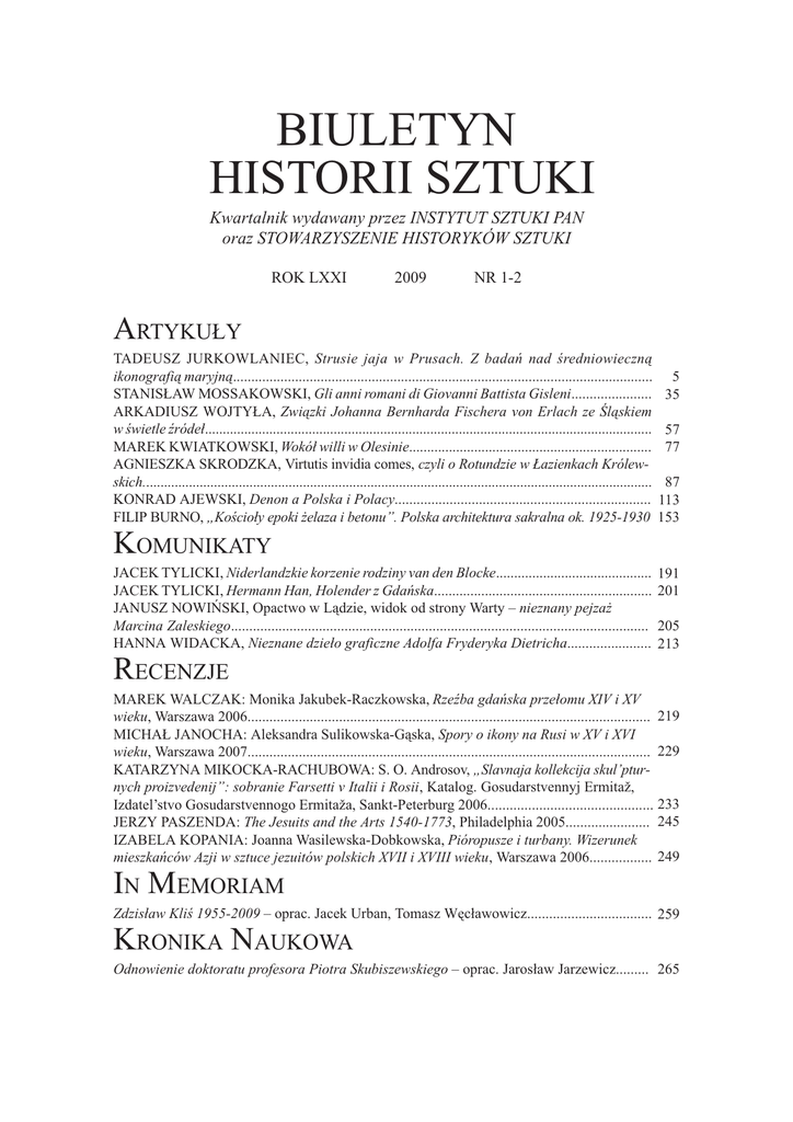 BIULETYN HISTORII SZTUKI Kwartalnik wydawany przez INSTYTUT SZTUKI PAN oraz STOWARZYSZENIE HISTORYKÓW SZTUKI ROK LXXI 2009 NR 1-2 ARTYKU£Y TADEUSZ JURKOWLANIEC, Strusie jaja w Prusach. Z badañ nad redniowieczn¹ ikonografi¹ maryjn¹................................................................................................................... STANIS£AW MOSSAKOWSKI, Gli anni romani di Giovanni Battista Gisleni...................... ARKADIUSZ WOJTY£A, Zwi¹zki Johanna Bernharda Fischera von Erlach ze l¹skiem w wietle róde³............................................................................................................................. MAREK KWIATKOWSKI, Wokó³ willi w Olesinie................................................................... AGNIESZKA SKRODZKA, Virtutis invidia comes, czyli o Rotundzie w £azienkach Królewskich............................................................................................................................................... KONRAD AJEWSKI, Denon a Polska i Polacy...................................................................... FILIP BURNO, Kocio³y epoki ¿elaza i betonu. Polska architektura sakralna ok. 1925-1930 KOMUNIKATY JACEK TYLICKI, Niderlandzkie korzenie rodziny van den Blocke........................................... JACEK TYLICKI, Hermann Han, Holender z Gdañska............................................................ JANUSZ NOWIÑSKI, Opactwo w L¹dzie, widok od strony Warty nieznany pejza¿ Marcina Zaleskiego.................................................................................................................. HANNA WIDACKA, Nieznane dzie³o graficzne Adolfa Fryderyka Dietricha....................... RECENZJE 5 35 57 77 87 113 153 191 201 205 213 MAREK WALCZAK: Monika Jakubek-Raczkowska, Rzeba gdañska prze³omu XIV i XV wieku, Warszawa 2006.............................................................................................................. 219 MICHA£ JANOCHA: Aleksandra Sulikowska-G¹ska, Spory o ikony na Rusi w XV i XVI wieku, Warszawa 2007.............................................................................................................. 229 KATARZYNA MIKOCKA-RACHUBOWA: S. O. Androsov, Slavnaja kollekcija skulpturnych proizvedenij: sobranie Farsetti v Italii i Rosii, Katalog. Gosudarstvennyj Ermita, Izdatelstvo Gosudarstvennogo Ermitaa, Sankt-Peterburg 2006............................................. 233 JERZY PASZENDA: The Jesuits and the Arts 1540-1773, Philadelphia 2005....................... 245 IZABELA KOPANIA: Joanna Wasilewska-Dobkowska, Pióropusze i turbany. Wizerunek mieszkañców Azji w sztuce jezuitów polskich XVII i XVIII wieku, Warszawa 2006................. 249 IN MEMORIAM Zdzis³aw Kli 1955-2009 oprac. Jacek Urban, Tomasz Wêc³awowicz.................................. 259 KRONIKA NAUKOWA Odnowienie doktoratu profesora Piotra Skubiszewskiego oprac. Jaros³aw Jarzewicz......... 265 BULLETIN OF ART HISTORY A quarterly published by the INSTITUTE OF ART HISTORY OF THE POLISH ACADEMY OF SCIENCES (IS-PAN) in conjunction with the ART HISTORIANS’ SOCIETY YEAR LXXI 2009 No. 1-2 ARTICLES TADEUSZ JURKOWLANIEC, Straußeneier in Preußen. Ein Beitrag zur Erforschung der mittelalterlichen Marienikonographie.......................................................................................... 5 STANIS£AW MOSSAKOWSKI, Gli anni romani di Giovanni Battista Gisleni....................... 35 ARKADIUSZ WOJTY£A, Johann Bernhard Fischer von Erlachs connections with Silesia in the light of recently examined sources....................................................................................... 57 MAREK KWIATKOWSKI, On the subject of the Villa at Olesin................................................... 77 AGNIESZKA SKRODZKA, Virtutis invidia comes, id est the Rotunda in the Royal Baths (£azienki) Palace............................................................................................................................ 87 KONRAD AJEWSKI, Denon, Poland and the Poles..................................................................... 113 FILIP BRUNO, Churches from the Age of Iron and Concrete: Polish sacral architecture from between ca. 1925 and 1930....................................................................................................... 153 SHORT ARTCLES JACEK TYLICKI, The Netherlandish Roots of van den Blocke.............................................. 191 JACEK TYLICKI, Hermann Han, A Dutchman from Danzig.................................................. 201 JANUSZ NOWIÑSKI, L¹d Abbey, seen from the River Warthe: the previously unknown painting by Marcin Zaleski........................................................................................................ 205 HANNA WIDACKA, Previously unknown work by the Warsaw etcher Adolf Fryderyk Dietrich 213 REVIEWS MAREK WALCZAK: Monika Jakubek-Raczkowska, Rzeba gdañska prze³omu XIV i XV wieku, Warszawa 2006.................................................................................................................. 219 MICHA£ JANOCHA, Aleksandra Sulikowska-G¹ska, Spory o ikony na Rusi w XV i XVI wieku, Warszawa 2007...................................................................................................................... 229 KATARZYNA MIKOCKA-RACHUBOWA: S. O. Androsov, Slavnaja kollekcija skulpturnych proizvedenij: sobranie Farsetti v Italii i Rosii. Katalog. Gosudarstvennyj Ermita, Izdatelstvo Gosudarstvennogo Ermitaa, Sankt-Peterburg 2006.................................................................... 233 JERZY PASZENDA, The Jesuits and the Arts 1540-1773, Philadelphia 2005............................. 245 IZABELA KOPANIA, Joanna Wasilewska-Dobkowska, Pióropusze i turbany. Wizerunek mieszkañców Azji w sztuce jezuitów polskich XVII i XVIII wieku, Warszawa 2006....................... 249 IN MEMORIAM Zdzis³aw Kli 1955-2009 prepared by Jacek Urban and Toma