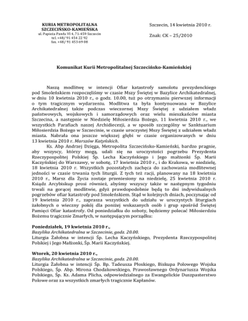 KURIA METROPOLITALNA SZCZECIŃSKO-KAMIEŃSKA ul. Papieża Pawła VI 4, 71-459 Szczecin tel. +48/ 91 454 22 92 fax. +48/ 91 453 69 08 Szczecin, 14 kwietnia 2010 r. Znak: CK – 25/2010 Komunikat Kurii Metropolitalnej Szczecińsko-Kamieńskiej Naszą modlitwę w intencji Ofiar katastrofy samolotu prezydenckiego pod Smoleńskiem rozpoczęliśmy w czasie Mszy Świętej w Bazylice Archikatedralnej, w dniu 10 kwietnia 2010 r., o godz. 10.00, tuż po otrzymaniu pierwszej informacji o tym tragicznym wydarzeniu. Modlitwa ta była kontynuowana w Bazylice Archikatedralnej także podczas wieczornej Mszy Świętej z udziałem władz państwowych, wojskowych i samorządowych oraz wielu mieszkańców miasta Szczecina, a następnie w Niedzielę Miłosierdzia Bożego, 11 kwietnia 2010 r., we wszystkich Parafiach naszej Archidiecezji, a w sposób szczególny w Sanktuarium Miłosierdzia Bożego w Szczecinie, w czasie uroczystej Mszy Świętej z udziałem władz miasta. Nabrała ona jeszcze większej głębi w czasie organizowanych w dniu 13 kwietnia 2010 r. Marszów Katyńskich. Ks. Abp Andrzej Dzięga, Metropolita Szczecińsko-Kamieński, bardzo pragnie, aby wszyscy, którzy mogą, udali się na uroczystości pogrzebu Prezydenta Rzeczypospolitej Polskiej Śp. Lecha Kaczyńskiego i Jego małżonki Śp. Marii Kaczyńskiej do Warszawy, w sobotę, 17 kwietnia 2010 r., i do Krakowa, w niedzielę, 18 kwietnia 2010 r. Wszystkich pozostałych zachęca do zachowania modlitewnej jedności w czasie trwania tych liturgii. Z tych też racji, planowany na 18 kwietnia 2010 r., Marsz dla Życia zostaje przeniesiony na niedzielę, 25 kwietnia 2010 r. Ksiądz Arcybiskup prosi również, abyśmy wszyscy także w następnym tygodniu trwali na gorącej modlitwie, gdyż prawdopodobnie będą to dni indywidualnych pogrzebów ofiar katastrofy pod Smoleńskiem. Stąd w kolejnych dniach, poczynając od 19 kwietnia 2010 r., zaprasza wszystkich do udziału w uroczystych liturgiach żałobnych o wieczny pokój dla poniżej wskazanych osób i grup spośród Świętej Pamięci Ofiar katastrofy. Od poniedziałku do soboty, będziemy polecać Miłosierdziu Bożemu tragicznie Zmarłych, w następującym porządku: Poniedziałek, 19 kwietnia 2010 r., Bazylika Archikatedralna w Szczecinie, godz. 20.00. Liturgia Żałobna w intencji Śp. Lecha Kaczyńskiego, Prezydenta Rzeczypospolitej Polskiej i Jego Małżonki, Śp. Marii Kaczyńskiej. Wtorek, 20 kwietnia 2010 r., Bazylika Archikatedralna w Szczecinie, godz. 20.00. Liturgia Żałobna w intencji Śp. Bp. Tadeusza Płoskiego, Biskupa Polowego Wojska Polskiego, Śp. Abp. Mirona Chodakowskiego, Prawosławnego Ordynariusza Wojska Polskiego, Śp. Ks. Adama Plicha, odpowiedzialnego za Ewangelickie Duszpasterstwo Polowe oraz za wszystkich zmarłych tragicznie Kapłanów. Środa, 21 kwietnia 2010 r., Bazylika Archikatedralna w Szczecinie, godz. 20.00. Liturgia Żałobna w intencji Śp. Sebastiana Karpiniuka, Posła naszego Regionu oraz wszystkich tragicznie zmarłych Parlamentarzystów, Ministrów, Generałów i innych Oficerów, Urzędników i Funkcjonariuszy Państwowych. Czwartek, 22 kwietnia 2010 r., Bazylika Archikatedralna w Szczecinie, godz. 20.00. Liturgia Żałobna w intencji Śp. Janusza Zakrzeńskiego, aktora teatralnego i filmowego, Śp. Ks. Prałata Prof. dr. hab. Ryszarda Rumianka, Rektora UKSW oraz Śp. Prof. dr. hab. Janusza Kurtyki, Prezesa Instytutu Pamięci Narodowej. Piątek, 23 kwietnia 2010 r., Uroczystość św. Wojciecha – Patrona Polski, Kościół Garnizonowy pw. św. Wojciecha w Szczecinie, godz. 20.00. Uroczysta Msza Święta w intencji Ojczyzny i wszystkich Ofiar Katynia. Sobota, 24 kwietnia 2010 r., Bazylika Archikatedralna w Szczecinie, godz. 20.00. Liturgia Żałobna w intencji Śp. Ryszarda Kaczorowskiego, ostatniego Prezydenta Rzeczypospolitej Polskiej na uchodźstwie i tragicznie zmarłych Osób ze Środowisk Katyńskich oraz pozostałych Ofiar katastrofy. Duch modlitwy za Ofiary katastrofy będzie również obecny w czasie niedzielnego Marszu dla Życia, w dniu 25 kwietnia 2010 r., który w tym roku, z powodu zaistniałych okoliczności, będzie miał jednocześnie charakter Marszu Pamięci. Ksiądz Arcybiskup prosi, by jego uczestnicy zgromadzili się na Jasnych Błoniach, pod pomnikiem Jana Pawła II, o godz. 15.00, na wspólnej modlitwie – Koronce do Miłosierdzia Bożego – i czuwaniu, a następnie o godz. 16.00 wyruszyli do Bazyliki Archikatedralnej pw. św. Jakuba Apostoła, gdzie o godz. 18.00 będzie celebrowana uroczysta Msza Święta pod Jego przewodnictwem, w intencji Ojczyzny i wszystkich Ofiar Katynia oraz o umiłowanie daru życia. Niezależnie od wyżej wskazanych liturgii, już od soboty, tj. 10 kwietnia 2010 r., codziennie przez 30 dni, w Bazylice Archikatedralnej są celebrowane Msze Święte Gregoriańskie w intencji Ofiar katastrofy. Po zakończeniu każdej z nich, wierni udają się procesyjnie do kaplicy Ofiar Katynia na modlitwę, w intencji tragicznie zmarłych. Ponadto, codziennie na godz. 21.00, dzwony wszystkich kościołów naszej Archidiecezji wzywają wiernych do modlitwy za Ofiary Katynia i za wszystkich poległych w obronie Ojczyzny oraz o wolność innych narodów. Niech ten czas trwania na modlitwie wszystkich nas zjednoczy i napełni chrześcijańską nadzieją, mogącą rozświetlić światłem Zmartwychwstałego Chrystusa mroki naszego cierpienia i smutku, oraz rozpali naszą miłość do Ojczyzny. Z Chrystusowym pozdrowieniem /-/ bp Marian Błażej Kruszyłowicz WIKARIUSZ GENERALNY /-/ ks. dr Andrzej Maćkowski KANCLERZ KURII