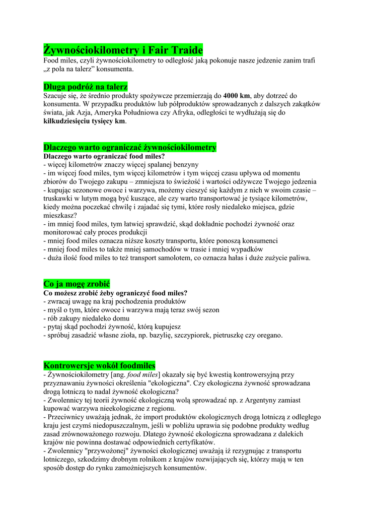 Żywnościokilometry i Fair Traide Food miles, czyli żywnościokilometry to odległość jaką pokonuje nasze jedzenie zanim trafi „z pola na talerz” konsumenta. Długa podróż na talerz Szacuje się, że średnio produkty spożywcze przemierzają do 4000 km, aby dotrzeć do konsumenta. W przypadku produktów lub półproduktów sprowadzanych z dalszych zakątków świata, jak Azja, Ameryka Południowa czy Afryka, odległości te wydłużają się do kilkudziesięciu tysięcy km. Dlaczego warto ograniczać żywnościokilometry Dlaczego warto ograniczać food miles? - więcej kilometrów znaczy więcej spalanej benzyny - im więcej food miles, tym więcej kilometrów i tym więcej czasu upływa od momentu zbiorów do Twojego zakupu – zmniejsza to świeżość i wartości odżywcze Twojego jedzenia - kupując sezonowe owoce i warzywa, możemy cieszyć się każdym z nich w swoim czasie – truskawki w lutym mogą być kuszące, ale czy warto transportować je tysiące kilometrów, kiedy można poczekać chwilę i zajadać się tymi, które rosły niedaleko miejsca, gdzie mieszkasz? - im mniej food miles, tym łatwiej sprawdzić, skąd dokładnie pochodzi żywność oraz monitorować cały proces produkcji - mniej food miles oznacza niższe koszty transportu, które ponoszą konsumenci - mniej food miles to także mniej samochodów w trasie i mniej wypadków - duża ilość food miles to też transport samolotem, co oznacza hałas i duże zużycie paliwa. Co ja mogę zrobić Co możesz zrobić żeby ograniczyć food miles? - zwracaj uwagę na kraj pochodzenia produktów - myśl o tym, które owoce i warzywa mają teraz swój sezon - rób zakupy niedaleko domu - pytaj skąd pochodzi żywność, którą kupujesz - spróbuj zasadzić własne zioła, np. bazylię, szczypiorek, pietruszkę czy oregano. Kontrowersje wokół foodmiles - Żywnościokilometry [ang. food miles] okazały się być kwestią kontrowersyjną przy przyznawaniu żywności określenia "ekologiczna". Czy ekologiczna żywność sprowadzana drogą lotniczą to nadal żywność ekologiczna? - Zwolennicy tej teorii żywność ekologiczną wolą sprowadzać np. z Argentyny zamiast kupować warzywa nieekologiczne z regionu. - Przeciwnicy uważają jednak, że import produktów ekologicznych drogą lotniczą z odległego kraju jest czymś niedopuszczalnym, jeśli w pobliżu uprawia się podobne produkty według zasad zrównoważonego rozwoju. Dlatego żywność ekologiczna sprowadzana z dalekich krajów nie powinna dostawać odpowiednich certyfikatów. - Zwolennicy "przywożonej" żywności ekologicznej uważają iż rezygnując z transportu lotniczego, szkodzimy drobnym rolnikom z krajów rozwijających się, którzy mają w ten sposób dostęp do rynku zamożniejszych konsumentów. Definicja Fair Trade Robiąc zakupy być może zdarzyło się wam natrafić na produkty z logo Fairtrade. Oznacza ono, że producent otrzymał za nie sprawiedliwą cenę, a towar podlegał kontroli jakości na każdym etapie produkcji. Kupując artykuły produkowane zgodnie z zasadami Fair Trade wspieramy ideę, która ma umożliwić godne funkcjonowanie oraz rozwój przedsiębiorstw z krajów Trzeciego Świata. Dla mieszkańców tych terenów jest to szansa na obniżenie bezrobocia, a także pracę w odpowiednich warunkach, za sprawiedliwą zapłatę. Jest to zarazem jeden z nurtów ekonomii społecznej, której naczelną zasadą jest uznanie, iż człowiek jest ważniejszy od zysku. Produkty Fair Trade Obecnie certyfikaty Fair Trade przyznawane są m.in. takim produktom jak: banany, cukier, bawełna, kawa, kakao, herbata, kwiaty, miód, orzechy, ryż, przyprawy, zioła, wino. Poza artykułami spożywczymi należą do nich rękodzieła, tj.: dywany, maty, kosze, ceramika, biżuteria, rzeźby, zabawki, sprzęt kuchenny, piłki sportowe, odzież. Niestety w Polsce certyfikowane produkty FT wciąż nie są zbyt popularne. Raport sporządzony przez Stowarzyszenie Konsumentów Polskich w 2010 r. donosi, że 77% badanych nie wie czym jest FT, ale 65 % popiera konieczność płacenia producentom sprawiedliwego wynagrodzenia. Z dokumentu wynika, że towary FT są u nas dostępne najczęściej. Znak Fair Trade Znak Organizacji Sprawiedliwego Handlu Znak dla produktów fair trade, obowiązujący na całym świecie Dawniej używany znak Fair Trade, obecnie nie stosowany, można go znaleźć na produktach w USA, Kanadzie i Japonii Znak obowiązujący w Szwajcarii i nadawany przez tamtejszą organizację Sprawiedliwego Handlu Niekiedy osobne oznaczenia stosowane są dla produktów niespożywczych, jak np. dywanów. Znak certyfikacyjny - Rugmark - jest używany dla dywanów orientalnych. Istnieje wielkie prawdopodobieństwo, że dywany, które nie mają tego znaku, zostały wyprodukowane przez dzieci w warunkach niewolniczych. Współczesne niewolnictwo Wydaje się, że niewolnictwo dawno przeszło do historii. Ale według szacunkowych danych na świecie jest dziś 27-30 milionów niewolników - dorosłych i dzieci, którzy są zmuszani do pracy wbrew swojej woli, przetrzymywani w zamknięciu, kontrolowani za pomocą psychicznego i fizycznego znęcania się, pracujący przez wiele godzin, często w nieludzkich warunkach, bez żadnej zapłaty. 60 do 65% ręcznie robionych dywanów z tego regionu, to dywany wyprodukowane przez niewolników. Dzieci pracują i śpią przy swoich krosnach, tkają dywany w słabym świetle, co często prowadzi do uszkodzenia wzroku, ich rany od ostrych noży nie są leczone, wdychają pył z wełny i zapadają na choroby układu oddechowego, jak pylica czy gruźlica. Zasady Sprawiedliwego Handlu Uczciwa cena jaką otrzymują producenci za swoje produkty Bezpieczne i oparte na zasadach szacunku praktyki handlowe Sprawiedliwe płace i odpowiednie warunki socjalne Demokratyczne zarządzanie organizacją producencką Dążenie do zwiększania niezależności producentów Zwiększanie wiedzy i świadomości konsumentów