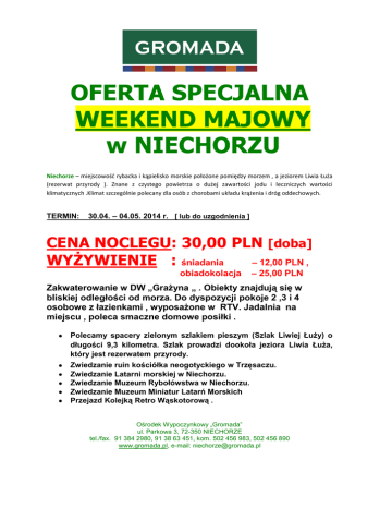 OFERTA SPECJALNA WEEKEND MAJOWY w NIECHORZU Niechorze – miejscowość rybacka i kąpielisko morskie położone pomiędzy morzem , a jeziorem Liwia Łuża (rezerwat przyrody ). Znane z czystego powietrza o dużej zawartości jodu i leczniczych wartości klimatycznych .Klimat szczególnie polecany dla osób z chorobami układu krążenia i dróg oddechowych. TERMIN: 30.04. – 04.05. 2014 r. [ lub do uzgodnienia ] CENA NOCLEGU: 30,00 PLN [doba] WYŻYWIENIE : śniadania – 12,00 PLN , obiadokolacja – 25,00 PLN Zakwaterowanie w DW „Grażyna „ . Obiekty znajdują się w bliskiej odległości od morza. Do dyspozycji pokoje 2 ,3 i 4 osobowe z łazienkami , wyposażone w RTV. Jadalnia na miejscu , poleca smaczne domowe posiłki . Polecamy spacery zielonym szlakiem pieszym (Szlak Liwiej Łuży) o długości 9,3 kilometra. Szlak prowadzi dookoła jeziora Liwia Łuża, który jest rezerwatem przyrody. Zwiedzanie ruin kościółka neogotyckiego w Trzęsaczu. Zwiedzanie Latarni morskiej w Niechorzu. Zwiedzanie Muzeum Rybołówstwa w Niechorzu. Zwiedzanie Muzeum Miniatur Latarń Morskich Przejazd Kolejką Retro Wąskotorową . Ośrodek Wypoczynkowy „Gromada” ul. Parkowa 3, 72-350 NIECHORZE tel./fax. 91 384 2980, 91 38 63 451, kom. 502 456 983, 502 456 890 www.gromada.pl, e-mail: [email protected]