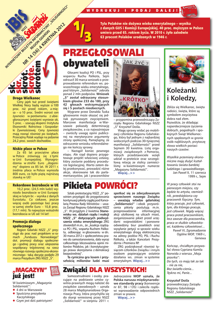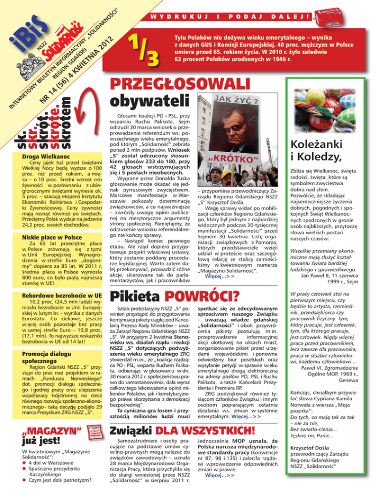 „S OL ID AR 20 NO 12 ŚC I” TN IA BI NS UL ZZ ET YN RE GI INF ON O R GD MA W AŃS CYJN IE KI Y iB iS sk. skr. skrót. NR 14 skróte. (56 skrótem ) 4 K IN TE RN ET OW Y Droga Wielkanoc Ceny jajek tuż przed świętami Wielkiej Nocy będą wyższe o 100 proc. niż przed rokiem, a mięsa – o 10 proc. Średni wzrost cen żywności w porównaniu z ubiegłorocznymi świętami wyniesie ok. 5 proc. – szacują eksperci Instytutu Ekonomiki Rolnictwa i Gospodarki Żywnościowej. Ceny żywności mają rosnąć również po świętach. Przeciętny Polak wydaje na jedzenie 24,2 proc. swoich dochodów. Niskie płace w Polsce Za 65 lat przeciętne płace w Polsce zrównają się z tymi w Unii Europejskiej. Wynagrodzenia w strefie Euro „dogonimy” dopiero za 85 lat. W 2011 r. średnia płaca w Polsce wyniosła 800 euro, co było piątą najniższą stawką w UE! Rekordowe bezrobocie w UE 10,2 proc. (24,5 mln ludzi) wyniosło bezrobocie w Unii Europejskiej w lutym br. – wynika z danych Eurostatu. Co ciekawe, jeszcze więcej osób pozostaje bez pracy w samej strefie Euro – 10,8 proc. (17,1 mln). To najwyższe wskaźniki bezrobocia w UE od 14 lat! Promocja dialogu społecznego Region Gdański NSZZ „S” przystąpi do prac nad projektem w ramach „Funduszu Norweskiego” dot. promocji dialogu społecznego i godnej pracy oraz ulepszenia współpracy trójstronnej na rzecz równego rozwoju społeczno-ekonomicznego– taką decyzję podjęło 29 marca Prezydium ZRG NSZZ „S”. „MAGAZYN” już jest! W kwietniowym „Magazynie Solidarność”: 4 dni w Warszawie Spuścizna prezydenta Kaczyńskiego Czym jest dziś patriotyzm? W Y D R U K U J 1/ 3 I P O D A J D A L E J ! Tylu Polaków nie dożywa wieku emerytalnego – wynika z danych GUS i Komisji Europejskiej. 40 proc. mężczyzn w Polsce umiera przed 65. rokiem życia. W 2010 r. żyło zaledwie 63 procent Polaków urodzonych w 1946 r. PRZEGŁOSOWALI obywateli Głosami koalicji PO i PSL, przy wsparciu Ruchu Palikota, Sejm odrzucił 30 marca wniosek o przeprowadzenie referendum ws. powszechnego wieku emerytalnego, pod którym „Solidarność” zebrała ponad 2 mln podpisów. Wniosek „S” został odrzucony stosunkiem głosów 233 do 180, przy 42 głosach wstrzymujących się i 5 posłach nieobecnych. Wygrane przez Donalda Tuska głosowanie może okazać się jednak pyrrusowym zwycięstwem. Marcowe manifestacje w Warszawie pokazały determinację związkowców, a co najważniejsze – zwróciły uwagę opinii publicznej na merytoryczne argumenty strony społecznej. Pamiętajmy, że odrzucenie wniosku referendalnego nie kończy sprawy. – Nastąpił koniec pewnego etapu. Ale rząd dopiero przygotowuje projekt właściwej ustawy, który zostanie poddany procedurze legislacyjnej. Warto zatem dalej przekonywać, prowadzić różne akcje, skierowane tak do parlamentarzystów, jak i pracowników Koleżanki i Koledzy, – przypomina przewodniczący Zarządu Regionu Gdańskiego NSZZ „S” Krzysztof Dośla. Wagę sprawy widać po mobilizacji członków Regionu Gdańskiego, który był jednym z najbardziej widocznych podczas 30-tysięcznej manifestacji „Solidarności” przed Sejmem 30 kwietnia. Listę organizacji związkowych z Pomorza, których przedstawiciele wzięli udział w proteście oraz szczegółową relację ze stolicy zamieściliśmy w kwietniowym numerze „Magazynu Solidarność”. Więcej...>> Pikieta POWRÓCI? Sztab protestacyjny NSZZ „S” powinien przystąpić do przygotowania kontynuacji pikiety ciągłej pod Kancelarią Prezesa Rady Ministrów – uważa Zarząd Regionu Gdańskiego NSZZ „S”. W przyjętym 2 kwietnia Stanowisku ws. działań rządu i reakcji NSZZ „S” dotyczących podwyższenia wieku emerytalnego ZRG stwierdził m.in., że „koalicja rządząca PO i PSL, wsparta Ruchem Palikota, odbierając w głosowaniu w dn. 30 marca 2012 r. społeczeństwu prawo do samostanowienia, dała wyraz całkowitego lekceważenia opinii milionów Polaków, jak i konstytucyjnego prawa skorzystania z demokracji bezpośredniej”. Ta cyniczna gra losem i przyszłością milionów ludzi musi spotkać się ze zdecydowanym sprzeciwem naszego Związku – uważają władze gdańskiej „Solidarności” i obok przywrócenia pikiety postulują m.in. przeprowadzenie informacyjnej akcji ulotkowej na ulicach miast, zorganizowanie pikiet przed urzędami wojewódzkimi i ponowne odwiedziny biur poselskich oraz wysyłanie petycji w sprawie wieku emerytalnego drogą elektroniczną na adresy posłów PO, PSL i Ruchu Palikota, a także Kancelarii Prezydenta i Premiera RP. ZRG podziękował również tysiącom członków Związku i innym osobom popierającym ostatnie działania ws. zmian w systemie emerytalnym. Więcej...>> Związki DLA WSZYSTKICH! Samozatrudnieni i osoby pracujące na podstawie umów cywilno-prawnych mogą należeć do związków zawodowych – uznała 28 marca Międzynarodowa Organizacja Pracy, która przychyliła się do skargi wniesionej przez NSZZ „Solidarność” w sierpniu 2011 r. Jednocześnie MOP uznała, że Polska narusza międzynarodowe standardy pracy (konwencje nr 87, 98 i 135) i zaleciła rządowi wprowadzenie odpowiednich zmian w prawie. Więcej...>> Zbliża się Wielkanoc, święta radości, święta, które są symbolem zwycięstwa dobra nad złem. Pozwólcie, że składając najserdeczniejsze życzenia dobrych, pogodnych i spokojnych Świąt Wielkanocnych spędzonych w gronie osób najbliższych, przytoczę słowa wielkich postaci naszych czasów: Wszelkie przemiany ekonomiczne mają służyć kształtowaniu świata bardziej ludzkiego i sprawiedliwego. Jan Paweł II, 11 czerwca 1999 r., Sejm W pracy człowiek stoi na pierwszym miejscu, czy będzie to artysta, rzemieślnik, przedsiębiorca czy pracownik fizyczny. Tym, który pracuje, jest człowiek, tym, dla którego pracuje, jest człowiek. Nigdy więcej praca przed pracownikiem, lecz zawsze dla pracownika, praca w służbie człowiekowi, każdemu cz