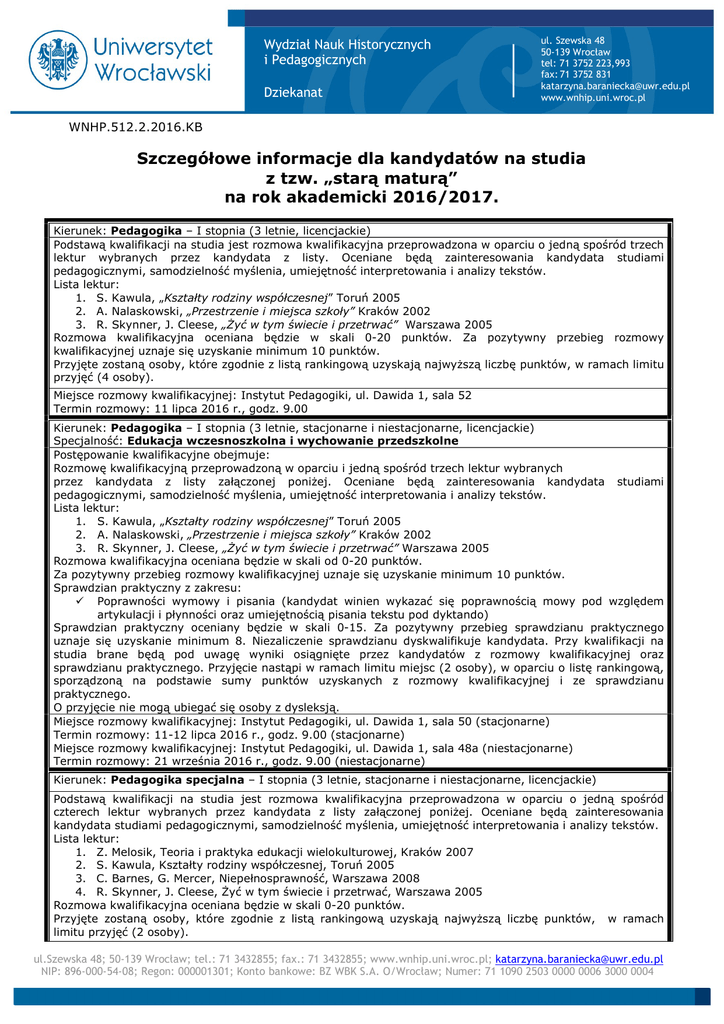 Wydział Nauk Historycznych i Pedagogicznych Dziekanat ul. Szewska 48 50-139 Wrocław tel: 71 3752 223,993 fax: 71 3752 831 [email protected] www.wnhip.uni.wroc.pl WNHP.512.2.2016.KB Szczegółowe informacje dla kandydatów na studia z tzw. „starą maturą” na rok akademicki 2016/2017. Kierunek: Pedagogika – I stopnia (3 letnie, licencjackie) Podstawą kwalifikacji na studia jest rozmowa kwalifikacyjna przeprowadzona w oparciu o jedną spośród trzech lektur wybranych przez kandydata z listy. Oceniane będą zainteresowania kandydata studiami pedagogicznymi, samodzielność myślenia, umiejętność interpretowania i analizy tekstów. Lista lektur: 1. S. Kawula, „Kształty rodziny współczesnej” Toruń 2005 2. A. Nalaskowski, „Przestrzenie i miejsca szkoły” Kraków 2002 3. R. Skynner, J. Cleese, „Żyć w tym świecie i przetrwać” Warszawa 2005 Rozmowa kwalifikacyjna oceniana będzie w skali 0-20 punktów. Za pozytywny przebieg rozmowy kwalifikacyjnej uznaje się uzyskanie minimum 10 punktów. Przyjęte zostaną osoby, które zgodnie z listą rankingową uzyskają najwyższą liczbę punktów, w ramach limitu przyjęć (4 osoby). Miejsce rozmowy kwalifikacyjnej: Instytut Pedagogiki, ul. Dawida 1, sala 52 Termin rozmowy: 11 lipca 2016 r., godz. 9.00 Kierunek: Pedagogika – I stopnia (3 letnie, stacjonarne i niestacjonarne, licencjackie) Specjalność: Edukacja wczesnoszkolna i wychowanie przedszkolne Postępowanie kwalifikacyjne obejmuje: Rozmowę kwalifikacyjną przeprowadzoną w oparciu i jedną spośród trzech lektur wybranych przez kandydata z listy załączonej poniżej. Oceniane będą zainteresowania kandydata studiami pedagogicznymi, samodzielność myślenia, umiejętność interpretowania i analizy tekstów. Lista lektur: 1. S. Kawula, „Kształty rodziny współczesnej” Toruń 2005 2. A. Nalaskowski, „Przestrzenie i miejsca szkoły” Kraków 2002 3. R. Skynner, J. Cleese, „Żyć w tym świecie i przetrwać” Warszawa 2005 Rozmowa kwalifikacyjna oceniana będzie w skali od 0-20 punktów. Za pozytywny przebieg rozmowy kwalifikacyjnej uznaje się uzyskanie minimum 10 punktów. Sprawdzian praktyczny z zakresu: Poprawności wymowy i pisania (kandydat winien wykazać się poprawnością mowy pod względem artykulacji i płynności oraz umiejętnością pisania tekstu pod dyktando) Sprawdzian praktyczny oceniany będzie w skali 0-15. Za pozytywny przebieg sprawdzianu praktycznego uznaje się uzyskanie minimum 8. Niezaliczenie sprawdzianu dyskwalifikuje kandydata. Przy kwalifikacji na studia brane będą pod uwagę wyniki osiągnięte przez kandydatów z rozmowy kwalifikacyjnej oraz sprawdzianu praktycznego. Przyjęcie nastąpi w ramach limitu miejsc (2 osoby), w oparciu o listę rankingową, sporządzoną na podstawie sumy punktów uzyskanych z rozmowy kwalifikacyjnej i ze sprawdzianu praktycznego. O przyjęcie nie mogą ubiegać się osoby z dysleksją. Miejsce rozmowy kwalifikacyjnej: Instytut Pedagogiki, ul. Dawida 1, sala 50 (stacjonarne) Termin rozmowy: 11-12 lipca 2016 r., godz. 9.00 (stacjonarne) Miejsce rozmowy kwalifikacyjnej: Instytut Pedagogiki, ul. Dawida 1, sala 48a (niestacjonarne) Termin rozmowy: 21 września 2016 r., godz. 9.00 (niestacjonarne) Kierunek: Pedagogika specjalna – I stopnia (3 letnie, stacjonarne i niestacjonarne, licencjackie) Podstawą kwalifikacji na studia jest rozmowa kwalifikacyjna przeprowadzona w oparciu o jedną spośród czterech lektur wybranych przez kandydata z listy załączonej poniżej. Oceniane będą zainteresowania kandydata studiami pedagogicznymi, samodzielność myślenia, umiejętność interpretowania i analizy tekstów. Lista lektur: 1. Z. Melosik, Teoria i praktyka edukacji wielokulturowej, Kraków 2007 2. S. Kawula, Kształty rodziny współczesnej, Toruń 2005 3. C. Barnes, G. Mercer, Niepełnosprawność, Warszawa 2008 4. R. Skynner, J. Cleese, Żyć w tym świecie i przetrwać, Warszawa 2005 Rozmowa kwalifikacyjna oceniana będzie w skali 0-20 punktów. Przyjęte zostaną osoby, które zgodnie z listą rankingową uzyskają najwyższą liczbę punktów, w ramach limitu przyjęć (2 osoby). ul.Szewska 48; 50-139 Wrocław; tel.: 71 3432855; fax.: 71 3432855; www.wnhip.uni.wroc.pl; [email protected] NIP: 896-000-54-08; Regon: 000001301; Konto bankowe: BZ WBK S.A. O/Wrocław; Numer: 71 1090 2503 0000 0006 3000 0004 2. Miejsce rozmowy kwalifikacyjnej: Instytut Pedagogiki, ul. Dawida 1, sala 51 Termin rozmowy: 11 lipca 2016 r., godz. 9.00 (stacjonarne) Termin rozmowy: 20 września 2016 r., godz. 9.00 (niestacjonarne) Kierunek: Kulturoznawstwo – I stopnia (3-letnie, licencjackie) Kandydaci ze „starą maturą” będą przyjmowane na podstawie egzaminu ustnego prowadzonego przez członków Wydziałowej Komisji Rekrutacyjnej. Egzamin ma na celu zorientowanie się w przygotowaniu kandydata do podjęcia studiów na kierunku kulturoznawstwo, a jego zakres obejmował będzie programy przedmiotów humanistycznych realizowanych na poziomie szkoły średniej. Rozmowa oceniana jest w skali 05. Do zaliczenia potrzebne jest uzyskanie minimum 2 punktów. O przyjęciu w ramach ustalonego limitu przyjęć decyduje ranking punktów (3 osoby). Miejsce rozmowy kwalifikacyjnej: Instytut Kulturoznawstwa, ul. Szewska 50/51, sala 8 Termin rozmowy: 11 lipca 2016 r., godz. 10.00 Kierunek: Historia – I stopnia (3-letnie, licencjackie) Kandydaci ze "starą maturą" przystępują do egzaminu w postaci rozmowy kwalifikacyjnej w zakresie materiału z przedmiotu historia na poziomie liceum ogólnokształcącego. Rozmowa oceniana jest w skali 0-30. Do zaliczenia potrzebne jest uzyskanie minimum 2 punktów. Podstawą przyjęcia będzie lista rankingowa wg uznanych punktów w ustalonym limicie przyjęć (5 osób). Miejsce rozmowy kwalifikacyjnej: Instytut Historyczny, ul. Szewska 49, sala 140 Termin rozmowy: 8 lipca 2016 r., godz. 10.00 Kierunek: Dziedzictwo kultury materialnej – (3-letnie licencjackie) Kandydaci ze "starą 