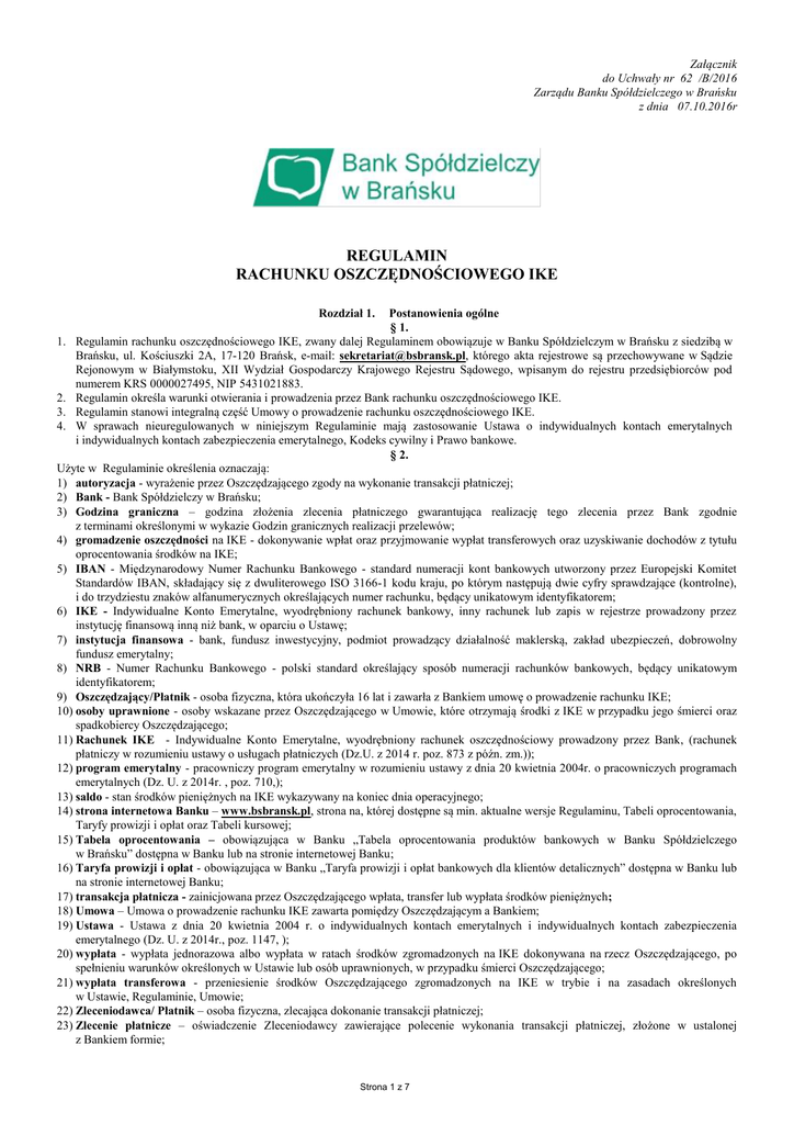 Załącznik do Uchwały nr 62 /B/2016 Zarządu Banku Spółdzielczego w Brańsku z dnia 07.10.2016r REGULAMIN RACHUNKU OSZCZĘDNOŚCIOWEGO IKE Rozdział 1. Postanowienia ogólne § 1. 1. Regulamin rachunku oszczędnościowego IKE, zwany dalej Regulaminem obowiązuje w Banku Spółdzielczym w Brańsku z siedzibą w Brańsku, ul. Kościuszki 2A, 17-120 Brańsk, e-mail: [email protected], którego akta rejestrowe są przechowywane w Sądzie Rejonowym w Białymstoku, XII Wydział Gospodarczy Krajowego Rejestru Sądowego, wpisanym do rejestru przedsiębiorców pod numerem KRS 0000027495, NIP 5431021883. 2. Regulamin określa warunki otwierania i prowadzenia przez Bank rachunku oszczędnościowego IKE. 3. Regulamin stanowi integralną część Umowy o prowadzenie rachunku oszczędnościowego IKE. 4. W sprawach nieuregulowanych w niniejszym Regulaminie mają zastosowanie Ustawa o indywidualnych kontach emerytalnych i indywidualnych kontach zabezpieczenia emerytalnego, Kodeks cywilny i Prawo bankowe. § 2. Użyte w Regulaminie określenia oznaczają: 1) autoryzacja - wyrażenie przez Oszczędzającego zgody na wykonanie transakcji płatniczej; 2) Bank - Bank Spółdzielczy w Brańsku; 3) Godzina graniczna – godzina złożenia zlecenia płatniczego gwarantująca realizację tego zlecenia przez Bank zgodnie z terminami określonymi w wykazie Godzin granicznych realizacji przelewów; 4) gromadzenie oszczędności na IKE - dokonywanie wpłat oraz przyjmowanie wypłat transferowych oraz uzyskiwanie dochodów z tytułu oprocentowania środków na IKE; 5) IBAN - Międzynarodowy Numer Rachunku Bankowego - standard numeracji kont bankowych utworzony przez Europejski Komitet Standardów IBAN, składający się z dwuliterowego ISO 3166-1 kodu kraju, po którym następują dwie cyfry sprawdzające (kontrolne), i do trzydziestu znaków alfanumerycznych określających numer rachunku, będący unikatowym identyfikatorem; 6) IKE - Indywidualne Konto Emerytalne, wyodrębniony rachunek bankowy, inny rachunek lub zapis w rejestrze prowadzony przez instytucję finansową inną niż bank, w oparciu o Ustawę; 7) instytucja finansowa - bank, fundusz inwestycyjny, podmiot prowadzący działalność maklerską, zakład ubezpieczeń, dobrowolny fundusz emerytalny; 8) NRB - Numer Rachunku Bankowego - polski standard określający sposób numeracji rachunków bankowych, będący unikatowym identyfikatorem; 9) Oszczędzający/Płatnik - osoba fizyczna, która ukończyła 16 lat i zawarła z Bankiem umowę o prowadzenie rachunku IKE; 10) osoby uprawnione - osoby wskazane przez Oszczędzającego w Umowie, które otrzymają środki z IKE w przypadku jego śmierci oraz spadkobiercy Oszczędzającego; 11) Rachunek IKE - Indywidualne Konto Emerytalne, wyodrębniony rachunek oszczędnościowy prowadzony przez Bank, (rachunek płatniczy w rozumieniu ustawy o usługach płatniczych (Dz.U. z 2014 r. poz. 873 z późn. zm.)); 12) program emerytalny - pracowniczy program emerytalny w rozumieniu ustawy z dnia 20 kwietnia 2004r. o pracowniczych programach emerytalnych (Dz. U. z 2014r. , poz. 710,); 13) saldo - stan środków pieniężnych na IKE wykazywany na koniec dnia operacyjnego; 14) strona internetowa Banku – www.bsbransk.pl, strona na, której dostępne są min. aktualne wersje Regulaminu, Tabeli oprocentowania, Taryfy prowizji i opłat oraz Tabeli kursowej; 15) Tabela oprocentowania – obowiązująca w Banku „Tabela oprocentowania produktów bankowych w Banku Spółdzielczego w Brańsku” dostępna w Banku lub na stronie internetowej Banku; 16) Taryfa prowizji i opłat - obowiązująca w Banku „Taryfa prowizji i opłat bankowych dla klientów detalicznych” dostępna w Banku lub na stronie internetowej Banku; 17) transakcja płatnicza - zainicjowana przez Oszczędzającego wpłata, transfer lub wypłata środków pieniężnych; 18) Umowa – Umowa o prowadzenie rachunku IKE zawarta pomiędzy Oszczędzającym a Bankiem; 19) Ustawa - Ustawa z dnia 20 kwietnia 2004 r. o indywidualnych kontach emerytalnych i indywidualnych kontach zabezpieczenia emerytalnego (Dz. U. z 2014r., poz. 1147, ); 20) wypłata - wypłata jednorazowa albo wypłata w ratach środków zgromadzonych na IKE dokonywana na rzecz Oszczędzającego, po spełnieniu warunków określonych w Ustawie lub osób uprawnionych, w przypadku śmierci Oszczędzającego; 21) wypłata transferowa - przeniesienie środków Oszczędzającego zgromadzonych na IKE w trybie i na zasadach określonych w Ustawie, Regulaminie, Umowie; 22) Zleceniodawca/ Płatnik – osoba fizyczna, zlecająca dokonanie transakcji płatniczej; 23) Zlecenie płatnicze – oświadczenie Zleceniodawcy zawierające polecenie wykonania transakcji płatniczej, złożone w ustalonej z Bankiem formie; Strona 1 z 7 24) zwrot - wycofanie całości środków zgromadzonych na rachunku IKE przez Oszczędzającego, jeśli nie zachodzą przesłanki do wypłaty bądź wypłaty transferowej; 25) częściowy zwrot – wycofanie części środków zgromadzonych na IKE, jeżeli nie zachodzą przesłanki do wypłaty bądź wypłaty transferowej. § 3. 1. Rachunek IKE służy Oszczędzającemu do przechowywania środków pieniężnych oraz wykonywania jego dyspozycji, zgodnie z obowiązującymi przepisami prawa. 2. Oszczędzający może być równocześnie posiadaczem tylko jednego IKE. Dotyczy to nie tylko rachunków w Banku, ale we wszystkich instytucjach finansowych. 3. Rachunek IKE może być prowadzony wyłącznie jako rachunek indywidualny. 4. Odsetki od oszczędności zgromadzonych na Rachunku IKE zwolnione są z podatku dochodowego na mocy ustawy o podatku dochodowym od osób fizycznych (Dz.U. z 2012 r. poz. 361 z późn. zm.), w zakresie przewidzianym tą Ustawą. Rozdział 2. Otwarcie rachunku IKE § 4. 1. Otwarcie Rachunku IKE następuje z chwilą zawarcia Umowy pomiędzy Bankiem a Oszczędzającym. 2. Zawarcie Umowy następuje w formie pisemnej na czas nieokreślony. 3. Warunkiem zawarcia Umowy jest z