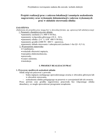 Przykładowe rozwiązanie zadania dla zawodu technik elektryk Projekt realizacji prac z zakresu lokalizacji i usunięcia uszkodzenia nagrzewnicy oraz wykonanie dokumentacji z zakresu wykonanych prac w układzie sterowania silnika ZAŁOŻENIA (Założenia do projektu prac mogą być w dowolnej formie, np. opisowej lub tabelarycznej) 1. Parametry charakterystyczne układu: • parametry zasilania (3 x 400 V/50 Hz), • parametry wyłącznika głównego (10 A – K1), • parametry silnika (3-f 1,1 kW 400 V/50 Hz), • parametry grzałki (2400 W / 400 V - oporowa), • parametry układu sterowania i zabezpieczeń (zasilanie 1-faz Q1- 0,5 A). 2. Wyposażenie stanowiska • 3 multimetry, • wskaźnik obecności napięcia, • narzędzia elektrotechniczne, • przewody, • części zamienne, • instrukcje. I. PROJEKT REALIZACJI PRAC 1. Przyczyny możliwych uszkodzeń układu Silnik mógł nie pracować z powodu: − braku napięcia zasilającego spowodowanego awarią w obwodzie głównym lub w obwodzie sterowania, − uszkodzenia silnika polegającego na przerwie w uzwojeniach lub ich zwarciu. Przez pewien czas grzałka nagrzewnicy pracowała bez włączonego silnika dmuchawy, co mogło spowodować przegrzanie urządzenia. 1 Przykładowe rozwiązanie zadania dla zawodu technik elektryk 2. Algorytm prac prowadzących do lokalizacji i usunięcia uszkodzenia (Algorytm może być przedstawiony w różnej formie zależnej od preferencji zdającego, np.: opisowej, graficznej (schemat blokowy), tabelarycznej). Start Sprawdzenie odłączenia układu od zasilania. Odłącz zasilanie. Czy układ jest odłączony od zasilania? Nie C Tak Sprawdzenie ciągłości połączeń w obwodzie zasilania silnika przed stykami głównymi stycznika K2 (od strony zasilania). Tak Czy jest przerwa? Lokalizacja przerwy i jej usunięcie (ewentualna wymiana wyłącznika silnikowego) Nie Sprawdzenie ciągłości połączeń w obwodzie zasilania silnika za stykami głównymi stycznika K2. Tak Czy jest przerwa? Lokalizacja przerwy i jej usunięcie Nie A 2 Przykładowe rozwiązanie zadania dla zawodu technik elektryk A Sprawdzenie symetrii rezystancji uzwojeń silnika. Czy jest symetria rezystancji uzwojeń? Nie Tak Silnik do wymiany lub do remontu Sprawdzenie po kolei wszystkich połączeń i elementów w obwodzie sterowania silnika Czy jest usterka w tym obwodzie? D Tak Lokalizacja usterki i jej usunięcie Nie Pomiar rezystancji między uzwojeniem a obudową silnika. Czy jest przebicie do obudowy silnika? Tak Silnik do wymiany lub do remontu Nie D Sprawdzenie grzałki Czy grzałka jest uszkodzona? Tak Wymiana grzałki Nie B 3 Przykładowe rozwiązanie zadania dla zawodu technik elektryk B Pomiar rezystancji między zaciskami grzałki a obudową Tak Czy jest przebicie? Wymiana grzałki Nie D Załączenie zasilania i próbne uruchomienie nagrzewnicy. Czy nagrzewnica pracuje poprawnie? Nie Tak Wyłączenie układu i opracowanie zaleceń eksploatacyjnych oraz propozycji modyfikacji układu Koniec 4 C Przykładowe rozwiązanie zadania dla zawodu technik elektryk 3 Wskazówki eksploatacyjne 1. Załączając nagrzewnicę należy w pierwszej kolejności załączyć silnik, sprawdzić czy pracuje poprawnie i następnie załączyć grzałkę. 2. Wyłączając nagrzewnicę należy wyłączać silnik po pewnym czasie (np. 30 sekund) od chwili wyłączenia grzałki w celu jej wychłodzenia. 4. Schemat zmodyfikowanego układu a) z ręcznym załączaniem silnika dmuchawy W celu uniemożliwienia załączenia grzałki przed załączeniem silnika zmodyfikuje się układ sterowania wprowadzając w obwód sterowania grzałki styk pomocniczy otwarty stycznika K2 wg schematu jw. b) z automatycznym wyłączaniem silnika dmuchawy Wyłączenie silnika po czasie 30 sekund od chwili wyłączenia grzałki może być realizowane automatycznie po wprowadzeniu przekaźnika czasowego KT1 jak na schemacie wyżej. 5 Przykładowe rozwiązanie zadania dla zawodu technik elektryk II. Dokumentacja z wykonania prac 1. Wyniki pomiarów w układzie sterowania silnika a) tabela pomiaru rezystancji styków stycznika K2 Oznaczenie styków numer na schemacie głównych Rodzaj pracy wynik pomiaru 0Ω ∞Ω 0Ω ∞Ω 0Ω ∞Ω zał wył zał wył zał wył 1-2 13 - 14 pomocniczych 21 - 22 wniosek (diagnoza) działa poprawnie działa poprawnie działa poprawnie b) tabela pomiaru rezystancji cewek Numer cewki stycznika K2 Oznaczenie końcówek A1 – A2 K3 A1 – A2 wynik pomiaru wniosek (diagnoza) 1052 Ω prawidłowo zgodnie z danymi technicznymi 1034 Ω c) tabela pomiaru ciągłości (rezystancji) przewodów odcinek przewodu Q3 – K3 Q2 – K2 wynik pomiaru 0Ω ∞ Ω wniosek (diagnoza) jest ciągłość przerwa – wymienić przewód 2. Wykaz przyrządów pomiarowych, narzędzi i materiałów zastosowanych do usunięcia uszkodzenia a) wykaz przyrządów pomiarowych: • multimetr UM 111, • wskaźnik obecności napięcia do 500 V b) wykaz narzędzi i materiałów: • przewód DY 1,5 mm2 o długości 0,25 m, • przyrząd do ściągania izolacji z przewodów- Ø 0,5-5 mm, • szczypce monterskie, uniwersalne izolowane 750 V, • nóż monterski, • szczypce boczne do cięcia, • komplet wkrętaków elektrotechnicznych, • lutownica elektryczna 40 W rezystorowa, • praska do zaciskania przewodów- 0,5-5 mm. 3. Wniosek W układzie sterowania silnika uszkodzony był przewód łączący styk pomocniczy wyłącznika silnikowego Q2 i cewkę stycznika K2. 6