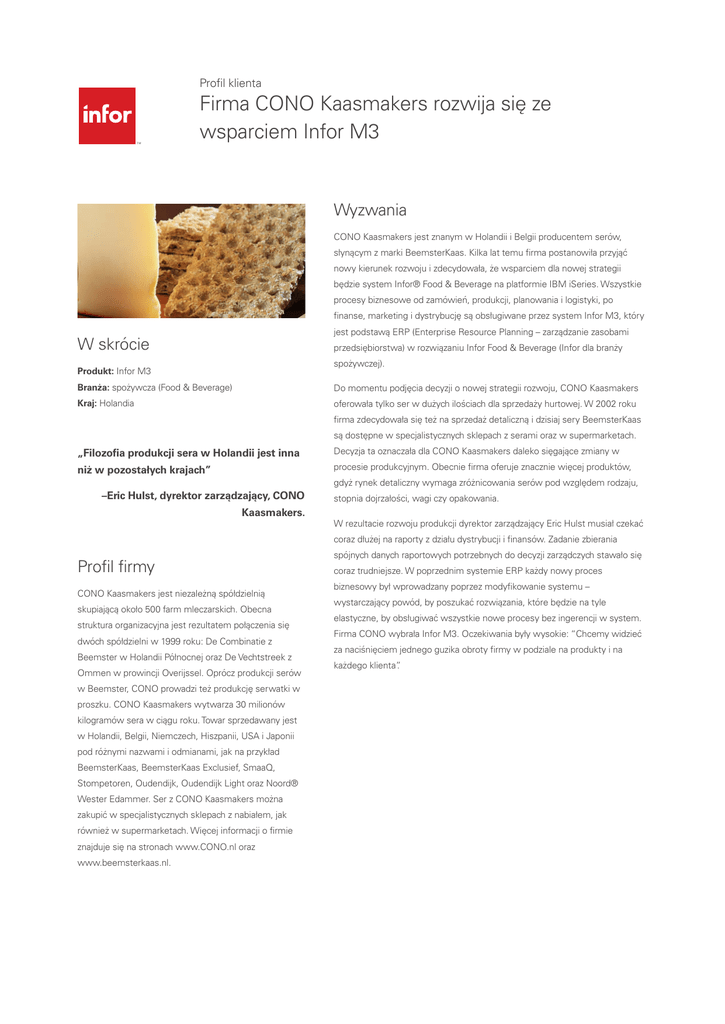Profil klienta Firma CONO Kaasmakers rozwija się ze wsparciem Infor M3 Wyzwania CONO Kaasmakers jest znanym w Holandii i Belgii producentem serów, słynącym z marki BeemsterKaas. Kilka lat temu firma postanowiła przyjąć nowy kierunek rozwoju i zdecydowała, że wsparciem dla nowej strategii będzie system Infor® Food & Beverage na platformie IBM iSeries. Wszystkie procesy biznesowe od zamówień, produkcji, planowania i logistyki, po finanse, marketing i dystrybucję są obsługiwane przez system Infor M3, który jest podstawą ERP (Enterprise Resource Planning – zarządzanie zasobami W skrócie przedsiębiorstwa) w rozwiązaniu Infor Food & Beverage (Infor dla branży spożywczej). Produkt: Infor M3 Branża: spożywcza (Food & Beverage) Do momentu podjęcia decyzji o nowej strategii rozwoju, CONO Kaasmakers Kraj: Holandia oferowała tylko ser w dużych ilościach dla sprzedaży hurtowej. W 2002 roku firma zdecydowała się też na sprzedaż detaliczną i dzisiaj sery BeemsterKaas są dostępne w specjalistycznych sklepach z serami oraz w supermarketach. „Filozofia produkcji sera w Holandii jest inna Decyzja ta oznaczała dla CONO Kaasmakers daleko sięgające zmiany w niż w pozostałych krajach” procesie produkcyjnym. Obecnie firma oferuje znacznie więcej produktów, gdyż rynek detaliczny wymaga zróżnicowania serów pod względem rodzaju, –Eric Hulst, dyrektor zarządzający, CONO stopnia dojrzałości, wagi czy opakowania. Kaasmakers. W rezultacie rozwoju produkcji dyrektor zarządzający Eric Hulst musiał czekać coraz dłużej na raporty z działu dystrybucji i finansów. Zadanie zbierania spójnych danych raportowych potrzebnych do decyzji zarządczych stawało się Profil firmy CONO Kaasmakers jest niezależną spółdzielnią skupiającą około 500 farm mleczarskich. Obecna struktura organizacyjna jest rezultatem połączenia się dwóch spółdzielni w 1999 roku: De Combinatie z Beemster w Holandii Północnej oraz De Vechtstreek z Ommen w prowincji Overijssel. Oprócz produkcji serów w Beemster, CONO prowadzi też produkcję serwatki w proszku. CONO Kaasmakers wytwarza 30 milionów kilogramów sera w ciągu roku. Towar sprzedawany jest w Holandii, Belgii, Niemczech, Hiszpanii, USA i Japonii pod różnymi nazwami i odmianami, jak na przykład BeemsterKaas, BeemsterKaas Exclusief, SmaaQ, Stompetoren, Oudendijk, Oudendijk Light oraz Noord® Wester Edammer. Ser z CONO Kaasmakers można zakupić w specjalistycznych sklepach z nabiałem, jak również w supermarketach. Więcej informacji o firmie znajduje się na stronach www.CONO.nl oraz www.beemsterkaas.nl. coraz trudniejsze. W poprzednim systemie ERP każdy nowy proces biznesowy był wprowadzany poprzez modyfikowanie systemu – wystarczający powód, by poszukać rozwiązania, które będzie na tyle elastyczne, by obsługiwać wszystkie nowe procesy bez ingerencji w system. Firma CONO wybrała Infor M3. Oczekiwania były wysokie: “Chcemy widzieć za naciśnięciem jednego guzika obroty firmy w podziale na produkty i na każdego klienta”. Nowa strategia “Podczas gdy większość naszej konkurencji próbuje wytworzyć jak najwięcej sera z każdego litra mleka, naszym celem jest Decyzja by wprowadzić produkty do supermarketów została podjęta na końcu lat 90-tych. Do tamtej pory firma sprzedawała tylko do odbiorców hurtowych, a produkty serowe przed produkcja sera najwyższej klasy. Z zasady sprzedażą dojrzewały przez 15 dni. Dystrybutorzy hurtowi prowadzi to do niższego zwrotu, co z kolei zajmowali się kolejnymi etapami procesu dojrzewania sera i podnosi cenę naszego sera. Ale każdy, kto sprzedawali gotowe produkty do specjalistycznych sklepów z go raz spróbuje, staje się przekonanym do serami. Decyzja o bezpośredniej sprzedaży do supermarketów naszej filozofii” pojawiła się w momencie, gdy sklepy z serami doświadczyły dużego spadku udziałów w rynku. –Eric Hulst, dyrektor zarządzający, CONO Kaasmakers „60% naszego przychodu pochodziło ze specjalistycznych sklepów” – mówi Hulst. „Odnotowujemy znaczny spadek przychodu kiedy te sklepy tracą klientów. W Holandii 84% Spółdzielnia wszystkich serów sprzedaje się w supermarketach. I tam jest nasz potencjał wzrostu”. CONO Kaasmakers produkuje 30 milionów kilogramów sera w Od 2002 roku CONO Kaasmakers sprzedaje sery pod marką ciągu roku używając tradycyjnych metod produkcji. Podczas gdy BeemsterKaas bezpośrednio do supermarketów. Firma ma teraz większość konkurentów przestawiło się na ciągłą produkcję około do czynienia z bardzo wymagającymi klientami i twardymi 20 lat temu, CONO pozostała przy procesie produkcji w partiach, technikami negocjacyjnymi, więc ważnym jest, by sprzedawcy dzięki czemu podstawowe składniki mają więcej czasu na znali dokładną strukturę kosztów produktu. interakcję. „Filozofia produkcji sera w prowincji Holandii Północnej jest inna niż gdziekolwiek na świecie” – wyjaśnia Ponadto, ilość wersji produktów wzrosła znacząco, gdyż firma dyrektor zarządzający Eric Hulst. “Podczas gdy większość naszej dostarcza sery na różnym etapie dojrzewania i w zróżnicowanych konkurencji próbuje wytworzyć jak najwięcej sera z każdego litra opakowaniach. Innym ważnym obszarem jest logistyka. Proces mleka, naszym celem jest produkcja sera najwyższej klasy. Z dojrzewania młodych serów powinien trwać około czterech zasady prowadzi to do niższego zwrotu, co z kolei podnosi cenę tygodni, z kolei bardzo stare sery dojrzewają w Beemster przez naszego sera. Ale każdy, kto go raz spróbuje, staje się minimum 26 miesięcy. To oznacza, że firma potrzebuje więcej przekonanym do naszej filozofii”. Innym wyróżnikiem firmy jest miejsca do magazynowania niż przy wytwarzaniu ujednoliconego brak ceny nabycia. Hulst wyjaśnia: “Jesteśmy spółdzielnią i nasi produktu. farmerzy są opłacani dopiero po sprzedaży produktów. Kwota, którą otrz