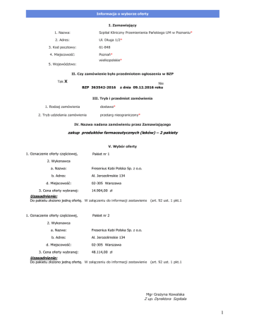 fnformacja o wóborze ofertó f. wamawiającó NK kazwaW pzpital Klinicznó mrzemienienia mańskiego rj w moznaniuG OK AdresW rlK aługa N/OG PK Kod pocztowóW SNJU4U 4K jiejscowośćW moznańG wielkopolskieG RK tojewództwoW ff. Czó zamówienie bóło przedmiotem ogłoszenia w Bwm Tak u Bwm P6P542-20N6 kie z dnia 0V.N2.20N6 roku fff. Trób i przedmiot zamówienia NK oodzaj zamówienia OK Trób udzielania zamówienia dostawaG przetarg nieograniczonóG fs. kazwa nadana zamówieniu przez wamawiającego zakup produktów farmaceutócznóch (leków) – 2 pakietó s. tóbór ofertó NK lznaczenie ofertó częściowej, makiet nr N OK tókonawca aK kazwaW cresenius Kabi molska ppK z oKoK bK AdresW AlK gerozolimskie NP4 dK jiejscowośćW PK Cena ofertó wóbranejW MOJPMR tarszawa N4K9M4,MM zł rzasadnienieW ao pakietu złożono jedną ofertęK t załączeniu do informacji zestawienie (artK 9O ustK N pktKN NK lznaczenie ofertó częściowej, makiet nr ON OK tókonawca aK kazwaW cresenius Kabi molska ppK z oKoK bK AdresW AlK gerozolimskie NP4 dK jiejscowośćW PK Cena ofertó wóbranejW MOJPMR tarszawa 4UKNN4,MM zł rzasadnienieW ao pakietu złożono jedną ofertęK t załączeniu do informacji zestawienie (artK 9O ustK N pktKN jgr drażóna Kowalska w upK aórektora pzpitala 1 westawienie zgodnie z art. 92 ust. 1 pkt. 1 oznaczenie sprawy EwP/152/16 mieczęć zamawiającego Pakiet nr 1 kumer oferty N kazwa tykonawcy cresenius Kabi molska ppK z oKoK AlK gerozolimskie NP4 02JP0R tarszawa iiczba pkt w kryterium cena 100 % iiczba pkt w kryterium ………………… iiczba pkt w kryterium oazem 100,00 N00,00 Pakiet nr 2 N cresenius Kabi molska ppK z oKoK AlK gerozolimskie NP4 02JP0R tarszawa N00,00 100,00 wamawiający informuje, że umowa zostanie zawarta w dniu 2P.01.2017 roku. 2