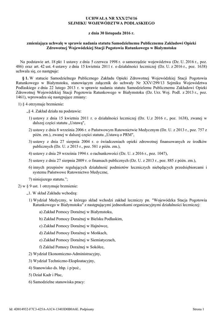 UCHWAŁA NR XXX/274/16 SEJMIKU WOJEWÓDZTWA PODLASKIEGO z dnia 30 listopada 2016 r. zmieniająca uchwałę w sprawie nadania statutu Samodzielnemu Publicznemu Zakładowi Opieki Zdrowotnej Wojewódzkiej Stacji Pogotowia Ratunkowego w Białymstoku Na podstawie art. 18 pkt 1 ustawy z dnia 5 czerwca 1998 r. o samorządzie województwa (Dz. U. 2016 r., poz. 486) oraz art. 42 ust. 4 ustawy z dnia 15 kwietnia 2011 r. o działalności leczniczej (Dz. U. z 2016 r., poz. 1638) uchwala się, co następuje: § 1. W statucie Samodzielnego Publicznego Zakładu Opieki Zdrowotnej Wojewódzkiej Stacji Pogotowia Ratunkowego w Białymstoku, stanowiącym załącznik do uchwały Nr XXV/299/13 Sejmiku Województwa Podlaskiego z dnia 22 lutego 2013 r. w sprawie nadania statutu Samodzielemu Publicznemu Zakładowi Opieki Zdrowotnej Wojewódzkiej Stacji Pogotowia Ratunkowego w Białymstoku (Dz. Urz. Woj. Podl. z 2013 r., poz. 1461), wprowadza się następujące zmiany: 1) § 4 otrzymuje brzmienie: „§ 4. Zakład działa na podstawie: 1) ustawy z dnia 15 kwietnia 2011 r. o działalności leczniczej (Dz. U.z 2016 r., poz. 1638), zwanej w dalszej części statutu „Ustawą", 2) ustawy z dnia 8 września 2006 r. o Państwowym Ratownictwie Medycznym (Dz. U. z 2013 r., poz. 757 z późn. zm.), zwanej w dalszej części statutu „Ustawą o PRM", 3) ustawy z dnia 27 sierpnia 2004 r. o świadczeniach opieki zdrowotnej finansowanych ze środków publicznych (Dz. U. z 2015 r., poz. 581 z późn. zm.), 4) ustawy z dnia 29 września 1994 r. o rachunkowości (Dz. U. z 2016 r., poz. 1047), 5) ustawy z dnia 27 sierpnia 2009 r. o finansach publicznych (Dz. U. z 2013 r., poz. 885 z późn. zm.), 6) innych przepisów regulujących działalność podmiotów leczniczych niebędących przedsiębiorcami i systemu Państwowe Ratownictwo Medyczne, 7) niniejszego statutu.”; 2) w § 9 ust. 1 otrzymuje brzmienie: „1. W skład Zakładu wchodzą: 1) Wydział Medyczny, w którego skład wchodzi zakład leczniczy pn. "Wojewódzka Stacja Pogotowia Ratunkowego w Białymstoku" z następującymi jednostkami organizacyjnymi działalności leczniczej: a) Zakład Pomocy Doraźnej w Białymstoku, b) Zakład Pomocy Doraźnej w Bielsku Podlaskim, c) Zakład Pomocy Doraźnej w Hajnówce, d) Zakład Pomocy Doraźnej w Mońkach, e) Zakład Pomocy Doraźnej w Siemiatyczach, f) Zakład Pomocy Doraźnej w Sokółce, 2) Wydział Ekonomiczno-Administracyjny, 3) Wydział Techniczno-Eksploatacyjny, 4) Stanowisko ds. bhp. i p/poż., 5) Dział Kadr i Płac, 6) Samodzielne stanowiska pracy: Id: 4D014932-F7C3-425A-A1C4-13403D0B0A6E. Podpisany Strona 1 a) Naczelna Pielęgniarka, b) Główny Księgowy, c) Obsługa Prawna, d) Pełnomocnik ds. systemu zarządzania jakością, e) Administrator Bezpieczeństwa Informacji.”. § 2. Wykonanie uchwały powierza się Zarządowi Województwa Podlaskiego. § 3. Uchwała wchodzi w życie po upływie 14 dni od dnia ogłoszenia w Dzienniku Urzędowym Województwa Podlaskiego. Przewodniczący Sejmiku Jarosław Zygmunt Dworzański Id: 4D014932-F7C3-425A-A1C4-13403D0B0A6E. Podpisany Strona 2