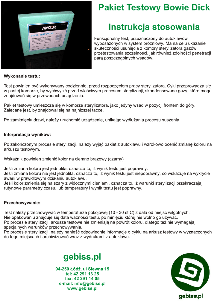 Pakiet Testowy Bowie Dick Instrukcja stosowania Funkcjonalny test, przeznaczony do autoklawów wyposa¿onych w system pró¿niowy. Ma na celu ukazanie skutecznoœci usuniêcia z komory sterylizatora gazów, przetestowania szczelnoœci, jak równie¿ zdolnoœci penetracji par¹ poszczególnych wsadów. Wykonanie testu: Test powinien byæ wykonywany codziennie, przed rozpoczêciem pracy sterylizatora. Cykl przeprowadza siê w pustej komorze, by wychwyciæ przed w³aœciwym procesem sterylizacji, skondensowane gazy, które mog¹ znajdowaæ siê w przewodach urz¹dzenia. Pakiet testowy umieszcza siê w komorze sterylizatora, jako jedyny wsad w pozycji frontem do góry. Zalecane jest, by znajdowa³ siê na najni¿szej tacce. Po zamkniêciu drzwi, nale¿y uruchomiæ urz¹dzenie, unikaj¹c wyd³u¿ania procesu suszenia. Interpretacja wyników: Po zakoñczonym procesie sterylizacji, nale¿y wyj¹æ pakiet z autoklawu i wzrokowo oceniæ zmianê koloru na arkuszu testowym. WskaŸnik powinien zmieniæ kolor na ciemno br¹zowy (czarny) Jeœli zmiana koloru jest jednolita, oznacza to, i¿ wynik testu jest poprawny. Jeœli zmiana koloru nie jest jednolita, oznacza to, i¿ wynik testu jest niepoprawny, co wskazuje na wykrycie awarii w prawid³owym dzia³aniu autoklawu. Jeœli kolor zmienia siê na szary z widocznymi cieniami, oznacza to, i¿ warunki sterylizacji przekraczaj¹ rutynowe parametry czasu, lub temperatury i wynik testu jest poprawny. Przechowywanie: Test nale¿y przechowywaæ w temperaturze pokojowej (10 - 30 st.C) z dala od miejsc wilgotnych. Nie opakowaniu znajduje siê data wa¿noœci testu, po miniêciu której nie wolno go u¿ywaæ. Po procesie sterylizacji, arkusze testowe nie zmieniaj¹ na powrót koloru, dlatego te¿ nie wymagaj¹ specjalnych warunków przechowywania. Po procesie sterylizacji, nale¿y nanieœæ odpowiednie informacje o cyklu na arkusz testowy w wyznaczonych do tego miejscach i archiwizowaæ wraz z wydrukami z autoklawu. gebiss.pl 94-250 £ódŸ, ul Siewna 15 tel: 42 291 13 25 fax: 42 291 14 05 e-mail: [email protected] www.gebiss.pl