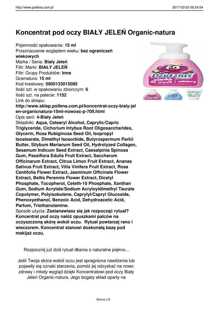 http://www.pollena.com.pl 2017-03-03 00:24:54 Koncentrat pod oczy BIAŁY JELEŃ Organic-natura Pojemność opakowania: 15 ml Przeznaczenie względem wieku: bez ograniczeń wiekowych Marka / Seria: Biały Jeleń Filtr: Marki: BIAŁY JELEŃ Filtr: Grupy Produktów: Inne Gramatura: 15 ml Kod kreskowy: 5900133015085 Ilość szt. w opakowaniu zbiorczym: 6 Ilość szt. na palecie: 1152 Link do sklepu: http://www.sklep.pollena.com.pl/koncentrat-oczy-bialy-jel en-organicnatura-15ml-nowosc-p-709.html Opis serii: 4-Biały Jeleń Składniki: Aqua, Cetearyl Alcohol, Caprylic/Capric Triglyceride, Cichorium Intybus Root Oligosaccharides, Glycerin, Rosa Rubiginosa Seed Oil, Isopropyl Isostearate, Dimethyl Isosorbide, Butyrospermum Parkii Butter, Silybum Marianum Seed Oil, Hydrolyzed Collagen, Sesamum Indicum Seed Extract, Caesalpinia Spinosa Gum, Passiflora Edulis Fruit Extract, Saccharum Officinarum Extract, Citrus Limon Fruit Extract, Ananas Sativus Fruit Extract, Vitis Vinifera Fruit Extract, Rosa Centifolia Flower Extract, Jasminum Officinale Flower Extract, Bellis Perennis Flower Extract, Dicetyl Phosphate, Tocopherol, Ceteth-10 Phosphate, Xanthan Gum, Sodium Acrylate/Sodium Acryloyldimethyl Taurate Copolymer, Polyisobutene, Caprylyl/Capryl Glucoside, Phenoxyethanol, Benzoic Acid, Dehydroacetic Acid, Parfum, Triethanolamine. Sposób użycia: Zastanawiasz się jak rozpocząć rytuał? Koncentrat pod oczy nałóż opuszkami palców na oczyszczoną skórę wokół oczu. Rytuał powtarzaj rano i wieczorem. Koncentrat stanowi doskonałą bazę pod makijaż oczu. Rozpocznij już dziś rytuał dbania o naturalne piękno... Jeśli Twoja skóra wokół oczu jest spragniona nawilżenia lub pojawiły się oznaki starzenia, pomóż jej odzyskać na nowo zdrowy i młody wygląd dzięki Koncentratowi pod oczy Biały Jeleń Organic-natura. Jego bogaty skład oparty na Strona 1/2 http://www.pollena.com.pl 2017-03-03 00:24:54 naturalnych składnikach wyraźnie wygładzi skórę wokół oczu, widocznie spłyci zmarszczki, pomoże zniwelować cienie i obrzęki nadając promienności i świeżości Twojemu spojrzeniu. Produkt posiada badania okulistyczne i może być stosowany przez osoby noszące szkła kontaktowe. Poznaj cudowne właściwości składników aktywnych Wyciąg z ziaren sezamu: - wyraźnie wypełnia zmarszczki i zagłębienia skóry, poprawia kontury twarzy, odmładza, odpręża i uatrakcyjnia twarz, Wyciąg z korzenia cykorii: - zapewnia efekt natychmiastowego liftingu, działa powierzchniowo napinając skórę, wyraźnie opóźnia procesy starzenia, Kompleks kwasów AHA: - zwiększa poziom nawilżenia i elastyczności skóry oraz poprawia wygląd warstwy rogowej, Ekstrakt z białych kwiatów róży stulistnej, jaśminu i stokrotki: - daje poczucie niezwykle miękkiej i jedwabistej w dotyku skóry, - wyraźnie wygładza nierówności powierzchni skóry, - zmniejsza szorstkość skóry oraz poprawia nawilżenie. Koncentrat rekomendowany do skóry wrażliwej, atopowej, skłonnej do podrażnień. Strona 2/2