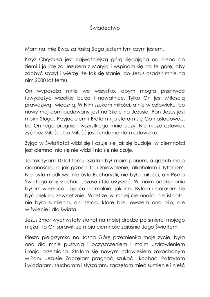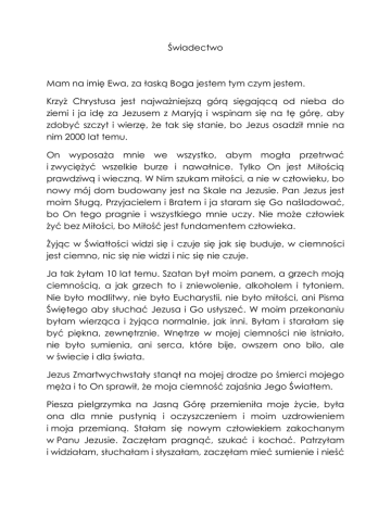 Świadectwo Mam na imię Ewa, za łaską Boga jestem tym czym jestem. Krzyż Chrystusa jest najważniejszą górą sięgającą od nieba do ziemi i ja idę za Jezusem z Maryją i wspinam się na tę górę, aby zdobyć szczyt i wierzę, że tak się stanie, bo Jezus osadził mnie na nim 2000 lat temu. On wyposaża mnie we wszystko, abym mogła przetrwać i zwyciężyć wszelkie burze i nawałnice. Tylko On jest Miłością prawdziwą i wieczną. W Nim szukam miłości, a nie w człowieku, bo nowy mój dom budowany jest na Skale na Jezusie. Pan Jezus jest moim Sługą, Przyjacielem i Bratem i ja staram się Go naśladować, bo On tego pragnie i wszystkiego mnie uczy. Nie może człowiek żyć bez Miłości, bo Miłość jest fundamentem człowieka. Żyjąc w Światłości widzi się i czuje się jak się buduje, w ciemności jest ciemno, nic się nie widzi i nic się nie czuje. Ja tak żyłam 10 lat temu. Szatan był moim panem, a grzech moją ciemnością, a jak grzech to i zniewolenie, alkoholem i tytoniem. Nie było modlitwy, nie było Eucharystii, nie było miłości, ani Pisma Świętego aby słuchać Jezusa i Go usłyszeć. W moim przekonaniu byłam wierząca i żyjąca normalnie, jak inni. Byłam i starałam się być piękna, zewnętrznie. Wnętrze w mojej ciemności nie istniało, nie było sumienia, ani serca, które bije, owszem ono bilo, ale w świecie i dla świata. Jezus Zmartwychwstały stanął na mojej drodze po śmierci mojego męża i to On sprawił, że moja ciemność zajaśnia Jego Światłem. Piesza pielgrzymka na Jasną Górę przemieniła moje życie, była ona dla mnie pustynią i oczyszczeniem i moim uzdrowieniem i moja przemianą. Stałam się nowym człowiekiem zakochanym w Panu Jezusie. Zaczęłam pragnąć, szukać i kochać. Patrzyłam i widziałam, słuchałam i słyszałam, zaczęłam mieć sumienie i nieść pomoc ludziom chorym, samotnym i dzieciom- szłam wszędzie tam, gdzie mnie Pan Jezus zaprowadził. Krzyż Jezusa wyrył się w moim sercu, wiedziałam i czułam, że tylko On jest teraz najważniejszy w moim życiu. Pragnęłam Go całym sercem i całą duszą, dla której stał się codziennym Pokarmem. On to 4 lata temu konsekrował moje wdowieństwo- stałam się wybranką Boga. Jestem dumna, że Jezus Chrystus jest moim Oblubieńcem, a Kościół moim drugim domem. Bóg kocha mnie taką jaka jestem, bo nie ważne jest kim człowiek był przedtem i co robił, ale ważne jest kim jest teraz, co robi i dokąd idzie. Maryjo, w Twoje ręce powierzam moje życie i proszę Cię bądź ma zawsze Matką, chroń mnie w dalszym moim życiu i przy mojej śmierci. Amen Ewa z Tomaszowa Mazowieckiego