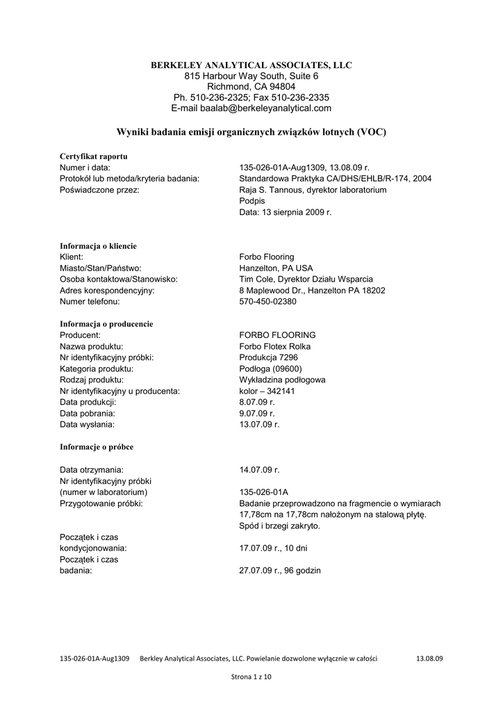 BERKELEY ANALYTICAL ASSOCIATES, LLC 815 Harbour Way South, Suite 6 Richmond, CA 94804 Ph. 510-236-2325; Fax 510-236-2335 E-mail [email protected] Wyniki badania emisji organicznych związków lotnych (VOC) Certyfikat raportu Numer i data: Protokół lub metoda/kryteria badania: Poświadczone przez: 135-026-01A-Aug1309, 13.08.09 r. Standardowa Praktyka CA/DHS/EHLB/R-174, 2004 Raja S. Tannous, dyrektor laboratorium Podpis Data: 13 sierpnia 2009 r. Informacja o kliencie Klient: Miasto/Stan/Państwo: Osoba kontaktowa/Stanowisko: Adres korespondencyjny: Numer telefonu: Forbo Flooring Hanzelton, PA USA Tim Cole, Dyrektor Działu Wsparcia 8 Maplewood Dr., Hanzelton PA 18202 570-450-02380 Informacja o producencie Producent: Nazwa produktu: Nr identyfikacyjny próbki: Kategoria produktu: Rodzaj produktu: Nr identyfikacyjny u producenta: Data produkcji: Data pobrania: Data wysłania: FORBO FLOORING Forbo Flotex Rolka Produkcja 7296 Podłoga (09600) Wykładzina podłogowa kolor – 342141 8.07.09 r. 9.07.09 r. 13.07.09 r. Informacje o próbce Data otrzymania: Nr identyfikacyjny próbki (numer w laboratorium) Przygotowanie próbki: Początek i czas kondycjonowania: Początek i czas badania: 135-026-01A-Aug1309 14.07.09 r. 135-026-01A Badanie przeprowadzono na fragmencie o wymiarach 17,78cm na 17,78cm nałożonym na stalową płytę. Spód i brzegi zakryto. 17.07.09 r., 10 dni 27.07.09 r., 96 godzin Berkley Analytical Associates, LLC. Powielanie dozwolone wyłącznie w całości Strona 1 z 10 13.08.09 Protokół: badania emisji przeprowadzono w oparciu o standardową praktykę badania organicznych związków lotnych z różnych powierzchni, przy użyciu małowymiarowych komór środowiskowych CA/DHS/EHLBR/R-174 z 15 lipca 2004 r., opracowaną przez kalifornijski departament zdrowia (California Dept. of Health Services) (http://www.cal-iaq.org/VOC/Section01350_7_15_2004_FINAL_PLUS_ADDENDUM-2004-01.pdf). Praktyka opiera się na wytycznych określania emisji organicznych z materiałów/produktów zastosowania wewnętrznego, dla małowymiarowych komór środowiskowych” ASTM D 5116 i uwzględnia część kalifornijskiej specyfikacji 01350 dotyczącą badań przeprowadzanych w komorze (http://www.ciwmb.ca.gov/GreenBuilding /Specs/Section01350/). Wyniki specyficzne dla projektu obliczone zostały tak jak zostało to opisane w specyfikacji 01350. Tabela 1. Warunki w komorze podczas badania* Parametr Oznaczenie Wyeksponowana powierzchnia produktu Ac Jednostka m2 Wartość 0,0316 Kubatura komory Vc m3 0,067 Załadunek Lc m2m-3 0,47 Współczynnik przepływu powietrza z zewnątrz Q m3h-1 0,067 Współczynnik wentylacji ac h-1 1,00 Temperatura ˚C 23,4 Wilgotność względna % 50,1 *Określone zakresy: 22˚C do 24˚C, wilgotność względna 45% do 55% i Q 0,064 do 0,070 (komora mała) lub 5,81 do 6, 42 (komora średnia) 135-026-01A-Aug1309 Berkley Analytical Associates, LLC. Powielanie dozwolone wyłącznie w całości Strona 2 z 10 13.08.09 Tabela 2. Parametry wykorzystane do obliczenia stężenia VOC w budynkach Komponent/materiał budowlany: podłoga—wykładzina podłogowa (dowolna) Parametr Oznaczenie Jednostka Wyeksponowana powierzchnia produktu AB m2 89,2 Kubatura budynku VB m3 231,1 m 2,59 Wysokość sufitu Typ budynku* standardowa sala lekcyjna Załadunek LB m2m-3 0,386 Współczynnik wentylacji aB h-1 0,90 Wentylowana część powierzchni VfB Współczynnik wentylacji na obszar 0,90 (m3h-1)/m2 2,10 standardowa przestrzeń biurowa Wyeksponowana powierzchnia produktu AB m2 11,1 Kubatura budynku VB m3 30,6 m 2,74 Wysokość sufitu Załadunek LB m2m-3 0,365 Współczynnik wentylacji aB h-1 0,75 Wentylowana część powierzchni VfB Współczynnik wentylacji na obszar 0,90 (m3h-1)/m2 1,85 *Standardowe typy budynków to: 1) klasa szkolna określona w tabeli 7.4 CA/DHS/EHLB/R-174 z 15.07.04 r., 2) indywidualna przestrzeń biurowa określona w tabeli 7.5 CA/DHS/EHLB/R-174 z 15.07.04 r., 3) duży budynek biurowy o kubaturze - wysokości sufitu określonej w rozdziale „Produkty zatwierdzone” East End Project 01350 kalifornijskiej rady zarządzania odpadami (California Integrated Waste Management Board). Dla produktów wykończeniowych podłogi i paneli ściennych zakłada się 100% pokrycie. Dla farb ściennych i pokrycia ścian, za wyeksponowaną powierzchnię uznaje się obszar budynku pokryty farbą ścienną (http://ww.ciwmb.ca.gov/GreenBuilding/Specs/EastEnd/). 135-026-01A-Aug1309 Berkley Analytical Associates, LLC. Powielanie dozwolone wyłącznie w całości Strona 3 z 10 13.08.09 Tabela 3. Pozytywne/negatywne wyniki badania emisji zidentyfikowanych VOC z długotrwałym REL (CREL) (uwzględniono wyłącznie wykryte VOC, przekraczające limity ilościowe) Substancja Nr CAS ½ REL -3 µg m Typ budynku Standardowa klasa lekcyjna lub przestrzeń biurowa Nie wykryto formaldehydu ani innych VOC CREL* Brak Brak Wynik pozytywny *stężenia związków CREL nie przekraczały dolnych limitów ilościowych (LOQ). Dla formaldehydu i aldehydu 2 2 octowego LOQ wynosi odpowiednio 1,2 µg na m i 1,3 µg na m , dla wszelkich innych związków CREL, LOQ 2 wynosi 2 µg na m . Tabela 4. Lista emitowanych VOC (uwzględniono wyłącznie VOC przekraczające limity ilościowe; w pierwszej kolejności przedstawiono indywidualne VOC z CREL oraz te znajdujące się na innych listach substancji toksycznych, następnie wymienione zostały inne obficie występujące związki) Substancja Nr CAS kwas 2-etyloheksanowy 149-57-5 Formamid 75-12-7 Surogat? CREL* -3 µg m Kat. CARB TAC Lista Prop 65 Tak *W przypadku formaldehydu, do określenia kryterium wyniku pozytywnego/negatywnego, jak pokazano w tabeli 2 3., stosuje się chwilowy REL (IREL) wynoszący 33 µg na m , opracowany przez kalifornijskie biuro oceny zagrożenia zdrowia środowiskowego (Calif. Office of Environmental Health Hazard Asessesment; patrz: CA/DHS/EHLB/R-174 z 15.07.04 r.). 135-026-01A-Aug1309 Berkley Analytical Associates, LLC. Powielanie dozwolone wyłącznie w c