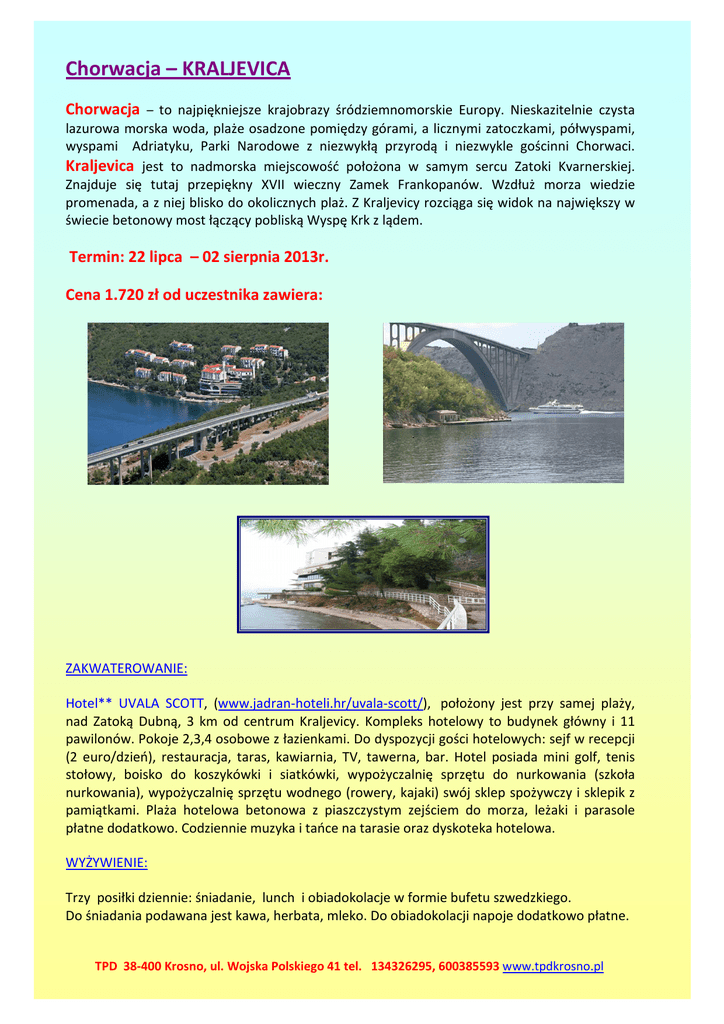 Chorwacja – KRALJEVICA Chorwacja – to najpiękniejsze krajobrazy śródziemnomorskie Europy. Nieskazitelnie czysta lazurowa morska woda, plaże osadzone pomiędzy górami, a licznymi zatoczkami, półwyspami, wyspami Adriatyku, Parki Narodowe z niezwykłą przyrodą i niezwykle gościnni Chorwaci. Kraljevica jest to nadmorska miejscowość położona w samym sercu Zatoki Kvarnerskiej. Znajduje się tutaj przepiękny XVII wieczny Zamek Frankopanów. Wzdłuż morza wiedzie promenada, a z niej blisko do okolicznych plaż. Z Kraljevicy rozciąga się widok na największy w świecie betonowy most łączący pobliską Wyspę Krk z lądem. Termin: 22 lipca – 02 sierpnia 2013r. Cena 1.720 zł od uczestnika zawiera: ZAKWATEROWANIE: Hotel** UVALA SCOTT, (www.jadran-hoteli.hr/uvala-scott/), położony jest przy samej plaży, nad Zatoką Dubną, 3 km od centrum Kraljevicy. Kompleks hotelowy to budynek główny i 11 pawilonów. Pokoje 2,3,4 osobowe z łazienkami. Do dyspozycji gości hotelowych: sejf w recepcji (2 euro/dzień), restauracja, taras, kawiarnia, TV, tawerna, bar. Hotel posiada mini golf, tenis stołowy, boisko do koszykówki i siatkówki, wypożyczalnię sprzętu do nurkowania (szkoła nurkowania), wypożyczalnię sprzętu wodnego (rowery, kajaki) swój sklep spożywczy i sklepik z pamiątkami. Plaża hotelowa betonowa z piaszczystym zejściem do morza, leżaki i parasole płatne dodatkowo. Codziennie muzyka i tańce na tarasie oraz dyskoteka hotelowa. WYŻYWIENIE: Trzy posiłki dziennie: śniadanie, lunch i obiadokolacje w formie bufetu szwedzkiego. Do śniadania podawana jest kawa, herbata, mleko. Do obiadokolacji napoje dodatkowo płatne. TPD 38-400 Krosno, ul. Wojska Polskiego 41 tel. 134326295, 600385593 www.tpdkrosno.pl PROGRAM IMPREZY: dzień 1 – wyjazd z Krosna w godzinach popołudniowych, przez Słowację, Węgry, dzień 2 - przyjazd do ośrodka w godzinach południowych, zakwaterowanie, zwiedzanie okolicy, obiadokolacja, wieczorek integracyjny, dzień 3 - wypoczynek nad morzem, gry i zabawy sportowe ( rozgrywki w piłkę plażową, koszykówkę), dzień 4 - całodniowa wycieczka do Rijeki, zwiedzanie miasta, dzień 5 - wypoczynek nad morzem, plażowanie, gry i zabawy terenowe, wakacyjna rewia mody, dzień 6 – wycieczka po wyspie Krk, plażowanie w kurorcie Baska, dzień 7 - wypoczynek nad morzem (konkursy i zabawy na świeżym powietrzu) dzień 8 - całodniowa wycieczka na Plitwickie Jeziora, wieczór przy muzyce dzień 9 - wypoczynek nad morzem wieczorny wyjazd do Crikvenicy, dzień 10 - wypoczynek nad morzem, wieczorem zajęcia świetlicowe – prezentacje artystyczne grup, wieczór zagadek i quizów dzień 11 - śniadanie, wyjazd z ośrodka w drodze powrotnej spacer po Budapeszcie oraz obiadokolacja, dzień 12 - przejazd przez Węgry, Słowację, do Polski przyjazd w godzinach rannych. OPIEKĘ KADRY PEDAGOGICZNEJ I PILOTA UBEZPIECZENIE (NNW i KL) TRANSPORT (autokar o podwyższonym standardzie) Ważne informacje. Należy zabrać krem z filtrami UV, maść na oparzenia słoneczne, nakrycie głowy, okulary przeciwsłoneczne, odpowiednie obuwie do kąpieli morskich. UWAGA!! Wymagany ważny paszport lub dowód osobisty. TPD 38-400 Krosno, ul. Wojska Polskiego 41 tel. 134326295, 600385593 www.tpdkrosno.pl