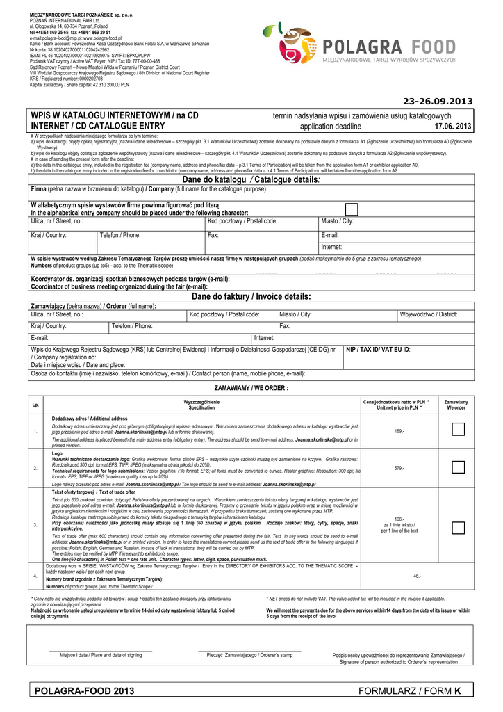 MIĘDZYNARODOWE TARGI POZNAŃSKIE sp. z o. o. POZNAŃ INTERNATIONAL FAIR Ltd. ul. Głogowska 14, 60-734 Poznań, Poland tel +48/61 869 25 65; fax +48/61 869 29 51 e-mail:[email protected]; www.polagra-food.pl Konto / Bank account: Powszechna Kasa Oszczędności Bank Polski S.A. w Warszawie o/Poznań Nr konta: 38 102040270000110204242962 IBAN: PL 46 102040270000140210929075, SWIFT: BPKOPLPW Podatnik VAT czynny / Active VAT Payer, NIP / Tax ID: 777-00-00-488 Sąd Rejonowy Poznań – Nowe Miasto i Wilda w Poznaniu / Poznan District Court VIII Wydział Gospodarczy Krajowego Rejestru Sądowego / 8th Division of National Court Register KRS / Registered number: 0000202703 Kapitał zakładowy / Share capital: 42 310 200,00 PLN 23-26.09.2013 WPIS W KATALOGU INTERNETOWYM / na CD INTERNET / CD CATALOGUE ENTRY termin nadsyłania wpisu i zamówienia usług katalogowych application deadline 17.06. 2013 # W przypadkach nadesłania niniejszego formularza po tym terminie: a) wpis do katalogu objęty opłatą rejestracyjną (nazwa i dane teleadresowe – szczegóły pkt. 3.1 Warunków Uczestnictwa) zostanie dokonany na podstawie danych z formularza A1 (Zgłoszenie uczestnictwa) lub formularza A0 (Zgłoszenie Wystawcy) b) wpis do katalogu objęty opłatą za zgłoszenie współwystawcy (nazwa i dane teleadresowe – szczegóły pkt. 4.1 Warunków Uczestnictwa) zostanie dokonany na podstawie danych z formularza A2 (Zgłoszenie współwystawcy). # In case of sending the present form after the deadline: a) the data in the catalogue entry, included in the registration fee (company name, address and phone/fax data – p.3.1 Terms of Participation) will be taken from the application form A1 or exhibitor application A0, b) the data in the catalogue entry included in the registration fee for co-exhibitor (company name, address and phone/fax data – p.4.1 Terms of Participation) will be taken from the application form A2. Dane do katalogu / Catalogue details: Firma (pełna nazwa w brzmieniu do katalogu) / Company (full name for the catalogue purpose): W alfabetycznym spisie wystawców firma powinna figurować pod literą: In the alphabetical entry company should be placed under the following character: Ulica, nr / Street, no.: Kod pocztowy / Postal code: Kraj / Country: Telefon / Phone: Miasto / City: Fax: E-mail: Internet: W spisie wystawców według Zakresu Tematycznego Targów proszę umieścić naszą firmę w następujących grupach (podać maksymalnie do 5 grup z zakresu tematycznego) Numbers of product groups (up to5) - acc. to the Thematic scope) …………… …………… …………… …………… …………… Koordynator ds. organizacji spotkań biznesowych podczas targów (e-mail): Coordinator of business meeting organized during the fair (e-mail): Dane do faktury / Invoice details: Zamawiający (pełna nazwa) / Orderer (full name): Ulica, nr / Street, no.: Kraj / Country: Kod pocztowy / Postal code: Miasto / City: Telefon / Phone: Województwo / District: Fax: E-mail: Internet: Wpis do Krajowego Rejestru Sądowego (KRS) lub Centralnej Ewidencji i Informacji o Działalności Gospodarczej (CEIDG) nr / Company registration no: Data i miejsce wpisu / Date and place: Osoba do kontaktu (imię i nazwisko, telefon komórkowy, e-mail) / Contact person (name, mobile phone, e-mail): NIP / TAX ID/ VAT EU ID: ZAMAWIAMY / WE ORDER : Wyszczególnienie Specification Lp. 1. Cena jednostkowa netto w PLN * Unit net price in PLN * Dodatkowy adres / Additional address Dodatkowy adres umieszczany jest pod głównym (obligatoryjnym) wpisem adresowym. Warunkiem zamieszczenia dodatkowego adresu w katalogu wystawców jest jego przesłanie pod adres e-mail: [email protected] lub w formie drukowanej. Zamawiamy We order 169,- The additional address is placed beneath the main address entry (obligatory entry). The address should be send to e-mail address: [email protected] or in printed version. 2. 3. 4. Logo Warunki techniczne dostarczania logo: Grafika wektorowa: format plików EPS – wszystkie użyte czcionki muszą być zamienione na krzywe. Grafika rastrowa: Rozdzielczość 300 dpi, format EPS, TIFF, JPEG (maksymalna utrata jakości do 20%). Technical requirements for logo submissions: Vector graphics: File format: EPS; all fonts must be converted to curves. Raster graphics: Resolution: 300 dpi; file formats: EPS, TIFF or JPEG (maximum quality loss up to 20%). Logo należy przesłać pod adres e-mail: [email protected] / The logo should be send to e-mail address: [email protected] Tekst oferty targowej / Text of trade offer Tekst (do 600 znaków) powinien dotyczyć Państwa oferty prezentowanej na targach. Warunkiem zamieszczenia tekstu oferty targowej w katalogu wystawców jest jego przesłanie pod adres e-mail: [email protected] lub w formie drukowanej. Prosimy o przesłanie tekstu w języku polskim oraz w miarę możliwości w języku angielskim niemieckim i rosyjskim w celu zachowania poprawności tłumaczeń. W przypadku braku tłumaczeń, zostaną one wykonane przez MTP. Redakcja katalogu zastrzega sobie prawo do korekty tekstu niezgodnego z tematyką targów i charakterem katalogu. Przy obliczaniu należności jako jednostkę miary stosuje się 1 linię (60 znaków) w języku polskim. Rodzaje znaków: litery, cyfry, spacje, znaki interpunkcyjne. Text of trade offer (max 600 characters) should contain only information concerning offer presented during the fair. Text in key words should be send to e-mail address: [email protected] or in printed version. In order to keep the translations correct please send us the text of trade offer in the following languages if possible: Polish, English, German and Russian. In case of lack of translations, they will be carried out by MTP. The entries may be verified by MTP if irrelevant to exhibition’s scope. One line (60 characters) in Polish text = one rate unit. Character types: letter, digit, space, punctuation mark. Dodatkowy wpis w SPISIE WYSTAWCÓW wg Zakresu Tema