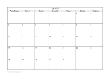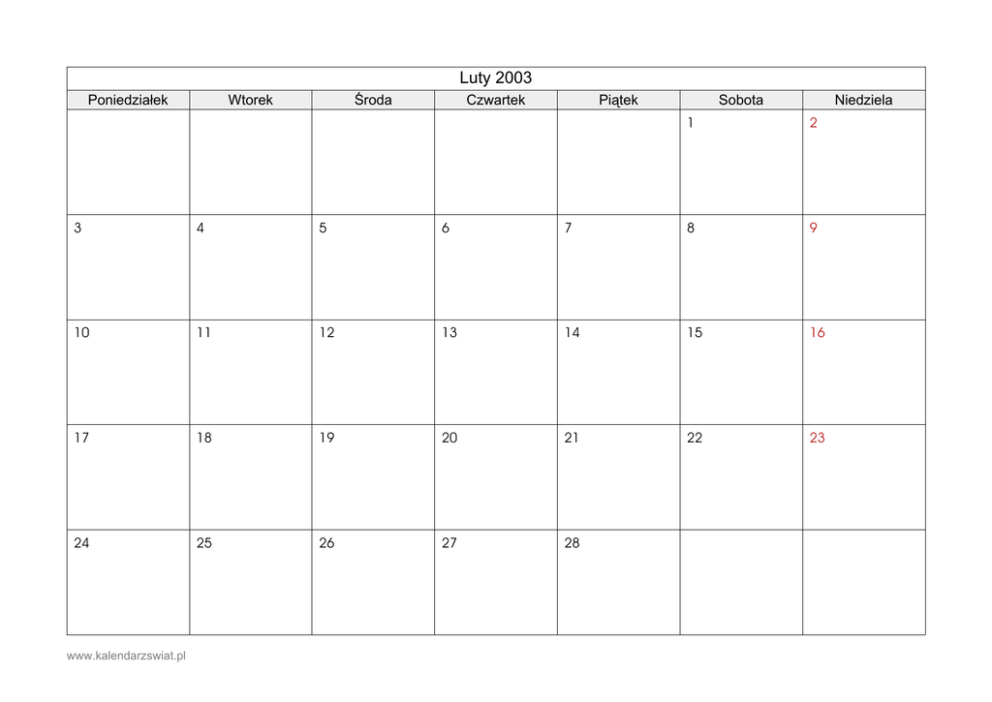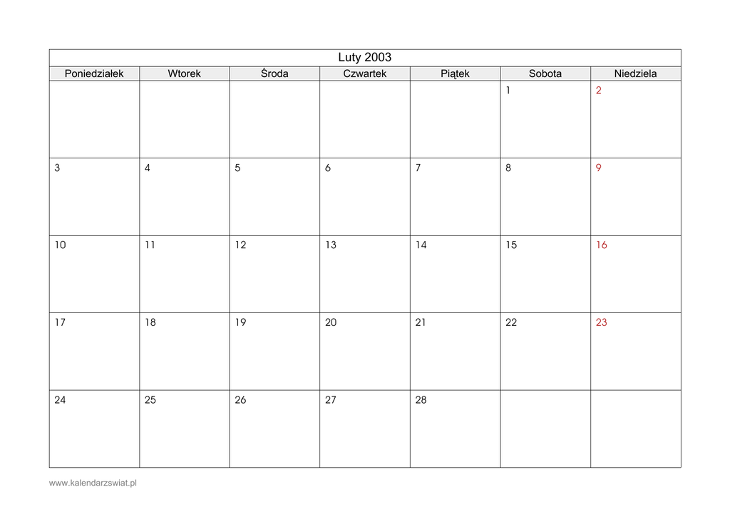 Luty 2003 Poniedziałek Wtorek Środa Czwartek Piątek Sobota Niedziela 1 2 3 4 5 6 7 8 9 10 11 12 13 14 15 16 17 18 19 20 21 22 23 24 25 26 27 28 www.kalendarzswiat.pl