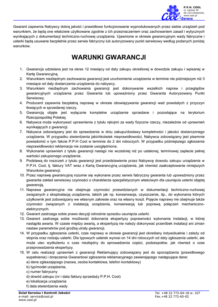 P.P.H. COOL ul. Lipowa 10 05-123 Chotomów www.cool.pl Serwis Gwarant zapewnia Nabywcy dobrą jakość i prawidłowe funkcjonowanie wyprodukowanych przez siebie urządzeń pod warunkiem, że będą one właściwie użytkowane zgodnie z ich przeznaczeniem oraz zachowaniem zasad i wytycznych wynikających z dokumentacji techniczno-ruchowej urządzenia. Ujawnione w okresie gwarancyjnym wady fabryczne i usterki będą usuwane bezpłatnie przez serwis fabryczny lub autoryzowany punkt serwisowy według podanych poniżej warunków. WARUNKI GWARANCJI 1. Gwarancja udzielana jest na okres 12 miesięcy od daty zakupu określonej w dowodzie zakupu i wpisanej w Kartę Gwarancyjną. 2. Warunkiem niezbędnym zachowania gwarancji jest uruchomienie urządzenia w terminie nie późniejszym niż 3 miesiące od daty dostarczenia urządzenia do nabywcy. 3. Warunkiem niezbędnym zachowania gwarancji jest dokonywanie wszelkich napraw i przeglądów gwarancyjnych urządzenia przez Gwaranta lub upoważniony przez Gwaranta Autoryzowany Punkt Serwisowy. 4. Producent zapewnia bezpłatną naprawę w okresie obowiązywania gwarancji wad powstałych z przyczyn tkwiących w sprzedanej rzeczy. 5. Gwarancją objęte jest wyłącznie kompletne urządzenie sprzedane i pozostające na terytorium Rzeczpospolitej Polskiej. 6. Nabywca może wykonywać uprawnienia z tytułu rękojmi za wady fizyczne rzeczy, niezależnie od uprawnień wynikających z gwarancji. 7. Nabywca zobowiązany jest do sprawdzenia w dniu zakupu/dostawy kompletności i jakości dostarczonego urządzenia. W przypadku stwierdzenia jakichkolwiek nieprawidłowości, Nabywca zobowiązany jest pisemnie powiadomić o tym fakcie P.P.H Cool w terminie do 2 dni roboczych. W przypadku późniejszego zgłoszenia nieprawidłowości reklamacja nie zostanie uwzględniona. 8. Wykonanie uprawnień z tytułu gwarancji nastąpi nie wcześniej niż po ustalonej, terminowej zapłacie pełnej wartości zakupionego urządzenia. 9. Podstawą do roszczeń z tytułu gwarancji jest przedstawienie przez Nabywcę dowodu zakupu urządzenia w P.P.H. Cool, tj. faktury VAT wraz z Kartą Gwarancyjną urządzenia, jak również zaakceptowanie niniejszych Warunków gwarancji. 10. Przez naprawę gwarancyjną rozumie się wykonane przez serwis fabryczny gwaranta lub upoważniony przez gwaranta zakład serwisowy czynności o charakterze specjalistycznym właściwym dla usunięcia usterki objętej gwarancją. 11. Naprawa gwarancyjna nie obejmuje czynności przewidzianych w dokumentacji techniczno-ruchowej związanych z eksploatacją urządzenia, takich jak np. konserwacja, czyszczenie, itp., do wykonania których użytkownik jest zobowiązany we własnym zakresie oraz na własny koszt. Pojęcie naprawy nie obejmuje także czynności związanych z instalacją urządzenia, konserwacją lub poprawą połączeń mechanicznoelektrycznych. 12. Gwarant zastrzega sobie prawo decyzji odnośnie sposobu usunięcia usterki. 13. Gwarant zastrzega sobie możliwość dokonania ekspertyzy poprawności wykonania instalacji, w której nastąpiła awaria. W czasie między awarią, a ekspertyzą nie należy dokonywać przeróbek instalacji ani zmian nastaw parametrów pod groźbą utraty gwarancji. 14. W przypadku zgłoszenia usterki, czas naprawy w okresie gwarancji jest określany indywidualnie i zależy od stopnia oraz rodzaju usterki. Dla typowych usterek wynosi on 14 dni roboczych od daty zgłoszenia usterki, ale może ulec wydłużeniu o czas niezbędny do sprowadzenia części, podzespołów, jak również o czas przeprowadzenia ekspertyzy. 15. W celu realizacji uprawnień z gwarancji Reklamujący zobowiązany jest do sporządzenia (prawidłowego wypełnienia) i doręczenia Gwarantowi zgłoszenia reklamacyjnego zawierającego następujące dane: a) dane zgłaszającego (nazwa, osoba kontaktowa, telefon kontaktowy) b) typ/model urządzenia, c) numer fabryczny d) dowód zakupu (nr i data faktury sprzedaży P.P.H. Cool) e) lokalizacja urządzenia f) data stwierdzenia wady Dział Serwisu i Kontroli Jakości e-mail: [email protected] www.cool.pl Tel. +48 22 772-64-18 w. 107 Fax.+48 22 772-65-02 P.P.H. COOL ul. Lipowa 10 05-123 Chotomów www.cool.pl 16. 17. 18. 19. 20. 21. 22. 23. 24. 25. 26. 27. 28. 29. Serwis g) opis wady h) inne według szablonu zgłoszenia reklamacyjnego. Gwarancją producenta nie są objęte uszkodzenia powstałe w wyniku: a) transportu przez Kupującego b) niewłaściwego lub niezgodnego z dokumentacją montażu, użytkowania lub konserwacji c) nieprzestrzegania wytycznych zawartych w dokumentacji techniczno-ruchowej d) uszkodzenia mechaniczne i wywołane nimi wady e) użycia niewłaściwych materiałów eksploatacyjnych (oleje, filtry itp.) f) czynności związanych z wymianą elementów ulegających naturalnemu zużyciu wymienionych w dokumentacji techniczno-ruchowej należących do normalnej eksploatacji urządzenia (czyszczenie, wymiana wkładów i filtrów, olejów itp.) g) uszkodzenia spowodowane czynnikami zewnętrznymi niezależnymi od producenta (np. przepięcia w instalacji, powodzie, wyładowania atmosferyczne) h) uszkodzenia spowodowane błędnym doborem urządzenia i) uszkodzenia lub nieprawidłowe działanie spowodowane błędnym lub wadliwym montażem urządzenia. Uprawnionym do roszczeń z tytułu gwarancji jest bezpośredni Nabywca urządzenia zakupionego w P.P.H. Cool, na którego została wystawiona faktura VAT. Gwarant może odmówić nieodpłatnej naprawy w przypadku: a) stwierdzenia niezgodności danych w dokumentach z danymi na urządzeniu b) naruszenia plomb c) naruszenia postanowień zawartych w Karcie Gwarancyjnej d) eksploatacji urządzenia niezgodnie z przeznaczeniem i dokumentacją techniczno-ruchową e) braku akceptacji niniejszych warunków gwarancji. Gwarancja wygasa w przypadku dokonania napraw, przeróbek i zmian konstrukcyjnych przeprowadzonych samodzielnie lub przez inne osoby i podmioty do tego nieupoważnione. Gwarancją nie są objęte urządzenia, któ
