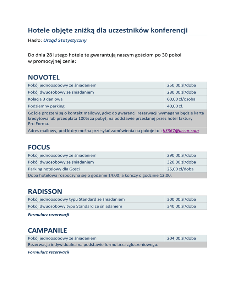 Hotele objęte zniżką dla uczestników konferencji Hasło: Urząd Statystyczny Do dnia 28 lutego hotele te gwarantują naszym gościom po 30 pokoi w promocyjnej cenie: NOVOTEL Pokój jednoosobowy ze śniadaniem 250,00 zł/doba Pokój dwuosobowy ze śniadaniem 280,00 zł/doba Kolacja 3 daniowa 60,00 zł/osoba Podziemny parking 40,00 zł. Goście proszeni są o kontakt mailowy, gdyż do gwarancji rezerwacji wymagana będzie karta kredytowa lub przedpłata 100% za pobyt, na podstawie przesłanej przez hotel faktury Pro Forma. Adres mailowy, pod który można przesyłać zamówienia na pokoje to : [email protected] FOCUS Pokój jednoosobowy ze śniadaniem 290,00 zł/doba Pokój dwuosobowy ze śniadaniem 320,00 zł/doba Parking hotelowy dla Gości 25,00 zł/doba Doba hotelowa rozpoczyna się o godzinie 14:00, a kończy o godzinie 12:00. RADISSON Pokój jednoosobowy typu Standard ze śniadaniem 300,00 zł/doba Pokój dwuosobowy typu Standard ze śniadaniem 340,00 zł/doba Formularz rezerwacji CAMPANILE Pokój jednoosobowy ze śniadaniem Rezerwacja indywidualna na podstawie formularza zgłoszeniowego. Formularz rezerwacji 204,00 zł/doba ! ) "#$ %#$ "%&' *& + ' , &- . + / " " " " " " " " " " " " " " " " " " " " " " " " " " " " " " " " " " " " " " " " " " " " " " " " " " " " " " " " " " " " " " " " " " " " " " 0 " " " " " " " " " " " " " " " " " " " " " " " " " " " " " " " " " " " " " " " " " " " " " " " " " " " " " " " " " " " " " " " " " " " " " " " " " " " " " " " " " " " " " " " " " " " " " " " " " " " " " " " " " " " " " " " " " " " " " " " " " " " " " " " " " " " " " " " " " " " " " " ., " " " " " " " " " " " " " " " " " " " " " " " " " " " " " " " " " " " " " " " " " " " " " " " " " " " " " " " " " " " " " " " " " " " " " " " 1 & " " " " " " " " " " " " " " " " " " " " " " " " " " " " " " " " " " " " " " " " " " " " " " " " " " " " " " " " " " " " " " " " " " " " " " " .% & ! *% " " " " " " " " " " " " " " " " " " " " " " " " " " " " " " " " " " " " " " " " " " " " " " " " " " " " " " " " " " " " " " " " " " " " " " " .% & */% " " " " " " " " " " " " " " " " " " " " " " " " " " " " " " " " " " " " " " " " " " " " " " " " " " " " " " " " " " " " " " " " " " " " " " " , &- " " " " " " " " " " " " " " " " " " " " " " " " " " " " " " " " " " " " " " " " " " " " " " " " " " " " " " " " " " " " " " " " " " + / 23 ' " " " " " " " " " " " " " " " " " " " " " " " " " " " " " " " " " " " " " " " " " " " " " " " " " " " " " " " " " " " " " " " " " " " " " " " ) !4 5 6 % " " " " " " " " " " " " " " " " " " " " " " " " " " " " " " " " " " " " " " " " " " " ) ! +5 6 %" " " " " " " " " " " " " " " " " " " " " " " " " " " " " 6! 5 44 /6 % 4/ 76 6 $ +5! 5 4 %! + #%% ( $4/ 76+% $ +5! 5 4 %! + #)% ( $4/ 76+% $ +5! 5 4 %! 8, .+ #)% ( 4/ 76 6 $ +5! 5 4% % 4 4/ 76+% $ +5! 5 4 % %4 4/ 76+% $ +5! 5 4 % %4 + #*% ( $+ )%% ( $8, .+ )%% ( $- 4/ 76 6 $ +5! 5 4%9% 4/ 76+% $ +5! 5 4 %9% 4/ 76+% $ +5! 5 4 %9% ) $ (! + 5 : : : + )%% ( $+ ))% ( $8, .+ ))% ( $- - 2 + %4 5 6 % /; 5 2 &5 2 + !+ 4 +5 = 6 + 64 6 > 4 4! 5 / ! (! % &*$ %#$"%&' +4 %+ " ! " < + %+5 6 % " /! 5/ 5 !+ 6%$ / %6 > ? +5 & +5 4 / %4 +5 = + 6 ! # $%" & $%" &' (! !" # &' ' '( ) ! * # + * !"% " 0 # + # ,% -/.1 # * - - $ ,' - "% . # / . 6 /! 5/ 5 !+ 6 " " " " " " " " " " " " " " " " " " " " " " " " " " " " " " " " " " " " " " " " " " " " " " " " " " " " " " " " " " " " " " " " " " " " " " " " " .% & /! 5/ 5 !+ 6 " " " " " " " " " " " " " " " " " " " " " " " " " " " " " " " " " " " " " " " " " " " " " " " " " " " " " " " " " " " " " " " " " " " " " " " " " ) !+ = 3 " " " " " " " " " " " " " " " " " " " " " " " " " " " " " " " " " " " " " " " " " " " " " " " " " " " " " " " " " " " " " " " " " " " " " " " " " + ,( < @ 9, : :98 8 - &*$ %#$ "%&' $ ! 5 &! & $> = ++5 /3 ? . / 5B 3 C4 / D " E= + 6 ! +5 / 5! %$ % + / +! >++5 /3 ?+ !3 &7+ " &5 4 ! " * &% # 2 +2 $% "& % $*B 121 3 456 4 3 47 4 6 1 889 , 0/ ! 7 4! 5 &! & 6 47F 6 "" < !5 % + &+ 6 >5 / % A ! B 3 C $> = 5 & " : +: +:83 ; 1 <21 ; + 212 :81 FORMULARZ REZERWACJI DOTYCZĄCY REZERWACJI POKOI W HOTELU CAMPANILE SZCZECIN NA HASŁO „URZĄD STATYSTYCZNY” W TERMINIE 23/24.03.2015. 1. 2. 3. 4. 5. Imię i nazwisko Gościa: …………………………………………………………………………………………… Termin pobytu: ………………………………………………………………………………………………………. Telefon kontaktowy: ………………………………………………………………………………………………. Adres e-mail: ………………………………………………………………………………………………………….. Rezerwacja zostanie opłacona (właściwe pole proszę zakreślić): ◊ kartą kredytową/płatniczą ◊ przelewem 6. Rezerwacja dotyczy: ◊ pokoju jednoosobowy w cenie 204,00 PLN ze śniadaniem/doba 7. Dane do faktury VAT: ………………………………………………………………………………………………. 8. Imię i nazwisko osoby dokonującej rezerwacji: ………………………………………………………… WARUNKI REZERWACJI 1. Rezerwacja na podstawie powyższego formularza musi zostać przesłana do hotelu mailowo lub faxem najpóźniej do dnia 28 lutego 2014. 2. Każda rezerwacja musi zostać zagwarantowana kartą kredytową lub poprzez dokonanie wpłaty na konto hotelu w wysokości 100% wartości rezerwacji. 3. Bezkosztowa anulacja rezerwacji możliwa jest do dnia 28 lutego 2014. 4. Anulacja po wyznaczonym terminie wiąże się z brakiem możliwości odzyskania wpłaconych środków. 5. W przypadku anulowania rezerwacji do dnia 28 lutego 2014 Hotel oświadcza, iż zwróci 100% wpłaconych środków pieniężnych Zamawiającemu. OPIEKUN WYDARZENIA ZE STRONY HOTELU 1. 2. 3. 4. Imię i nazwisko: Karolina Młynek Telefon kontaktowy: 91 481 77 00 Fax: 91 481 77 01 Adres e-mail: [email protected]
