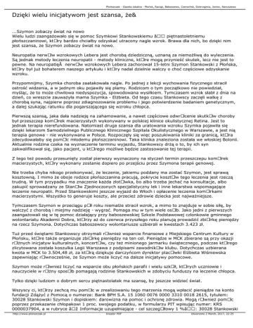 Płońszczak - Gazeta lokalna - Płońsk, Raciąż, Baboszewo, Czerwińsk, Dzierzążnia, Joniec, Naruszewo Dzięki wielu inicjatywom jest szansa, że& ...Szymon zobaczy świat na nowo Wielu ludzi zaangażowało się w pomoc Szymkowi Stankowskiemu – piętnastoletniemu płońszczaninowi, ktÃłry bardzo chciałby odzyskać utracony nagle wzrok. Brawa dla nich, bo dzięki nim jest szansa, że Szymon zobaczy świat na nowo. Neuropatia nerwÃłw wzrokowych Lebera jest chorobą dziedziczną, uznaną za niemożliwą do wyleczenia. Są jednak metody leczenia neuropatii - metody kliniczne, ktÃłre mogą przynieść skutek, lecz nie jest to pewne. Na neuropatię nerwÃłw wzrokowych Lebera zachorował 15-letni Szymon Stankowski z Płońska, ktÃłry był już bohaterem naszego artykułu i ktÃłry nadal dzielnie walczy o choć częściowe odzyskanie wzroku. Przypomnijmy, Szymka choroba zaatakowała nagle. Po jednej z lekcji wychowania fizycznego stracił ostrość widzenia, a w jednym oku pojawiły się plamy. Rodzicom o tym początkowo nie powiedział, myśląc, że to może chwilowa niedyspozycja, spowodowana wysiłkiem. Tymczasem wzrok słabł z dnia na dzień, co wreszcie zauważyła mama Szymka - Elżbieta. Od tego czasu Stankowscy zaczęli walkę z chorobą syna, najpierw poprzez zdiagnozowanie problemu i jego potwierdzenie badaniem genetycznym, a dalej szukając ratunku dla pogarszającego się wzroku chłopca. Pierwszą szansą, jaka dała nadzieję na zahamowanie, a nawet częściowe odwrÃłcenie skutkÃłw choroby był przeszczep komÃłrek macierzystych wykonywany w polskiej klinice okulistycznej Retina. Jest to jednak terapia nierefundowana. Natomiast druga szansa dla uratowania wzroku Szymka pojawiła się dzięki lekarzom Samodzielnego Publicznego Klinicznego Szpitala Okulistycznego w Warszawie, a jest nią terapia genowa - nie wykonywana w Polsce. Rozpoczęły się więc poszukiwania kliniki za granicą, ktÃłra zdecydowałaby się pomÃłc młodemu płońszczaninowi. Taka klinika znaleziona została we włoskiej Bolonii. Aktualnie rodzina czeka na wyznaczenie terminu wyjazdu, Stankowscy drżą o to, by ich syn zakwalifikował się, jako pacjent, u ktÃłrego możliwe będzie zastosowanie tej terapii. Z tego też powodu przesunięty został pierwszy wyznaczony na styczeń termin przeszczepu komÃłrek macierzystych, ktÃłry wykonany zostanie dopiero po przejściu przez Szymona terapii genowej. Nie trzeba chyba nikogo przekonywać, że leczenie, jakiemu poddany ma zostać Szymon, jest sprawą kosztowną. I mimo że oboje rodzice płońszczanina pracują, pokrycie kosztÃłw tego leczenia jest rzeczą trudną. W tym przypadku ma znaczenie każda złotÃłwka, bo albo trzeba jechać na konsultacje, albo zakupić sprowadzany ze StanÃłw Zjednoczonych specjalistyczny lek i inne lekarstwa wspomagające leczenie neuropatii. Przed Stankowskimi jeszcze wyjazd do Włoch i opłacenie leczenia komÃłrkami macierzystymi. Wszystko to generuje koszty, ale przecież zdrowie dziecka jest najważniejsze. Tymczasem Szymon w przeciągu pÃłł roku niemalże stracił wzrok, a mimo to znajduje w sobie siłę, by walczyć z chorobą i miejmy nadzieję - wygrać. Pomaga mu w tym wiele osÃłb. Jako jedni z pierwszych zaangażowali się w tę pomoc działający przy baboszewskiej Szkole Podstawowej czlonkowie gminnego wolontariatu Akademii Dobra, ktÃłrzy aż do czerwca przyszłego roku planują prowadzić zbiÃłrkę pieniędzy na rzecz Szymona. Dotychczas baboszewscy wolontariusze uzbierali w kwestach 3.423 zł. Tuż przed świętami Stankowscy otrzymali rÃłwnież wsparcie finansowe z Miejskiego Centrum Kultury w Płońsku, ktÃłre także organizuje zbiÃłrkę pieniędzy na ten cel. Pieniądze w MCK zbierane są przy okazji rÃłżnych inicjatyw kulturalnych, koncertÃłw, czy też minionego jarmarku świątecznego, podczas ktÃłrego zlicytowana została koszulka Legii Warszawa z podpisami zawodnikÃłw klubu. Dotychczas uzbierana kwota w MCK to 3.504,48 zł, za ktÃłrą dziękuje darczyńcom dyrektor placÃłwki Elżbieta Wiśniewska zapewniając rÃłwnocześnie, że Szymon może liczyć na dalsze inicjatywy pomocowe. Szymon może rÃłwnież liczyć na wsparcie obu płońskich parafii i wielu szkÃłł, ktÃłrych uczniowie i nauczyciele w rÃłżny sposÃłb pomagają rodzinie Stankowskich w zdobyciu funduszy na leczenie chłopca. Tylko dzięki ludziom o dobrym sercu piętnastolatek ma szansę, by jeszcze widzieć świat. Wszyscy ci, ktÃłrzy zechcą mu pomÃłc w zrealizowaniu tego marzenia mogą wpłacić pieniądze na konto fundacji Zdążyć z Pomocą o numerze: Bank BPH S.A. 15 1060 0076 0000 3310 0018 2615, tytułem: 30028 Stankowski Szymon i dopiskiem: darowizna na pomoc i ochronę zdrowia. Mogą rÃłwnież pomÃłc poprzez przekazanie chłopakowi 1 proc. swojego podatku, w formularzu PIT wpisując numer: KRS 0000037904, a w rubryce „Informacje uzupełniające - cel szczegÃłłowy 1 %―: 30028 Stankowski http://www.plonszczak.pl Kreator PDF Utworzono 2 March, 2017, 22:25 Płońszczak - Gazeta lokalna - Płońsk, Raciąż, Baboszewo, Czerwińsk, Dzierzążnia, Joniec, Naruszewo Szymon. Anna PiÃłrkowska foto: Anna PiÃłrkowska http://www.plonszczak.pl Kreator PDF Utworzono 2 March, 2017, 22:25