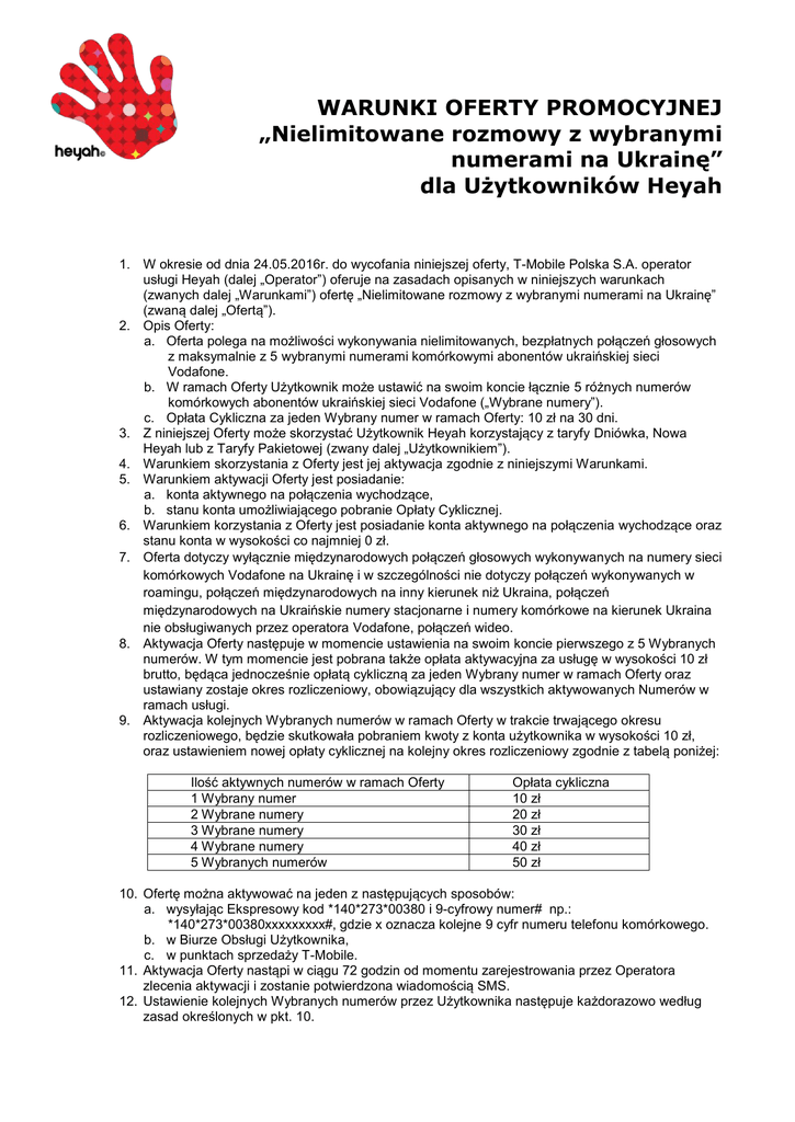 WARUNKI OFERTY PROMOCYJNEJ „Nielimitowane rozmowy z wybranymi numerami na Ukrainę” dla Użytkowników Heyah 1. W okresie od dnia 24.05.2016r. do wycofania niniejszej oferty, T-Mobile Polska S.A. operator usługi Heyah (dalej „Operator”) oferuje na zasadach opisanych w niniejszych warunkach (zwanych dalej „Warunkami”) ofertę „Nielimitowane rozmowy z wybranymi numerami na Ukrainę” (zwaną dalej „Ofertą”). 2. Opis Oferty: a. Oferta polega na możliwości wykonywania nielimitowanych, bezpłatnych połączeń głosowych z maksymalnie z 5 wybranymi numerami komórkowymi abonentów ukraińskiej sieci Vodafone. b. W ramach Oferty Użytkownik może ustawić na swoim koncie łącznie 5 różnych numerów komórkowych abonentów ukraińskiej sieci Vodafone („Wybrane numery”). c. Opłata Cykliczna za jeden Wybrany numer w ramach Oferty: 10 zł na 30 dni. 3. Z niniejszej Oferty może skorzystać Użytkownik Heyah korzystający z taryfy Dniówka, Nowa Heyah lub z Taryfy Pakietowej (zwany dalej „Użytkownikiem”). 4. Warunkiem skorzystania z Oferty jest jej aktywacja zgodnie z niniejszymi Warunkami. 5. Warunkiem aktywacji Oferty jest posiadanie: a. konta aktywnego na połączenia wychodzące, b. stanu konta umożliwiającego pobranie Opłaty Cyklicznej. 6. Warunkiem korzystania z Oferty jest posiadanie konta aktywnego na połączenia wychodzące oraz stanu konta w wysokości co najmniej 0 zł. 7. Oferta dotyczy wyłącznie międzynarodowych połączeń głosowych wykonywanych na numery sieci komórkowych Vodafone na Ukrainę i w szczególności nie dotyczy połączeń wykonywanych w roamingu, połączeń międzynarodowych na inny kierunek niż Ukraina, połączeń międzynarodowych na Ukraińskie numery stacjonarne i numery komórkowe na kierunek Ukraina nie obsługiwanych przez operatora Vodafone, połączeń wideo. 8. Aktywacja Oferty następuje w momencie ustawienia na swoim koncie pierwszego z 5 Wybranych numerów. W tym momencie jest pobrana także opłata aktywacyjna za usługę w wysokości 10 zł brutto, będąca jednocześnie opłatą cykliczną za jeden Wybrany numer w ramach Oferty oraz ustawiany zostaje okres rozliczeniowy, obowiązujący dla wszystkich aktywowanych Numerów w ramach usługi. 9. Aktywacja kolejnych Wybranych numerów w ramach Oferty w trakcie trwającego okresu rozliczeniowego, będzie skutkowała pobraniem kwoty z konta użytkownika w wysokości 10 zł, oraz ustawieniem nowej opłaty cyklicznej na kolejny okres rozliczeniowy zgodnie z tabelą poniżej: Ilość aktywnych numerów w ramach Oferty 1 Wybrany numer 2 Wybrane numery 3 Wybrane numery 4 Wybrane numery 5 Wybranych numerów Opłata cykliczna 10 zł 20 zł 30 zł 40 zł 50 zł 10. Ofertę można aktywować na jeden z następujących sposobów: a. wysyłając Ekspresowy kod *140*273*00380 i 9-cyfrowy numer# np.: *140*273*00380xxxxxxxxx#, gdzie x oznacza kolejne 9 cyfr numeru telefonu komórkowego. b. w Biurze Obsługi Użytkownika, c. w punktach sprzedaży T-Mobile. 11. Aktywacja Oferty nastąpi w ciągu 72 godzin od momentu zarejestrowania przez Operatora zlecenia aktywacji i zostanie potwierdzona wiadomością SMS. 12. Ustawienie kolejnych Wybranych numerów przez Użytkownika następuje każdorazowo według zasad określonych w pkt. 10. 13. Użytkownik na swoim koncie może mieć jednocześnie ustawionych 5 różnych Wybranych numerów. 14. Użytkownik dokonuje aktywacji kolejnych Wybranych Numerów osobnym zgłoszeniem. 15. Każda aktywacja Wybranego Numeru w ramach Usługi zostanie potwierdzona przez Operatora wiadomością SMS. 16. Użytkownik może dokonać zmiany Wybranych numerów na nowe poprzez wysłanie ekspresowego kodu podając numer, który ma zostać zastąpiony oraz nowy numer, tj. *140*273*00380 i obecny 9-cyfrowy numer*00380 i nowy 9-cyfrowy numer# 17. Opłata za pierwszą zmianę numeru w Ofercie wynosi 0 zł, a opłata za każdą kolejną zmianę numeru wynosi 10 zł. 18. Użytkownik może bezpłatnie usunąć Wybrany numer, co zostanie potwierdzone wiadomością SMS i będzie skutkowało zmianą opłaty cyklicznej w kolejnym cyklu rozliczeniowym. 19. Wybrany numer w ramach Oferty można dezaktywować poprzez wysłanie ekspresowego kodu *140*273*2#, wybierając w menu numer, który ma zostać usunięty lub poprzez wysłanie ekspresowego kodu *140*273*8*00380 i 9-cyfrowy numer# podając numer, który ma zostać usunięty. 20. W przypadku usunięcia wszystkich Wybranych Numerów ustawionych w Usłudze, Usługa ulega automatycznej dezaktywacji. 21. Dezaktywacja Oferty powoduje usunięcie z konta Użytkownika wszystkich ustawionych Wybranych numerów, a poniesione opłaty za Ofertę nie podlegają zwrotowi. 22. Opłata Cykliczna będzie naliczana z góry za okres 30 dni korzystania przez Użytkownika z Oferty, a następnie co 30 dni licząc od daty jej aktywacji pod warunkiem posiadania konta aktywnego na połączenia wychodzące. 23. W przypadku braku środków wystarczających na pobranie Opłaty Cyklicznej za Ofertę możliwość korzystania z niej ulega zawieszeniu na okres do 30 dni, co oznacza zarówno brak pobrania Opłaty Cyklicznej, jak i brak możliwości korzystania z Oferty. Jeśli we wskazanym okresie konto Użytkownika zostanie doładowane i pobrana zostanie Opłata Cykliczna możliwość korzystania z Oferty zostanie odwieszona. Opłata Cykliczna od tej pory będzie naliczana co 30 dni licząc od dnia odwieszenia. W przypadku braku na koncie Użytkownika środków wystarczających na pobranie Opłaty Cyklicznej w okresie 30 dni od momentu jej zawieszenia, Oferta zostanie automatycznie dezaktywowana. 24. Użytkownik może sprawdzić status Oferty w jeden z następujących sposobów: a. wysyłając Ekspresowy kod *140*273*2#, b. w Biurze Obsługi Użytkownika, c. w punktach sprzedaży T-Mobile. 25. Międzynarodowe połączenia głosowe na Ukrainę w pierwszej kolejności rozliczane są w ramach niniejszej Oferty, o ile warunki poszczególnych ofert nie stano