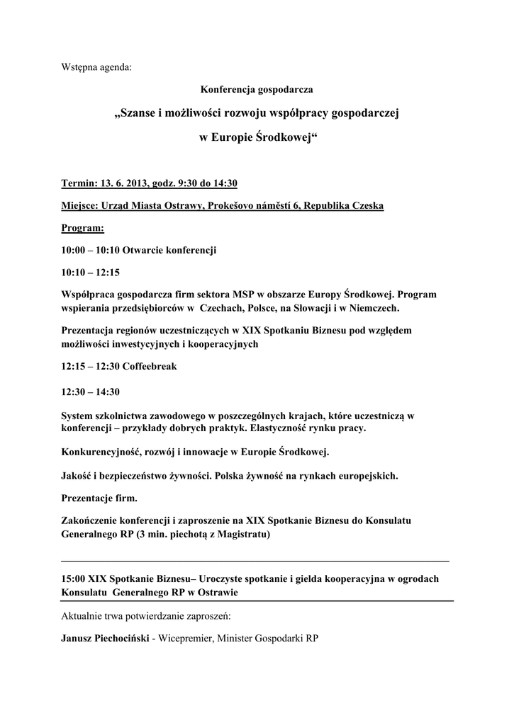 Wstępna agenda: Konferencja gospodarcza „Szanse i możliwości rozwoju współpracy gospodarczej w Europie Środkowej“ Termin: 13. 6. 2013, godz. 9:30 do 14:30 Miejsce: Urząd Miasta Ostrawy, Prokešovo náměstí 6, Republika Czeska Program: 10:00 – 10:10 Otwarcie konferencji 10:10 – 12:15 Współpraca gospodarcza firm sektora MSP w obszarze Europy Środkowej. Program wspierania przedsiębiorców w Czechach, Polsce, na Słowacji i w Niemczech. Prezentacja regionów uczestniczących w XIX Spotkaniu Biznesu pod względem możliwości inwestycyjnych i kooperacyjnych 12:15 – 12:30 Coffeebreak 12:30 – 14:30 System szkolnictwa zawodowego w poszczególnych krajach, które uczestniczą w konferencji – przykłady dobrych praktyk. Elastyczność rynku pracy. Konkurencyjność, rozwój i innowacje w Europie Środkowej. Jakość i bezpieczeństwo żywności. Polska żywność na rynkach europejskich. Prezentacje firm. Zakończenie konferencji i zaproszenie na XIX Spotkanie Biznesu do Konsulatu Generalnego RP (3 min. piechotą z Magistratu) ___________________________________________________________________________ 15:00 XIX Spotkanie Biznesu– Uroczyste spotkanie i gielda kooperacyjna w ogrodach Konsulatu Generalnego RP w Ostrawie Aktualnie trwa potwierdzanie zaproszeń: Janusz Piechociński - Wicepremier, Minister Gospodarki RP Grażyna Maria Bernatowicz –Wiceminister Spraw Zagranicznych RP/ Ambasador RP w RCz Milan Hovorka–Wiceminister Przemysłu i Handlu RCz Jan Sechter– Ambasador RCz w RP Anna Olszewska – Konsul Generalny RP w Ostrawie Detlef Lingemann– Ambasador Republiki Federalnej Niemiec w Pradze Milan Šimandl – przedstawiciel Ambasady RFN w Pradze, specialista ds.gospodarki Petr Brňo – Ambasador Słowacji w RCz Ivo Hanuš – Radca Handlowy Ambasady Słowackiej w Pradze Wojciech Pobóg-Pągowski – I Radca Handlowy Ambasady RP w Pradze Karel Kysilka – Radca Handlowy RCz w Warszawie Juraj Blanár – Przewodniczący Żylińskiego Kraju - Słowacja Józef Szebesta – Marszałek Województwa Opolskiego Ryszard Wilczyński –Wojewoda Opolski Mirosałw Sekuła – Marszałek Województwa Śląskiego Zygmunt Łukaszczyk – Wojewoda Śląski Bernard Bauer – członek zarządu Niemiecko-Czeskiej Izby Przemysłowej-Handlowej w Pradze Jiří Cienciala – Prezes Czesko-Polskiej Izby Handlowej w Ostrawie Ján Mišura – Dyrektor Słowackiej Izby Przemysłowo-Handlowej w Żylinie Pavel Roman – Robert Bosch odbytová s.r.o. Kancelaria Adwokacka Kocián, Šolc, Balaštík Andrzej Gantner – Dyrektor Generalny Federacji Polskich Producentów Żywności Jakub Šebesta – Dyrektor Państwowej Inspekcji Rolno-Spożywczej Republiki Czeskiej Zdeněk Juračka – Prezes Stowarzyszenia Handlu i Turystyki Republiki Czeskiej Agenda jest aktualizowana.