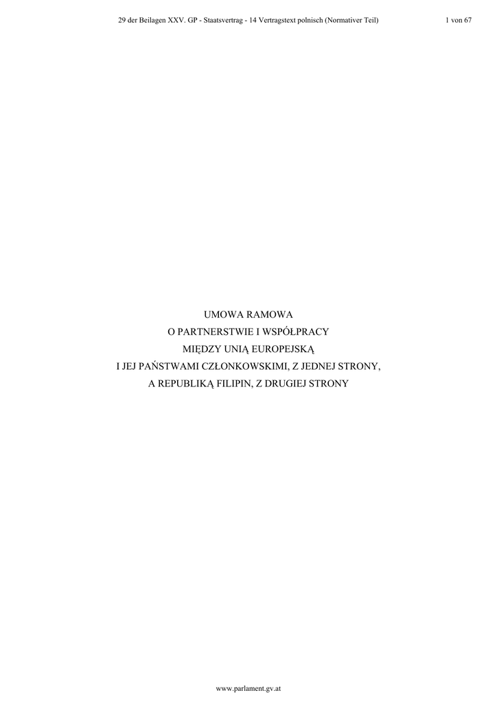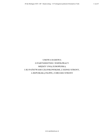 29 der Beilagen XXV. GP - Staatsvertrag - 14 Vertragstext polnisch (Normativer Teil) UMOWA RAMOWA O PARTNERSTWIE I WSPÓŁPRACY MIĘDZY UNIĄ EUROPEJSKĄ I JEJ PAŃSTWAMI CZŁONKOWSKIMI, Z JEDNEJ STRONY, A REPUBLIKĄ FILIPIN, Z DRUGIEJ STRONY www.parlament.gv.at 1 von 67 2 von 67 29 der Beilagen XXV. GP - Staatsvertrag - 14 Vertragstext polnisch (Normativer Teil) UNIA EUROPEJSKA, zwana dalej „Unią”, oraz KRÓLESTWO BELGII, REPUBLIKA BUŁGARII, REPUBLIKA CZESKA, KRÓLESTWO DANII, REPUBLIKA FEDERALNA NIEMIEC, REPUBLIKA ESTOŃSKA, IRLANDIA, REPUBLIKA GRECKA, KRÓLESTWO HISZPANII, REPUBLIKA FRANCUSKA, REPUBLIKA WŁOSKA, REPUBLIKA CYPRYJSKA, www.parlament.gv.at 29 der Beilagen XXV. GP - Staatsvertrag - 14 Vertragstext polnisch (Normativer Teil) REPUBLIKA ŁOTEWSKA, REPUBLIKA LITEWSKA, WIELKIE KSIĘSTWO LUKSEMBURGA, REPUBLIKA WĘGIERSKA, MALTA, KRÓLESTWO NIDERLANDÓW, REPUBLIKA AUSTRII, RZECZPOSPOLITA POLSKA, REPUBLIKA PORTUGALSKA, RUMUNIA, REPUBLIKA SŁOWENII, REPUBLIKA SŁOWACKA, REPUBLIKA FINLANDII, KRÓLESTWO SZWECJI, ZJEDNOCZONE KRÓLESTWO WIELKIEJ BRYTANII I IRLANDII PÓŁNOCNEJ, www.parlament.gv.at 3 von 67 4 von 67 29 der Beilagen XXV. GP - Staatsvertrag - 14 Vertragstext polnisch (Normativer Teil) Umawiające się Strony Traktatu o Unii Europejskiej, zwane dalej „państwami członkowskimi”, z jednej strony, oraz REPUBLIKA FILIPIN, zwana dalej „Filipinami”, z drugiej strony, zwane dalej wspólnie „Stronami”, ZWAŻYWSZY na tradycyjną przyjaźń między Stronami oraz łączące je bliskie więzi historyczne, polityczne i gospodarcze, MAJĄC NA UWADZE, że Strony przywiązują szczególną wagę do wszechstronnego charakteru swoich wzajemnych stosunków, MAJĄC NA UWADZE, że Strony uważają, że niniejsza umowa stanowi część szerszych stosunków między nimi, między innymi w ramach umów, których obie Strony są stronami, POTWIERDZAJĄC przywiązanie Stron do poszanowania zasad demokracji i praw człowieka zawartych w Powszechnej deklaracji praw człowieka Organizacji Narodów Zjednoczonych oraz innych stosownych instrumentów międzynarodowych dotyczących praw człowieka, których są stronami, POTWIERDZAJĄC swoje przywiązanie do zasad praworządności i dobrego rządzenia oraz swoje dążenie do wspierania postępu gospodarczego i społecznego swoich narodów, www.parlament.gv.at 29 der Beilagen XXV. GP - Staatsvertrag - 14 Vertragstext polnisch (Normativer Teil) 5 von 67 POTWIERDZAJĄC dążenie do zacieśnienia współpracy w zakresie stabilności, sprawiedliwości i bezpieczeństwa w wymiarze międzynarodowym w celu wspierania stabilnego rozwoju społecznego i gospodarczego, eliminacji ubóstwa i osiągnięcia milenijnych celów rozwoju, MAJĄC NA UWADZE, że Strony uznają terroryzm za zagrożenie dla bezpieczeństwa światowego oraz pragną zintensyfikować dialog i współpracę w dziedzinie zwalczania terroryzmu, w pełni uwzględniając przyjętą przez Organizację Narodów Zjednoczonych w 2006 roku globalną strategię zwalczania terroryzmu i stosowne dokumenty Rady Bezpieczeństwa ONZ (RB ONZ), w szczególności rezolucje RB ONZ nr 1373, 1267, 1822 i 1904, WYRAŻAJĄC swoje pełne zaangażowanie w przeciwdziałanie wszystkim formom terroryzmu i ich zwalczanie oraz w tworzenie skutecznych instrumentów międzynarodowych w celu ich eliminowania, MAJĄC NA UWADZE, że Strony potwierdzają, że skuteczne środki zwalczania terroryzmu i ochrony praw człowieka powinny się uzupełniać i wzajemnie wspierać, UZNAJĄC potrzebę wzmocnienia i zacieśnienia współpracy w zwalczaniu nadużywania narkotyków i handlu narkotykami w obliczu poważnych zagrożeń, jakie stanowią one dla pokoju, bezpieczeństwa, stabilności i rozwoju gospodarczego w wymiarze międzynarodowym, UZNAJĄC, że najcięższe przestępstwa wzbudzające niepokój społeczności międzynarodowej, odnoszące się do międzynarodowego prawa humanitarnego, ludobójstwa i innych zbrodni przeciwko ludzkości, nie mogą pozostać bezkarne i że należy zapewnić ściganie tych przestępstw w celu zapewnienia pokoju i sprawiedliwości w wymiarze międzynarodowym, www.parlament.gv.at 6 von 67 29 der Beilagen XXV. GP - Staatsvertrag - 14 Vertragstext polnisch (Normativer Teil) MAJĄC NA UWADZE, że Strony zgadzają się również, iż rozprzestrzenianie broni masowego rażenia i systemów jej przenoszenia stanowi poważne zagrożenie dla bezpieczeństwa międzynarodowego i pragną zintensyfikować dialog i współpracę w tej dziedzinie. Przyjęcie w drodze konsensusu rezolucji Rady Bezpieczeństwa ONZ nr 1540 stanowi podstawę zobowiązania całej międzynarodowej społeczności do zwalczania rozprzestrzeniania broni masowego rażenia, UZNAJĄC, że nielegalny handel bronią strzelecką i lekką wraz z amunicją do tej broni, nieprawidłowe zarządzanie, niewłaściwie zabezpieczone zapasy oraz niekontrolowane rozprzestrzenianie nadal stwarzają poważne zagrożenie dla międzynarodowego pokoju, bezpieczeństwa i rozwoju, UWZGLĘDNIAJĄC znaczenie Umowy o współpracy między Europejską Wspólnotą Gospodarczą a państwami członkowskimi Stowarzyszenia Narodów Azji Południowo-Wschodniej z dnia 7 marca 1980 r. i późniejszych protokołów w sprawie przystąpienia, UZNAJĄC znaczenie umacniania istniejących stosunków między Stronami, mając na względzie zacieśnienie współpracy między nimi oraz ich wspólną chęć do konsolidacji, pogłębienia i zróżnicowania wzajemnych stosunków w obszarach będących przedmiotem wspólnego zainteresowania, w oparciu o równość, niedyskryminację oraz poszanowanie środowiska naturalnego i wzajemne korzyści, UZNAJĄC znaczenie dialogu i współpracy między Stowarzyszeniem Narodów Azji PołudniowoWschodniej (ASEAN) a Unią Europejską, WYRAŻAJĄC swoje pełne zaangażowanie we wspieranie zrównoważonego rozwoju, w tym ochrony środowiska i skutecznej współpracy mającej na celu przeciwdziałanie zmianie klimatu, www.parlament.gv.at 29