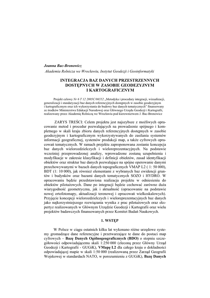 Joanna Bac-Bronowicz Akademia Rolnicza we Wrocławiu, Instytut Geodezji i Geoinformatyki INTEGRACJA BAZ DANYCH PRZESTRZENNYCH DOSTĘPNYCH W ZASOBIE GEODEZYJNYM I KARTOGRAFICZNYM Projekt celowy Nr 6 T 12 2005C/06552 „Metodyka i procedury integracji, wizualizacji, generalizacji i standaryzacji baz danych referencyjnych dostępnych w zasobie geodezyjnym i kartograficznym oraz ich wykorzystania do budowy baz danych tematycznych” finansowany ze środków Ministerstwa Edukacji Narodowej oraz Głównego Urzędu Geodezji i Kartografii, realizowany przez Akademię Rolniczą we Wrocławiu pod kierownictwem J. Bac-Bronowicz ZARYS TREŚCI: Celem projektu jest najszybsze z możliwych opracowanie metod i procedur pozwalających na prowadzenie spójnego i kompletnego w skali kraju zbioru danych referencyjnych dostępnych w zasobie geodezyjnym i kartograficznym wykorzystywanych do zasilania systemów informacji geograficznej, systemów produkcji map, a także cyfrowych opracowań tematycznych. W ramach projektu zaproponowana zostanie koncepcja baz danych wielorozdzielczych i wieloreprezentacyjnych. Na podstawie wcześniej przeprowadzonej analizy, wprowadzone zostaną uzupełnienia i modyfikacje w zakresie klasyfikacji i definicji obiektów, zasad identyfikacji obiektów oraz struktur baz danych pozwalające na spójne operowanie danymi przechowywanymi w bazach danych topograficznych VMAP L2 ( 1: 50 000), BDT (1: 10 000), jak również elementami z wybranych baz ewidencji gruntów i budynków oraz bazami danych tematycznych SOZO i HYDRO. W opracowaniu będzie przedstawiona realizacja projektu w odniesieniu do obiektów pilotażowych. Dane po integracji będzie cechować zarówno duża wiarygodność geometryczna, jak i aktualność (opracowanie na podstawie nowej ortofotomapy, aktualizacji terenowej i opracowań wielkoskalowych). Przyjęcie koncepcji wielorozdzielczych i wieloreprezentacyjnych baz danych jako najkorzystniejszego rozwiązania wynika z prac pilotażowych oraz ekspertyz realizowanych w Głównym Urzędzie Geodezji i Kartografii oraz wielu projektów badawczych finansowanych przez Komitet Badań Naukowych. 1. WSTĘP W Polsce w ciągu ostatnich kilku lat wykonano różne urzędowe systemy gromadzące dane referencyjne i przetwarzające te dane do postaci map cyfrowych – Bazę Danych Ogólnogeograficznych (BDO) o stopniu szczegółowości odpowiadającemu skali 1:250 000 (zleconą przez Główny Urząd Geodezji i Kartografii - GUGiK), VMapę L2 dla całego kraju o dokładności odpowiadającej mapie w skali 1:50 000 (realizowaną przez Zarząd Geografii Wojskowej w standardach NATO, w porozumieniu z GUGiK), Bazę Danych Topograficznych (TBD) o zasięgu odpowiadającym kilkuset arkuszom map 1:10 000 (zlecaną przez Główny Urząd Geodezji i Kartografii oraz Urzędy Marszałkowskie) oraz częściowo - mapę zasadniczą i ewidencję gruntów i budynków w formie elektronicznej. Wymienione bazy są oddzielnymi opracowaniami, o czterech poziomach dokładnościowych, różnym zakresie treści, i jak dotąd, współdziałające ze sobą w niewielkim zakresie. Z założenia bazy tych systemów zostały opracowane na podstawie różnych źródeł danych, w różnym czasie. Były one przewidziane do innych zastosowań, tworzone - w różnych uwarunkowaniach organizacyjno-technologicznych i przeznaczone dla różnych grup użytkowników. Dla prawidłowego funkcjonowania Krajowego Systemu Informacji Geograficznej konieczne jest możliwie jak najszybsze opracowanie metod i procedur pozwalających na prowadzenie spójnego i kompletnego w skali kraju zbioru referencyjnych baz danych, dostępnych w zasobie geodezyjnym i kartograficznym, z przeznaczeniem dla zasilania systemów informacji geograficznej, systemów produkcji map, a także cyfrowych opracowań tematycznych. Służba geodezyjna i kartograficzna jest obecnie na etapie definiowania SDI (infrastruktury danych przestrzennych) w Polsce. W tym kontekście należy spojrzeć na wszystkie wymienione bazy jako na dane referencyjne, które powinny współpracować w możliwie szerokim zakresie i stanowić osnowę dla specjalistycznych opracowań tematycznych. W pierwszej kolejności wydaje się celowe zapewnienie spójności prac w zakresie tworzenia TBD i VMapy L2+ (drugiej edycji). Wstępne koncepcje harmonizacji i integracji baz w oparciu o dane EGiB, TBD, VMap L2 i bazy SOZO i HYDRO przedstawiały w ostatnich dwóch latach niektóre urzędy marszałkowskie i powiatowe. Założenia teoretyczne wielorozdzielczej Bazy Danych Topograficznych były przedstawiane między innymi w publikacjach i czasopismach branżowych, (Gotlib i in. 2005, 2006, 2006a; System informacji...2005). W tym projekcie zostaną uwzględnione zebrane w GUGiK, CODGiK, WODGiK itd. dotychczasowe opracowania i koncepcje na temat TBD, VMAP2, VMAP2+, BDO, SOZO, HYDRO, Systemu Zarządzania TBD, Systemu Kontroli Danych, Geoserwera ZGW, Geoportalu, Banku Nazw Geograficznych, EGiB, prac KT nr 297 do spraw informacji geograficznej oraz innych opracowań dotyczących integracji, wizualizacji, generalizacji i standaryzacji baz danych (BacBronowicz i in. 2003, 2003a, 2004, 2004a, Christoffers F. i in.2005,Gotlib i in. 2004b, 2004c, 2004d, 2005b)). Przed przystąpieniem do opracowania projektu zapoznano się z wdrożeniami INSPIRE - (obecnie głównie z pracami zespołu ds. specyfikacji i harmonizacji danych). Zebrano też wnioski z projektów badawczych m. in. finansowanych przez Komitet Badań Naukowych i realizowanych przez m.in. przez: Politechnikę Warszawską, AGH, IGiK, Uniwersytet Warszawski i Wrocławski, ESRI, AR Wrocław oraz przeprowadzono konsultacje w różnych firmach: ESRI, GEOINVENT, GRID, INTERGRAPH, OPGK Kr., PPGK, PPWK WPG - na temat już opracowanych aplikacji użytecznych przy produkcji TBD, VMAP i opracowań tematycznych. Wielokrotnie przeprowadzano dyskusje w Departamentach Geodezji i Kartografii Urzędów Marszałkowskich: Dolnośląskim, Lubuskim, Łódzkim, Małopols