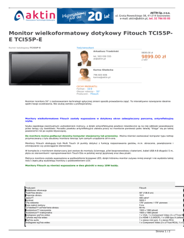 Monitor wielkoformatowy dotykowy Fitouch TCI55PE TCI55P-E Numer katalogowy:TCI55P-E Twój konsultant Arkadiusz Trzebiński tel. 503 030 555 [email protected] NOWOŚĆ W OFERCIE 9899.00 zł 9899.00 zł z VAT Karina Gładecka 796 603 606 [email protected] CECHY PRODUKTU: Format - 16:9 Obszar roboczy - 55" Producent - Fitouch Rozmiar monitora 55" z zastosowaniem technologii optycznej zmieni sposób prowadzenia zajęć. To interaktywne rozwiązanie idealnie spełni twoje oczekiwania. Nie szukaj zamów u profesjonalisty. Monitory wielkoformatowe Fitouch zostały wyposażone w dotykowy ekran zabezpieczony pancerną, antyrefleksyjną szybą. Szyba zapobiega ewentualnym uszkodzeniom matrycy, a dzięki antyrefleksyjnej powłoce niewidoczne są na niej odblaski powodowane przez lampy czy świetlówki. Ponadto powłoka antyrefleksyjna ułatwia pracę na monitorze ponieważ palec łatwiej "ślizga" się po takiej powierzchni niż po szybie błyszczącej. Do monitora można podłączyć dowolny komputer stacjonarny lub przenośny . Można również zastosować komputer typu nettop przymocowany z tyłu obudowy monitora tworząc tym samym urządzenie all-in-one. Monitory Fitouch obsługują tryb Multi Touch (4 punkty dotyku) z funkcją rozpoznawania gestów, m.in. obracanie, powiększanie i zmniejszanie czy przeciąganie elementów. W komplecie z monitorem dostarczany jest zestaw do montażu ściennego, pilot bezprzewodowy z bateriami, kabel USB A-B długości 5 m, płyta ze sterownikami i oprogramowaniem Touch Edu w polskiej wersji językowej oraz dwa pisaki. Matryca monitora została wyposażona w podświetlenie brzegowe LED, dzięki któremu monitor zużywa mniej energii i nie wydziela takiej ilości ciepła jaką wydzielają monitory z podświetleniem LCD. Monitory Fitouch są również wyposażone w dwa głośniki o mocy 10W każdy. Producent Dodatkowe informacje Przek?tna ekranu Proporcje obrazu Jasno?? Kontrast K?ty widzenia Czas reakcji matrycy Cz?stotliwo?? od?wie?ania obrazu Rozdzielczo?? rzeczywista Rozdzielczo?? maksymalna Analogowe wej?cia wideo Cyfrowe wej?cia wideo Wej?cia audio Analogowe wyj?cia wideo Fitouch 55" (138.8 cm) 16:9 400 cd/m² 5000:1 178° poziomo / 178° pionowo 5 ms 60 Hz 1920 x 1080 pikseli 1920 x 1080 pikseli 1 x VGA, 1 x Component Video (3 x z??cze RC 2 x HDMI 1.2 (HDCP), 1 x USB typu A (odtwarz 1 x stereo mini jack, 3 x stereo RCA 1 x Component Video (3 x z??cze RCA), 1 x C Strona 1 / 2 Cyfrowe wyj?cia wideo Wyj?cia audio Wej?cia steruj?ce Wyj?cia steruj?ce Wymiary zewn?trzne Waga Pobór mocy (max / typowy / czuwanie) brak 2 x stereo RCA, 1 x SPDIF 1 x USB typu B (sterowanie dotykowym ekrane brak 1334,6 x 805,4 x 110 mm 58 kg 415 / 300 / 0.5 W Strona 2 / 2 Powered by TCPDF (www.tcpdf.org)