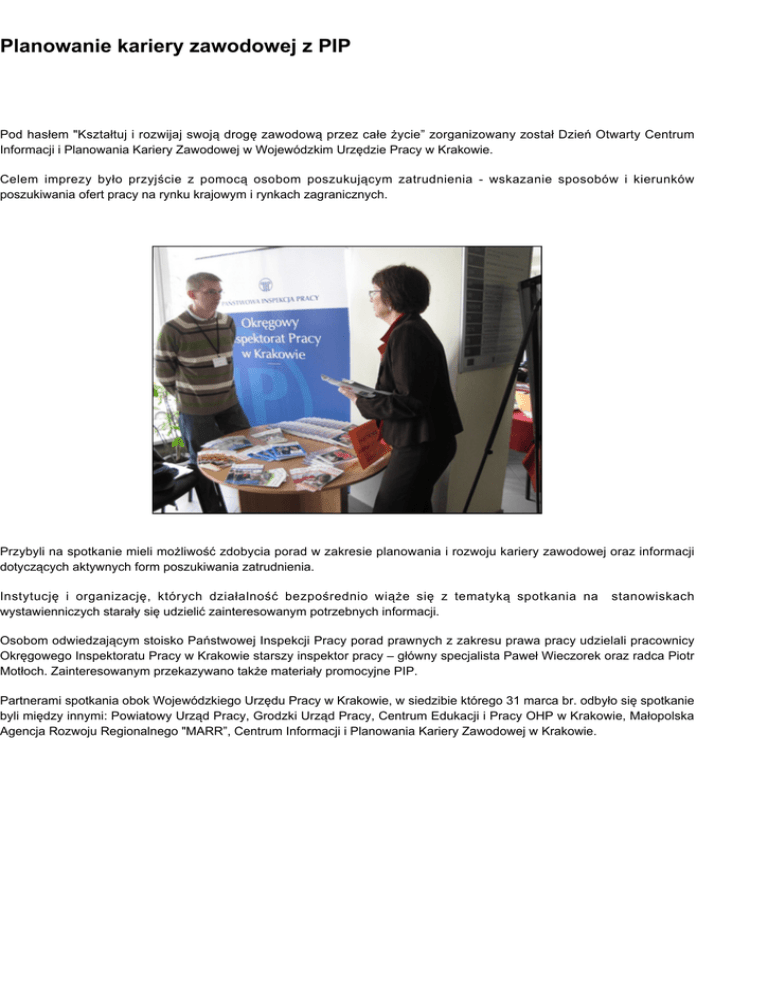 Planowanie kariery zawodowej z PIP Pod hasłem "Kształtuj i rozwijaj swoją drogę zawodową przez całe życie” zorganizowany został Dzień Otwarty Centrum Informacji i Planowania Kariery Zawodowej w Wojewódzkim Urzędzie Pracy w Krakowie. Celem imprezy było przyjście z pomocą osobom poszukującym zatrudnienia - wskazanie sposobów i kierunków poszukiwania ofert pracy na rynku krajowym i rynkach zagranicznych. Przybyli na spotkanie mieli możliwość zdobycia porad w zakresie planowania i rozwoju kariery zawodowej oraz informacji dotyczących aktywnych form poszukiwania zatrudnienia. Instytucję i organizację, których działalność bezpośrednio wiąże się z tematyką spotkania na wystawienniczych starały się udzielić zainteresowanym potrzebnych informacji. stanowiskach Osobom odwiedzającym stoisko Państwowej Inspekcji Pracy porad prawnych z zakresu prawa pracy udzielali pracownicy Okręgowego Inspektoratu Pracy w Krakowie starszy inspektor pracy – główny specjalista Paweł Wieczorek oraz radca Piotr Motłoch. Zainteresowanym przekazywano także materiały promocyjne PIP. Partnerami spotkania obok Wojewódzkiego Urzędu Pracy w Krakowie, w siedzibie którego 31 marca br. odbyło się spotkanie byli między innymi: Powiatowy Urząd Pracy, Grodzki Urząd Pracy, Centrum Edukacji i Pracy OHP w Krakowie, Małopolska Agencja Rozwoju Regionalnego "MARR”, Centrum Informacji i Planowania Kariery Zawodowej w Krakowie.