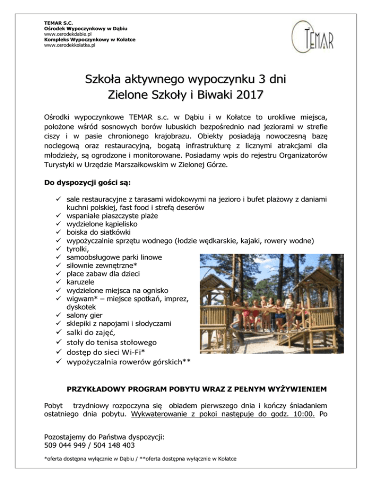 TEMAR S.C. Ośrodek Wypoczynkowy w Dąbiu www.osrodekdabie.pl Kompleks Wypoczynkowy w Kołatce www.osrodekkolatka.pl Szkoła aktywnego wypoczynku 3 dni Zielone Szkoły i Biwaki 2017 Ośrodki wypoczynkowe TEMAR s.c. w Dąbiu i w Kołatce to urokliwe miejsca, położone wśród sosnowych borów lubuskich bezpośrednio nad jeziorami w strefie ciszy i w pasie chronionego krajobrazu. Obiekty posiadają nowoczesną bazę noclegową oraz restauracyjną, bogatą infrastrukturę z licznymi atrakcjami dla młodzieży, są ogrodzone i monitorowane. Posiadamy wpis do rejestru Organizatorów Turystyki w Urzędzie Marszałkowskim w Zielonej Górze. Do dyspozycji gości są: sale restauracyjne z tarasami widokowymi na jezioro i bufet plażowy z daniami kuchni polskiej, fast food i strefą deserów wspaniałe piaszczyste plaże wydzielone kąpielisko boiska do siatkówki wypożyczalnie sprzętu wodnego (łodzie wędkarskie, kajaki, rowery wodne) tyrolki, samoobsługowe parki linowe siłownie zewnętrzne* place zabaw dla dzieci karuzele wydzielone miejsca na ognisko wigwam* – miejsce spotkań, imprez, dyskotek salony gier sklepiki z napojami i słodyczami salki do zajęć, stoły do tenisa stołowego dostęp do sieci Wi-Fi* wypożyczalnia rowerów górskich** PRZYKŁADOWY PROGRAM POBYTU WRAZ Z PEŁNYM WYŻYWIENIEM Pobyt trzydniowy rozpoczyna się obiadem pierwszego dnia i kończy śniadaniem ostatniego dnia pobytu. Wykwaterowanie z pokoi następuje do godz. 10:00. Po Pozostajemy do Państwa dyspozycji: 509 044 949 / 504 148 403 *oferta dostępna wyłącznie w Dąbiu / **oferta dostępna wyłącznie w Kołatce TEMAR S.C. Ośrodek Wypoczynkowy w Dąbiu www.osrodekdabie.pl Kompleks Wypoczynkowy w Kołatce www.osrodekkolatka.pl wcześniejszym uzgodnieniu, w ostatni dzień pobytu istnieje możliwość pozostania dłużej na terenie ośrodka i wykupienia dodatkowego obiadu. Pobyty trwają zwykle od poniedziałku do środy, od środy do piątku lub od piątku do niedzieli. Możliwe są także pobyty dłuższe niż 3-dniowe – prosimy o kontakt. Dla wszystkich chętnych OGNISKO, DYSKOTEKA GRATIS!!! Cena pobytu z 2 noclegami: • 170 zł/osobę - szkoła podstawowa • 180 zł/osobę - gimnazjum i liceum Cena pobytu z 1 noclegiem: 110 zł/osobę Opiekunowie 1 na 15 osób pobyt GRATIS CENA • • • • • • • OBEJMUJE: zakwaterowanie w domkach z łazienkami, pokoje 1-4 osobowe wyżywienie (śniadanie, obiad, kolacja) korzystanie z parku linowego, tyrolki, drobnego sprzętu sportowego (piłki do siatkówki, skakanki, hula hop, paletki do badmintona, paletki do tenisa stołowego) korzystanie z salki lekcyjnej, sali telewizyjnej (w razie brzydkiej pogody) dyskotekę ognisko z kiełbaskami przy grupach powyżej 30 osób - jednorazowo animator GRATIS (1 h zabaw) Stwórzcie swój własny program pobytu wzbogacając go o dodatkowe atrakcje znajdujące się w naszej ofercie – zapytajcie o szczegóły Pozostajemy do Państwa dyspozycji: 509 044 949 / 504 148 403 *oferta dostępna wyłącznie w Dąbiu / **oferta dostępna wyłącznie w Kołatce