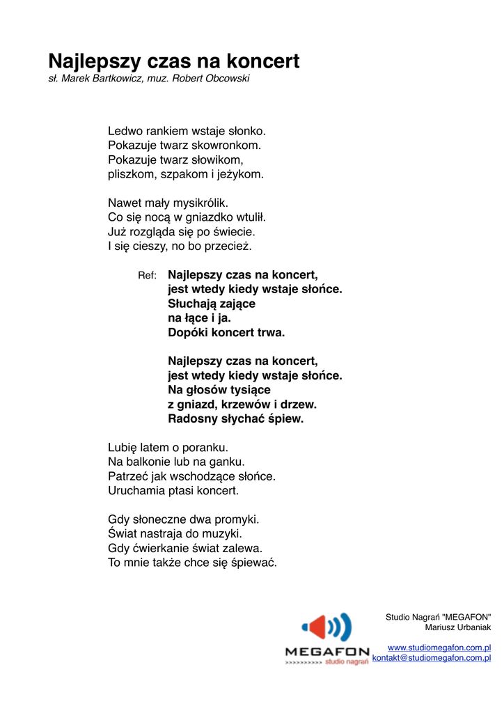 Najlepszy czas na koncert! sł. Marek Bartkowicz, muz. Robert Obcowski" ! ! ! ! ! ! ! ! ! ! ! ! ! ! ! ! ! ! ! ! ! Nawet mały mysikrólik.! Co się nocą w gniazdko wtulił.! Już rozgląda się po świecie.! I się cieszy, no bo przecież.! ! ! Ref: ! ! ! ! ! ! ! ! ! ! ! ! ! ! ! ! ! ! ! ! ! ! ! ! ! ! ! ! ! ! ! ! ! ! ! Lubię latem o poranku.! Na balkonie lub na ganku.! Patrzeć jak wschodzące słońce.! Uruchamia ptasi koncert.! ! ! ! ! ! ! ! ! ! ! ! ! ! ! ! Ledwo rankiem wstaje słonko.! Pokazuje twarz skowronkom.! Pokazuje twarz słowikom,! pliszkom, szpakom i jeżykom.! Najlepszy czas na koncert,! jest wtedy kiedy wstaje słońce.! Słuchają zające ! na łące i ja.! Dopóki koncert trwa.! Najlepszy czas na koncert,! jest wtedy kiedy wstaje słońce.! Na głosów tysiące! z gniazd, krzewów i drzew.! Radosny słychać śpiew.! Gdy słoneczne dwa promyki.! Świat nastraja do muzyki.! Gdy ćwierkanie świat zalewa.! To mnie także chce się śpiewać.! Studio Nagrań "MEGAFON" Mariusz Urbaniak www.studiomegafon.com.pl [email protected]