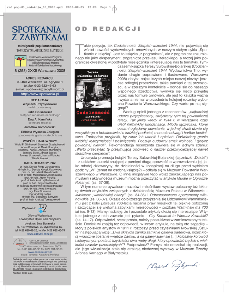 red pop:01_redakcja_08_2008.qxd 2008-08-05 12:28 Page 1 OD REDAKCJI miesięcznik popularnonaukowy TOWARZYSTWA OPIEKI NAD ZABYTKAMI zrealizowano w ramach Programu Operacyjnego Promocja Czytelnictwa ogłoszonego przez Ministra Kultury i Dziedzictwa Narodowego 8 (258) XXXII Warszawa 2008 ADRES REDAKCJI: 00-460 Warszawa, ul. Agrykoli 1 tel./fax 0-22 622-46-63 e-mail: [email protected] http://www.spotkania.pl REDAKCJA: Wojciech Przybyszewski redaktor naczelny Lidia Bruszewska zastępca redaktora naczelnego Ewa A. Kamińska sekretarz redakcji Jarosław Komorowski Elżbieta Wysocka-Zbiegień opracowanie graficzno-techniczne WSPÓŁPRACOWNICY: Witold P. Glinkowski, Stanisław Grzelachowski, Adam Konopacki, Marek Konopka, Robert M. Kunkel, Zbigniew Michalczyk, Zdzisław Skrok, Janusz Sujecki, Tomasz Urzykowski, Hanna Widacka, Wanda Załęska RADA REDAKCYJNA: dr hab. Dorota Folga-Januszewska dr hab. inż. Danuta Kłosek-Kozłowska prof. dr hab. Marek Kwiatkowski prof. dr hab. Małgorzata Omilanowska prof. dr hab. Jacek Purchla prof. dr hab. Andrzej Rottermund prof. dr hab. Bogumiła Rouba dr Tadeusz Rudkowski (przewodniczący) prof. dr hab. Anna Sieradzka mgr Ewa Siurawska mgr Andrzej Sołtan dr hab. inż. Bogusław Szmygin prof. dr hab. Andrzej Tomaszewski Wydawca: Oficyna Wydawnicza Towarzystwa Opieki nad Zabytkami dyrektor: Ewa Siurawska 00-459 Warszawa, ul. Myśliwiecka 1A, tel. 0-22 629-62-26, tel./fax 0-22 622-46-74 www.zabytki-tonz.pl 02-903 Warszawa, ul. Powsińska 69/71 tel. 0-22 694-67-52, fax 0-22 694-62-06 www.cokprm.gov.pl skład i łamanie: Katarzyna Płońska Redakcja zastrzega sobie prawo wprowadzania zmian i skrótów w materiałach przeznaczonych do publikacji oraz publikowania wybranych artykułów w wersji elektronicznej. Materiałów niezamówionych redakcja nie zwraca. Za treść reklam i ogłoszeń redakcja nie odpowiada. Nakład: 6000 egz. akie pozycje, jak Codzienność. Sierpień-wrzesień 1944, nie pojawiają się wśród nowości wydawniczych omawianych w naszym stałym cyklu „Spotkanie z książką”. Jest to książka „z pogranicza”, ale z pogranicza rozumianego nie jako eksperyment, pogranicze przekazu literackiego, a raczej jako pogranicze określonej w podtytule miesięcznika i interesującej nas tu tematyki. Tymczasem książka Teresy Sułowskiej-Bojarskiej (Codzienność. Sierpień-wrzesień 1944, Wydawnictwo Trio, wydanie drugie poprawione i ilustrowane, Warszawa 2008) dotyka najczulszych miejsc naszej niezbyt jeszcze odległej przeszłości, także pamięci o tej przeszłości, a w szerszym kontekście – odnosi się do naszego wspólnego dziedzictwa, wymyka się nieco przyjętej przez nas formule omówień, ale jest to książka ważna i wydana niemal w przededniu kolejnej rocznicy wybuchu Powstania Warszawskiego. Czy warto po nią sięgnąć? Według opinii jednego z recenzentów: „najbardziej uderza przyspieszony, zadyszany rytm tej powstańczej relacji. Tak jakby wtedy w 1944 r. w Warszawie czas uległ niezwykłej kondensacji. Młoda łączniczka, której oczami oglądamy powstanie, w jednej chwili dowie się wszystkiego o bohaterstwie i o ludzkiej podłości, o cnocie odwagi i hańbie bestialstwa. Zdobędzie przyjaciół, by zaraz ich utracić i opłakać. Doświadczy granic ludzkiej wytrzymałości i poświęcenia. Poczuje cudowny smak wolności i gorycz powtórnej niewoli”. Rekomendacja recenzenta zawiera się w jednym zdaniu: „Warto przeczytać tę przejmującą opowieść o nadziei przezwyciężającej nawet straszliwe cierpienie”. Uroczysta promocja książki Teresy Sułowskiej-Bojarskiej (łączniczki „Dzidzi”) – z udziałem autorki snującej z pamięci długą opowieść o wprowadzeniu jej, jako młodej dziewczyny, do działalności w konspiracji na długo przed wybiciem godziny „W” (temat na osobną książkę?) – odbyła się w Muzeum Powstania Warszawskiego w Warszawie. O innej inicjatywie tego wciąż zaskakującego nas pomysłami i aktywnością muzeum można przeczytać w artykule Murale w Ogrodzie Różanym (ss. 37-38). W tym numerze bywalcom muzeów i miłośnikom wystaw polecamy też lekturę dwóch artykułów związanych z działalnością Muzeum Pałacu w Wilanowie – Jubileusz „wiedeńskiej okazyi” (ss. 34-35) i Odrestaurowane apartamenty wilanowskie (ss. 36-37). Okazją do bliższego przyjrzenia się Lidzbarkowi Warmińskiemu jest z kolei jubileusz 700-lecia nadania praw miejskich tej pięknie położonej i szczycącej się wieloma zabytkami miejscowości – Lidzbark Warmiński ma 700 lat (ss. 9-13). Mamy nadzieję, że i pozostałe artykuły okażą się interesujące. W tytule jednego z nich zawarte jest pytanie – Czy Konarski to Wierusz-Kowalski? (ss. 14-17). Odpowiedzi, rzecz prosta, należy poszukiwać w zamieszczonym tekście. Dociekliwi znajdą też odpowiedź, w innym artykule, na taką oto zagadkę – który z polskich artystów w 1911 r. roztoczył przed czytelnikami lwowskiej „Sztuki” następującą wizję: „Dwa skrzydła zamku zamknie galerya parterowa, przez którą widoczne zostanie wnętrze Zamku, a na galeryi zjawi się [...] kolosalny korowód historycznych postaci, trzydzieści dwa metry długi, który opowiadać będzie o wielkości czasów przeminiętych”? Podpowiedź? Pomysł nie doczekał się realizacji, ale jego wizualizacja stała się atrakcją niedawnej wystawy w Muzeum Rzeźby Alfonsa Karnego w Białymstoku. T