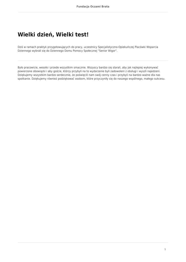 Fundacja Oczami Brata Wielki dzień, Wielki test! Dziś w ramach praktyk przygotowujących do pracy, uczestnicy Specjalistyczno-Opiekuńczej Placówki Wsparcia Dziennego wybrali się do Dziennego Domu Pomocy Społecznej "Senior Wigor". Było pracowicie, wesoło i przede wszystkim smacznie. Wszyscy bardzo się starali, aby jak najlepiej wykonywać powierzone obowiązki i aby goście, którzy przybyli na to wydarzenie byli zadowoleni z obsługi i wyszli najedzeni. Dziękujemy wszystkim bardzo serdecznie, że poświęcili nam swój cenny czas i przybyli na bardzo ważne dla nas spotkanie. Dziękujemy również podziękować osobom, które przyczyniły się do naszego wspólnego, małego sukcesu. 1