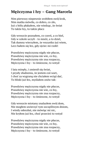iSing.pl - Każdy może śpiewać! Mężczyzna i łzy – Gang Marcela Nim pierwszy niepewnie zrobiłem swój krok, Nim matka mówiła, co dobro, co zło, Już z bólu płakałem, nie wiedząc, że świat To także łzy, to także płacz Gdy wreszcie poznałem, co czerń, a co biel, Gdy w szkole uczyli - to mnóż, a to dziel, Tak dumny wierzyłem, że wszystko już wiem, Lecz bałem się łez, gdy ojciec mi rzekł: Prawdziwy mężczyzna nigdy nie płacze, Prawdziwy mężczyzna nie wie, co łzy, Prawdziwy mężczyzna nie zna rozpaczy, Mężczyzna i łzy - to śmieszne, to wstyd I lata minęły, i zmienił się świat, I prysły złudzenia, że jestem coś wart, I choć za wygraną nie chciałem wciąż dać, To bliski już łez, myślałem znów tak: Prawdziwy mężczyzna nigdy nie płacze, Prawdziwy mężczyzna nie wie, co łzy, Prawdziwy mężczyzna nie zna rozpaczy, Mężczyzna i łzy - to śmieszne, to wstyd Gdy wreszcie miotany znalazłem swój dom, Nie mogłem uwierzyć tym szczęśliwym dniom, I wtedy odeszłaś, nie mówiąc mi nic, Nie kryłem już łez, choć przecież to wstyd Prawdziwy mężczyzna nigdy nie płacze, Prawdziwy mężczyzna nie wie, co łzy, Prawdziwy mężczyzna nie zna rozpaczy, Mężczyzna i łzy - to śmieszne, to wstyd Prawdziwy mężczyzna nigdy nie płacze, Prawdziwy mężczyzna nie wie, co łzy, Prawdziwy mężczyzna nie zna rozpaczy, Mężczyzna i łzy - to śmieszne, to wstyd Słowa: brak danych Muzyka: brak danych Rok wydania: brak danych Płyta: brak danych