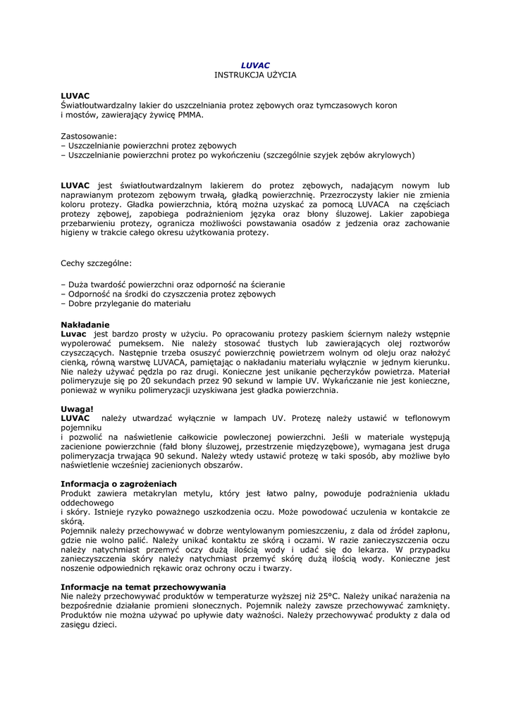 LUVAC INSTRUKCJA UŻYCIA LUVAC Światłoutwardzalny lakier do uszczelniania protez zębowych oraz tymczasowych koron i mostów, zawierający żywicę PMMA. Zastosowanie: – Uszczelnianie powierzchni protez zębowych – Uszczelnianie powierzchni protez po wykończeniu (szczególnie szyjek zębów akrylowych) LUVAC jest światłoutwardzalnym lakierem do protez zębowych, nadającym nowym lub naprawianym protezom zębowym trwałą, gładką powierzchnię. Przezroczysty lakier nie zmienia koloru protezy. Gładka powierzchnia, którą można uzyskać za pomocą LUVACA na częściach protezy zębowej, zapobiega podrażnieniom języka oraz błony śluzowej. Lakier zapobiega przebarwieniu protezy, ogranicza możliwości powstawania osadów z jedzenia oraz zachowanie higieny w trakcie całego okresu użytkowania protezy. Cechy szczególne: – Duża twardość powierzchni oraz odporność na ścieranie – Odporność na środki do czyszczenia protez zębowych – Dobre przyleganie do materiału Nakładanie Luvac jest bardzo prosty w użyciu. Po opracowaniu protezy paskiem ściernym należy wstępnie wypolerować pumeksem. Nie należy stosować tłustych lub zawierających olej roztworów czyszczących. Następnie trzeba osuszyć powierzchnię powietrzem wolnym od oleju oraz nałożyć cienką, równą warstwę LUVACA, pamiętając o nakładaniu materiału wyłącznie w jednym kierunku. Nie należy używać pędzla po raz drugi. Konieczne jest unikanie pęcherzyków powietrza. Materiał polimeryzuje się po 20 sekundach przez 90 sekund w lampie UV. Wykańczanie nie jest konieczne, ponieważ w wyniku polimeryzacji uzyskiwana jest gładka powierzchnia. Uwaga! LUVAC należy utwardzać wyłącznie w lampach UV. Protezę należy ustawić w teflonowym pojemniku i pozwolić na naświetlenie całkowicie powleczonej powierzchni. Jeśli w materiale występują zacienione powierzchnie (fałd błony śluzowej, przestrzenie międzyzębowe), wymagana jest druga polimeryzacja trwająca 90 sekund. Należy wtedy ustawić protezę w taki sposób, aby możliwe było naświetlenie wcześniej zacienionych obszarów. Informacja o zagrożeniach Produkt zawiera metakrylan metylu, który jest łatwo palny, powoduje podrażnienia układu oddechowego i skóry. Istnieje ryzyko poważnego uszkodzenia oczu. Może powodować uczulenia w kontakcie ze skórą. Pojemnik należy przechowywać w dobrze wentylowanym pomieszczeniu, z dala od źródeł zapłonu, gdzie nie wolno palić. Należy unikać kontaktu ze skórą i oczami. W razie zanieczyszczenia oczu należy natychmiast przemyć oczy dużą ilością wody i udać się do lekarza. W przypadku zanieczyszczenia skóry należy natychmiast przemyć skórę dużą ilością wody. Konieczne jest noszenie odpowiednich rękawic oraz ochrony oczu i twarzy. Informacje na temat przechowywania Nie należy przechowywać produktów w temperaturze wyższej niż 25°C. Należy unikać narażenia na bezpośrednie działanie promieni słonecznych. Pojemnik należy zawsze przechowywać zamknięty. Produktów nie można używać po upływie daty ważności. Należy przechowywać produkty z dala od zasięgu dzieci.