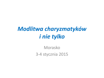 Modlitwa charyzmatyków i nie tylko Morasko 3-4 stycznia 2015 O czym powiemy? Modlitwa wspólnotowa – jaka jest? Wspólnie Charis, łaska, dar Uściślenia pojęciowe co do modlitwy charyzmatycznej Dar języków Modlitwa wspólnotowa a osobista Modlitwa uwielbienia Sposoby uwielbienia Boga Uwielbienie a grzech Papież Franciszek: modlitwa uwielbienia jest trudna, ale daje radość Korzyści z modlitwy uwielbienia Charis, łaska, dar Charyzmat jest “szczególną łaską”, “szczególnym darem”. gotowości do realizacji dobra (dotyka woli) i udziela konkretnej zdolności do jego realizacji Wolny dar Ducha Świętego: • nie można na niego zasłużyć, • ani go wypracować. Odbiorcą (nosicielem) charyzmatu jest pojedynczy chrześcijanin (niezależnie od miejsca w Kościele, święceń, stanu itd.). Innymi słowy charyzmat jest darem Ducha Świętego, który pomaga człowiekowi dostrzegać dobro, które jest do wykonania, umacnia w nim pragnienie jego realizacji oraz sprawia, że jest zdolny je zrealizować. Uściślenia pojęciowe co do modlitwy charyzmatycznej KKK 799: Charyzmaty, zarówno nadzwyczajne, jak również proste i zwyczajne są łaskami Ducha Świętego, bezpośrednio lub pośrednio służącymi Kościołowi; • zostają udzielone w celu budowania Kościoła, • dla dobra ludzi • oraz ze względu na potrzeby świata. Tak więc określenie “modlitwa charyzmatyczna” odnosi się niejako do każdej modlitwy (ponieważ modlący się chrześcijanin jest nosicielem charyzmatów). Nie ograniczajmy modlitwy charyzmatycznej tylko do wspólnot charyzmatycznych: i nie dzielmy ludzi we wspólnocie na “charyzmatyków” i “niecharyzmatyków”, na lepszych i gorszych... Dar języków Osoba obdarzona glosolalią posiada nad nią pełną kontrolę, to znaczy zawsze może zrezygnować z jej używania i co najmniej częściową kontrolę taką, że w wielu przypadkach może w sposób wolny inicjować używanie tego daru. Wolność ta jak się wydaje zależy od treści tego, co jest wypowiadane glosolalia może być bowiem modlitwą uwielbienia (wówczas pozostaje w pełni pod kontrolą nosiciela) lub też może być “mową ku zbudowaniu” wspólnoty, pewnym rodzajem proroctwa (wówczas jest silniej uzależniona od bezpośredniego działania Ducha Świętego, który chce przekazać wspólnocie swoje słowa). Modlitwa wspólnotowa a osobista Dobre spotkanie modlitewne bazuje na naszej osobistej modlitwie w ciągu tygodnia. Kiedy spotykamy się razem, nasza wspólna modlitwa: jest albo sumą naszej wierności słowu Boga i słuchania Ducha Świętego w ciągu minionego tygodnia, albo sumą naszych zaniedbań. Jeśli nie rozmawiamy z Bogiem prywatnie i osobiście – nie będziemy Mu mieli zbyt wiele do powiedzenia, gdy schodzimy modlić się wspólnie. Modlitwa uwielbienia Katechizm przypomina nam, że „uwielbienie jest tą formą modlitwy, w której człowiek najbardziej bezpośrednio uznaje, iż Bóg jest Bogiem. Wysławia Go dla Niego samego, oddaje Mu chwałę nie ze względu na to, co On czyni, ale dlatego że ON JEST” (KKK 2639). Innymi słowy, uwielbienie jest najbardziej bezinteresowną formą modlitwy. Pamiętajmy: • dziękczynienie to podziękowanie Bogu za to, co dla mnie zrobił • uwielbienie to że jest i jaki jest. Nie wysławiam Pana za coś co dla mnie zrobił, ale dlatego, że jest. Wielbię Go w Jego Bóstwie, Mądrości, Mocy, Majestacie i Chwale. Wielbię w Jego Miłosierdziu, dobroci, delikatności i dyspozycyjności, bliskości i trosce – zwłaszcza wtedy, gdy niespecjalnie je odczuwam. Koncentruję się na Nim, a nie na sobie. Trwając w uwielbieniu przywracam Bogu właściwe, czyli pierwsze miejsce w moim życiu. Modlitwa uwielbienia c.d. Modlitwa uwielbienia to antidotum na nieskuteczną (według nas) modlitwę prośby. Niska skuteczność modlitwy prośby bierze się między innymi właśnie stąd, • że o wiele łatwiej przychodzi nam koncentrować się w niej na sobie i swoich problemach, niż na Panu Bogu; • nie zawsze prosimy o prawdziwe dobro dla siebie, a nawet jeśli, to niekoniecznie jest to rzeczywiście dobro dla nas (nie da się przecież realizować wszystkich możliwych i dostępnych dóbr w życiu; wielokrotnie potrzebujemy Bożej podpowiedzi i światła, by dokonać słusznego wyboru). • prosimy o coś dobrego i zgodnego z wolą Bożą, ale w niewłaściwym czasie (na przykład chcemy czegoś za wcześnie lub zbyt szybko). RADOŚĆ ROZGORYCZENIE, ZNIECHĘCENIE Modlitwa uwielbienia c.d. Każdy czas jest odpowiedni, by uwielbiać Pana. Nie ma obawy, że uwielbię Go w niewłaściwym momencie. Wręcz przeciwnie: im bardziej moment wydaje się niewłaściwy (bo jestem smutny, zmęczony, zniechęcony, czuję się odrzucony lub skrzywdzony), tym gorliwiej i dłużej warto trwać w uwielbieniu. Modlitwa uwielbienia c.d. Uwielbienie dziełem Ducha Świętego – widzimy to Modlitwa uwielbienia, chwały, jest najwspanialszą, ale i najtrudniejszą. Sama ludzka rozumność, same siły psychiczne nie wystarczą. Konieczny jest szczególny udział Ducha Świętego - Mówi o tym Pismo św: - tak napełnieni Duchem Świętym wielbili Boga: Maryja, Zachariasz, Symeon, także sam Jezus, który „rozradował się w Duchu Świętym i rzekł: Wysławiam Cię Ojcze.... (Mt 11,25n.;Łk 10,21.) - Apostołowie po Zesłaniu Ducha Świętego głosili wielkie dzieła Boże, [...] wielbili Boga (Dz 2,11.47), a potem także ci, którzy doświadczali przez nich uzdrowienia (Dz 3,8.9; 4,21; 11,18), - także poganie mówią językami i wielbią Boga, gdy dar Ducha został wylany na nich (Dz 10,46) Sposoby uwielbienia Boga a/ Adoracją Jezusa w Najświętszym Sakramencie b/ Psalmami c/ Modlitwą uwielbienia ułożoną przez świętych, np. św. Franciszka modlitwa „Uwielbienie Boga Najwyższego” d/ Modlitwą spontaniczną - wynikłą z czytania Słowa Bożego: uwielbiaj Pana w Jego Słowie (Pismo Św. np. Ef 1, 1-10) - uwielbiaj Go w życiu