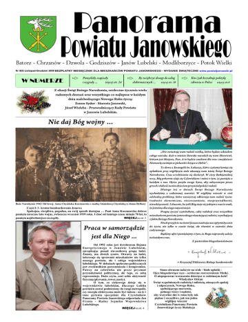 Panorama Powiatu Janowskiego Batorz - Chrzanów - Dzwola - Godziszów - Janów Lubelski - Modliborzyce - Potok Wielki Nr 9(9) Listopad-Grudzieñ 2009 BEZP£ATNY MIESIÊCZNIK DLA MIESZKAÑCÓW POWIATU JANOWSKIEGO - WYDANIE ŒWI¥TECZNE www.powiatjanowski.pl W NUMERZE Pomyœla³y, napisa³y i wygra³y ... wiêcej str. 24 By zwiêkszyæ dostêp do us³ug wiêcej str. 10 elektronicznych … Kto i jak kszta³tuje politykê zdrowia w Polsce wiêcej str.6 Z okazji Œwi¹t Bo¿ego Narodzenia, serdeczne ¿yczenia wielu radosnych doznañ oraz wszystkiego co najlepsze w ka¿dym dniu nadchodz¹cego Nowego Roku ¿ycz¹: Zenon Sydor - Starosta Janowski, Józef Wieleba - Przewodnicz¹cy Rady Powiatu w Janowie Lubelskim. Nie daj Bóg wojny … „Oto zwiastujê wam radoœæ wielk¹, która bêdzie udzia³em ca³ego narodu: dziœ w mieœcie Dawida narodzi³ siê wam Zbawiciel, którym jest Mesjasz, Pan. A to bêdzie znakiem dla was: znajdziecie Niemowlê owiniête w pieluszki i le¿¹ce w ¿³obie”. Te s³owa z Ewangelii œw. £ukasza, które czytamy ³ami¹c siê op³atkiem przy wigilijnym stole ukazuj¹ nam istotê Œwi¹t Bo¿ego Narodzenia. Czas oczekiwania siê skoñczy³. W ciszy Betlejemskiej nocy, Bóg pokornie staje siê Cz³owiekiem i mówi o tym, ¿e pamiêta o ka¿dym z nas. Ojciec posy³a swego Syna, aby udrêczonym przez grzech i s³aboœæ swoim dzieciom przyniós³ pokój i radoœæ. Dlatego te¿ w dniach Œwi¹t Bo¿ego Narodzenia wychodzimy z codziennej szaroœci. W wigilijny wieczór w cieñ odchodz¹ problemy, które zazwyczaj odbieraj¹ nam radoœæ ¿ycia: trudnoœci ekonomiczne, niezrozumienie, niesprawiedliwoœæ, Bo¿e Narodzenie 1942. Od lewej: Anna Chysiñska-Kaczmarska z matk¹ Stanis³aw¹ Chysiñsk¹ (z domu Dylbas) niewdziêcznoœæ. I s³usznie, bo jeœli Bóg staje siê jednym z nas to znak, ¿e jesteœmy dla niego najwa¿niejsi. Czêœæ I: 3 - krotne bombardowanie Janowa Spokojna, cierpliwa, pogodna, na swój sposób dostojna … Pani Anna Kaczmarska dobrze Pragnê ¿yczyæ czytelnikom, ca³ej redakcji oraz wszystkim pamiêta mroczne lata wojny, zw³aszcza wrzesieñ 1939 roku. I choæ od tamtego czasu minê³o 70 lat, to mieszkañcom powiatu janowskiego nieustaj¹cej radoœci, wynikaj¹cej pamiêta najdrobniejsze szczegó³y. WIÊCEJ na str. 3 z faktu Bo¿ego Narodzenia. Niech przyjœcie na œwiat Jezusa nastraja nas optymistycznie do ¿ycia, nie tylko w czasie œwi¹t, ale równie¿ w szaroœci dnia codziennego. B¹dŸmy ufni i pamiêtajmy o tym, ¿e Bogu naprawdê zale¿y na ka¿dym z nas. Z pasterskim b³ogos³awieñstwem Od 1992 roku jest dyrektorem Rejonu Energetycznego w Janowie Lubelskim, zarz¹dzaj¹c ponad stu-osobow¹ grup¹ ludzi. ¯onaty, ma dwóch synów. Otwarty na ludzi, interesuje siê sprawami mieszkañców nie tylko naszego powiatu, ale i ca³ego województwa + Krzysztof Nitkiewicz Biskup Sandomierski lubelskiego. W debatach spo³eczno-politycznych jest zwolennikiem porozumienia i kompromisu. Siano obrusem nakryte na stole - bia³e op³atki Patrzy na cz³owieka nie przez pryzmat Ojca b³ogos³awi¹ce rêce - serdeczne rozrzewnienie Matki. przynale¿noœci politycznej, ale tego, co sob¹ O niepoprawne wzruszenia dzieciêce w rodzinnym kole! reprezentuje. Du¿o czyta, ceni sobie aktywnoœæ W³adys³aw Orkan fizyczn¹ (p³ywanie, rower, narty). Œwi¹t wype³nionych radoœci¹ i mi³oœci¹, nios¹cych spokój O tym, co ciekawego dzieje siê w i odpoczynek, Nowego Roku, województwie lubelskim, dlaczego Lublin spe³niaj¹cego marzenia, powinien zostaæ podniesiony do rangi metropolii, pe³nego wiary i nadziei, czy energia elektryczna mo¿e byæ tañsza - na te i aby wszystkie dni w roku by³y tak inne pytania specjalnie dla Czytelników piêkne i szczêœliwe, jak ten jeden Panoramy Powiatu Janowskiego odpowiada Jan wigilijny wieczór Frania - Radny Sejmiku Województwa Czytelnikom Panoramy Powiatu Lubelskiego. Janowskiego ¿yczy Redakcja WIÊCEJ na str. 4 Praca w samorz¹dzie jest dla Niego ... Panorama Powiatu Janowskiego 91 rocznica Odzyskania Niepodleg³oœci 11 listopada 1918 roku to dzieñ, w którym skoñczy³a siê I wojna œwiatowa, a Polska po 123 latach niewoli odzyska³a wolnoœæ. Dzieñ 11 listopada w pamiêci Polaków ³¹czy siê nierozerwalnie z Józefem Pi³sudskim - wielkim patriot¹, który potrafi³ zjednoczyæ Polaków wokó³ wspólnej sprawy. W dniu 11 listopada 1918 roku Rada Regencyjna przekaza³a Józefowi Pi³sudskiemu zwierzchnoœæ nad Wojskiem Polskim, a 14 listopada pe³niê w³adzy w kraju. Dzieñ 11 listopada zosta³ w 1937 roku og³oszony œwiêtem narodowym. Jednak dzieñ ten by³ ju¿ od 1919 roku obchodzony jako Œwiêto Niepodleg³oœci. Dzieñ 11 listopada obchodzony obecnie jako Œwiêto Niepodleg³oœci by³ historycznie dniem, od którego II Rzeczpospolita wziê³a swój pocz¹tek. 70 rocznica krwawej egzekucji w Momotach Dolnych Wiele razy przeje¿d¿amy obok pomnika, który znajduje siê tu¿ obok przystanku w Momotach Dolnych. Niestety, nie robi ju¿ na nas wra¿enia. Wpisa³ siê w nasz krajobraz. Przyzwyczailiœmy siê do niego. Zobojêtnia³ nam. Niestety. Ka¿dy jednak pomnik, mogi³a, krzy¿ maj¹ swoj¹ wymowê, swój cel i zadanie. On ma przypominaæ nastêpnym pokoleniom, ¿e ta nasza momocka ziemia zosta³a zroszona polsk¹ krwi¹. Nasi rodacy zginêli tylko dlatego, ¿e byli Polakami. Przy wejœciu na cmentarz w Zakopanem na Pêksowym Brzysku widnieje napis: Ojczyzna to ludzie i groby. Narody trac¹c pamiêæ - gin¹. Nie mo¿emy wiêc zapomnieæ tego, co siê wydarzy³o 70 lat temu. To nasz obowi¹zek. Co roku wierni z Momot Dolnych zamawiaj¹ Mszê œwiêt¹ w intencji tych, którzy wtedy z³o¿yli swoje m³ode ¿ycie na o³tarzu Ojczyzny. Równie¿ w rocznicê tamtej zbrodni odprawiane jest nabo¿eñstwo i apel poleg³ych. I niech tak ju¿ pozostanie. W duchu mi³oœci Boga i Ojczyzny przekazujmy tamt¹ historiê nastêpnym pokoleniom. Oto jak wspomina³ ten dzieñ jeden ze œwiadków tragiczny