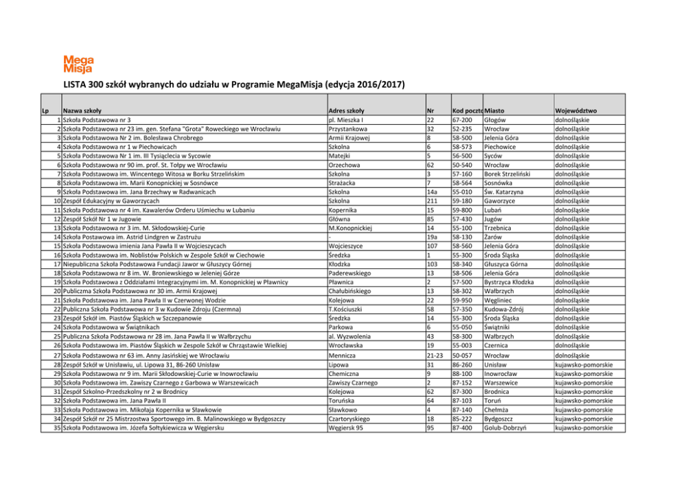 LISTA 300 szkół wybranych do udziału w Programie MegaMisja (edycja 2016/2017) Lp 1 2 3 4 5 6 7 8 9 10 11 12 13 14 15 16 17 18 19 20 21 22 23 24 25 26 Nazwa szkoły Szkoła Podstawowa nr 3 Szkoła Podstawowa nr 23 im. gen. Stefana "Grota" Roweckiego we Wrocławiu Szkoła Podstawowa Nr 2 im. Bolesława Chrobrego Szkoła Podstawowa nr 1 w Piechowicach Szkoła Podstawowa Nr 1 im. III Tysiąclecia w Sycowie Szkoła Podstawowa nr 90 im. prof. St. Tołpy we Wrocławiu Szkoła Podstawowa im. Wincentego Witosa w Borku Strzelińskim Szkoła Podstawowa im. Marii Konopnickiej w Sosnówce Szkoła Podstawowa im. Jana Brzechwy w Radwanicach Zespół Edukacyjny w Gaworzycach Szkoła Podstawowa nr 4 im. Kawalerów Orderu Uśmiechu w Lubaniu Zespół Szkół Nr 1 w Jugowie Szkoła Podstawowa nr 3 im. M. Skłodowskiej-Curie Szkoła Postawowa im. Astrid Lindgren w Zastrużu Szkoła Podstawowa imienia Jana Pawła II w Wojcieszycach Szkoła Podstawowa im. Noblistów Polskich w Zespole Szkół w Ciechowie Niepubliczna Szkoła Podstawowa Fundacji Jawor w Głuszycy Górnej Szkoła Podstawowa nr 8 im. W. Broniewskiego w Jeleniej Górze Szkoła Podstawowa z Oddziałami Integracyjnymi im. M. Konopnickiej w Pławnicy Publiczma Szkoła Podstawowa nr 30 im. Armii Krajowej Szkoła Podstawowa im. Jana Pawła II w Czerwonej Wodzie Publiczna Szkoła Podstawowa nr 3 w Kudowie Zdroju (Czermna) Zespół Szkół im. Piastów Śląskich w Szczepanowie Szkoła Podstawowa w Świątnikach Publiczna Szkoła Podstawowa nr 28 im. Jana Pawła II w Wałbrzychu Szkoła Podstawowa im. Piastów Śląskich w Zespole Szkół w Chrząstawie Wielkiej Adres szkoły pl. Mieszka I Przystankowa Armii Krajowej Szkolna Matejki Orzechowa Szkolna Strażacka Szkolna Szkolna Kopernika Główna M.Konopnickiej Wojcieszyce Średzka Kłodzka Paderewskiego Pławnica Chałubińskiego Kolejowa T.Kościuszki Średzka Parkowa al. Wyzwolenia Wrocławska Nr 22 32 8 6 5 62 3 7 14a 211 15 85 14 19a 107 1 103 13 2 13 22 58 14 6 43 19 Kod pocztowy Miasto 67-200 Głogów 52-235 Wrocław 58-500 Jelenia Góra 58-573 Piechowice 56-500 Syców 50-540 Wrocław 57-160 Borek Strzeliński 58-564 Sosnówka 55-010 Św. Katarzyna 59-180 Gaworzyce 59-800 Lubań 57-430 Jugów 55-100 Trzebnica 58-130 Żarów 58-560 Jelenia Góra 55-300 Środa Śląska 58-340 Głuszyca Górna 58-506 Jelenia Góra 57-500 Bystrzyca Kłodzka 58-302 Wałbrzych 59-950 Węgliniec 57-350 Kudowa-Zdrój 55-300 Środa Śląska 55-050 Świątniki 58-300 Wałbrzych 55-003 Czernica Województwo dolnośląskie dolnośląskie dolnośląskie dolnośląskie dolnośląskie dolnośląskie dolnośląskie dolnośląskie dolnośląskie dolnośląskie dolnośląskie dolnośląskie dolnośląskie dolnośląskie dolnośląskie dolnośląskie dolnośląskie dolnośląskie dolnośląskie dolnośląskie dolnośląskie dolnośląskie dolnośląskie dolnośląskie dolnośląskie dolnośląskie 27 28 29 30 31 32 33 34 35 Szkoła Podstawowa nr 63 im. Anny Jasińskiej we Wrocławiu Zespół Szkół w Unisławiu, ul. Lipowa 31, 86-260 Unisław Szkoła Podstawowa nr 9 im. Marii Skłodowskiej-Curie w Inowrocławiu Szkoła Podstawowa im. Zawiszy Czarnego z Garbowa w Warszewicach Zespół Szkolno-Przedszkolny nr 2 w Brodnicy Szkoła Podstawowa im. Jana Pawła II Szkoła Podstawowa im. Mikołaja Kopernika w Sławkowie Zespół Szkół nr 25 Mistrzostwa Sportowego im. B. Malinowskiego w Bydgoszczy Szkoła Podstawowa im. Józefa Sołtykiewicza w Węgiersku Mennicza Lipowa Chemiczna Zawiszy Czarnego Kolejowa Toruńska Sławkowo Czartoryskiego Węgiersk 95 21-23 31 9 2 62 64 4 18 95 50-057 86-260 88-100 87-152 87-300 87-103 87-140 85-222 87-400 dolnośląskie kujawsko-pomorskie kujawsko-pomorskie kujawsko-pomorskie kujawsko-pomorskie kujawsko-pomorskie kujawsko-pomorskie kujawsko-pomorskie kujawsko-pomorskie Wrocław Unisław Inowrocław Warszewice Brodnica Toruń Chełmża Bydgoszcz Golub-Dobrzyń 36 37 38 39 40 41 42 43 44 45 46 47 48 49 50 51 52 53 54 55 56 57 58 59 60 61 62 63 64 65 66 67 68 69 70 71 72 73 74 75 76 Szkoła podstawowa nr 1 w Sępólnie Krajeńskim Szkoła Podstawowa nr 2 im.Jana Brzechwy w Barcinie Zespół Szkół im. Celestyna Kamińskiego w Dąbrowie Chełmińskiej Zespół Szkół im. Jana Pawła II w Lubaniu Szkoła Podstawowa im. Władysława Broniewskiego w Iwcu Szkoła Podstawowa w Brzozowie Brzozowo 88 86-200 Chełmno Szkoła Podstawowa im. Hansa Christiana Andersena w Jawidzu Szkoła Podstawowa im. gen. Józefa Dwernickiego w Stoczku Łukowskim Zespół Placówek Oświatowych Nr 2 w Międzyrzecu Podlaskim Szkoła Podstawowa w Krzówce Zespół Szkół Ogólnokształcących w Józefowie nad Wisłą Zespół Szkół w Garbowie. Szkoła Podstawowa im. Marii Konopnickiej Szkoła Podstawowa im. Twórców Ludowych Lubelszczyzny w Rudce Kozłowieckiej Szkoła Podstawowa nr 21 im. Królowej Jadwigi w Lublnie Zespół Szkół w Kalinówce Szkoła Podstawowa im. Jana Brzechwy w Jackowie Szkoła Podstawowa w Turce Niepubliczna Szkoła Podstawowa z Oddziałami Integracyjnymi "Razem" w Chełmie Zespół Szkół Nr 4 w Zamościu - Szkoła Podstawowa Nr 4 im. Stefana Batorego ZESPÓŁ SZKÓŁ OGÓLNOKSZTAŁCĄCYCH Z ODDZIAŁAMI SPORTOWYMI NR 8 W CHEŁMIE.SZKOŁA PODSTAWOWA NR 8 Szkoła Podstawowa im. Jana Pawła II w Kaplonosach Zespól Szkół nr 1 w Opolu Lubelskim Szkoła Podstawowa nr 10 im. Henryka Sienkiewicza w Lublinie SZKOŁA PODSTAWOWA W NIEDRZWICY DUŻEJ Szkoła Podstawowa numer 1 w Gorzowie Wielkopolskim Niepubliczny Zespół Szkolno-Przedszkolny Pro Novo W Bogaczowie Publiczna Szkoła Podstawowa im. Jana Pawła II w Borowie Wielkim Publiczna Szkoła Podstawowa nr 7 w Zielonej Górze Ogólnokształcąca Szkoła Muzyczna I stopnia Szkoła Podstawowa w Gęstowicach Publiczna Szkoła Podstawowa im Kornela Makuszyńskiego w Leśniowie Wielkim Szkoła Podstawowa im. dr. H. Jordana w Ksawerowie Zespół Szkół w Ujeździe Szkoła Podstawowa im. Obrońców Westerplatte i Publiczne Gimnazjum w Ujeździe Szkoła Podstaw