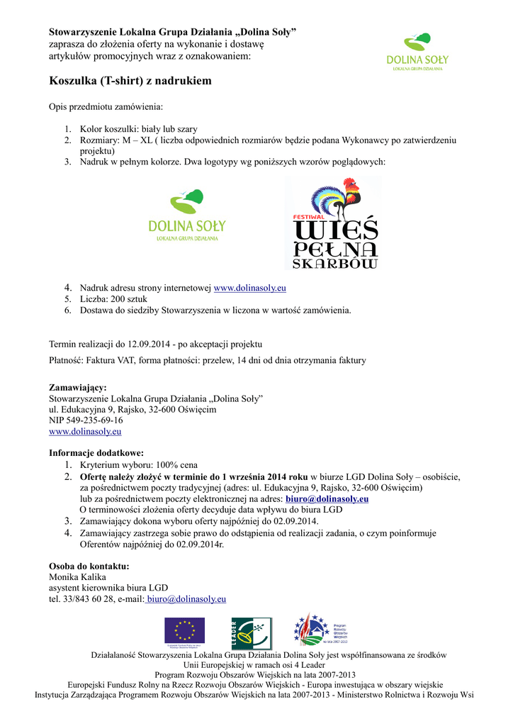 Stowarzyszenie Lokalna Grupa Działania „Dolina Soły” zaprasza do złożenia oferty na wykonanie i dostawę artykułów promocyjnych wraz z oznakowaniem: Koszulka (T-shirt) z nadrukiem Opis przedmiotu zamówienia: 1. Kolor koszulki: biały lub szary 2. Rozmiary: M – XL ( liczba odpowiednich rozmiarów będzie podana Wykonawcy po zatwierdzeniu projektu) 3. Nadruk w pełnym kolorze. Dwa logotypy wg poniższych wzorów poglądowych: 4. Nadruk adresu strony internetowej www.dolinasoly.eu 5. Liczba: 200 sztuk 6. Dostawa do siedziby Stowarzyszenia w liczona w wartość zamówienia. Termin realizacji do 12.09.2014 - po akceptacji projektu Płatność: Faktura VAT, forma płatności: przelew, 14 dni od dnia otrzymania faktury Zamawiający: Stowarzyszenie Lokalna Grupa Działania „Dolina Soły” ul. Edukacyjna 9, Rajsko, 32-600 Oświęcim NIP 549-235-69-16 www.dolinasoly.eu Informacje dodatkowe: 1. Kryterium wyboru: 100% cena 2. Ofertę należy złożyć w terminie do 1 września 2014 roku w biurze LGD Dolina Soły – osobiście, za pośrednictwem poczty tradycyjnej (adres: ul. Edukacyjna 9, Rajsko, 32-600 Oświęcim) lub za pośrednictwem poczty elektronicznej na adres: [email protected] O terminowości zlożenia oferty decyduje data wpływu do biura LGD 3. Zamawiający dokona wyboru oferty najpóźniej do 02.09.2014. 4. Zamawiający zastrzega sobie prawo do odstąpienia od realizacji zadania, o czym poinformuje Oferentów najpóźniej do 02.09.2014r. Osoba do kontaktu: Monika Kalika asystent kierownika biura LGD tel. 33/843 60 28, e-mail: [email protected] Europejski Fundusz Rolny na rzecz Rozwoju Obszarów Wiejskich Działalaność Stowarzyszenia Lokalna Grupa Działania Dolina Soły jest współfinansowana ze środków Unii Europejskiej w ramach osi 4 Leader Program Rozwoju Obszarów Wiejskich na lata 2007-2013 Europejski Fundusz Rolny na Rzecz Rozwoju Obszarów Wiejskich - Europa inwestująca w obszary wiejskie Instytucja Zarządzająca Programem Rozwoju Obszarów Wiejskich na lata 2007-2013 - Ministerstwo Rolnictwa i Rozwoju Wsi