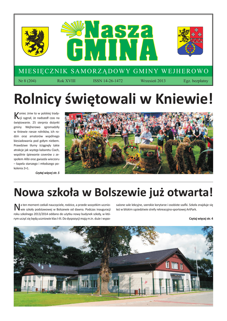 MIESIĘCZNIK SAMORZĄDOWY GMINY WEJHEROWO Nr 8 (204) Rok XVIII ISSN 14-26-1472 Wrzesień 2013 Egz. bezpłatny Rolnicy świętowali w Kniewie! K oniec żniw to w polskiej tradycji sygnał, że nadszedł czas na świętowanie. 25 sierpnia dożynki gminy Wejherowo zgromadziły w Kniewie rzesze rolników, ich rodzin oraz amatorów wspólnego biesiadowania pod gołym niebem. Prawdziwe tłumy ściągnęły takie atrakcje jak występ kabaretu Ciach, wspólnie śpiewanie coverów z zespołem Alibi oraz gwiazda wieczoru – kapela starszego i młodszego pokolenia 2+1. Czytaj więcej str. 5 Nowa szkoła w Bolszewie już otwarta! N a ten moment czekali nauczyciele, rodzice, a przede wszystkim uczniowie szkoły podstawowej w Bolszewie od dawna. Podczas inauguracji roku szkolnego 2013/2014 oddano do użytku nowy budynek szkoły, w którym uczyć się będą uczniowie klas I-III. Do dyspozycji mają m.in. duże i wypo- sażone sale lekcyjne, szerokie korytarze i osobiste szafki. Szkoła znajduje się też w bliskim sąsiedztwie strefy rekreacyjno-sportowej ArtPark. Czytaj więcej str. 4 NASZA GMINA Galeria Jubilatów Anna Dampc, 91 lat, Kniewo Augustyna Bollin, 91 lat, Pętkowice Maria Kosznicka 97 lat, Zbychowo Józefa Storóż, 90 lat, Ustarbowo Stefan Netzel, 90 lat, Bieszkowice Pierwsza pomoc z KGW Bolszewo Koło Gospodyń Wiejskich z Bolszewa wraz z radą sołecką Bolszewa zapraszają na pokaz pierwszej pomocy oraz pokaz samoobrony, który odbędzie się 4 października o godz. 17.00 w auli Samorządowego Gimnazjum w Bolszewie. KGW zapewnia poczęstunek i upominki dla uczestników. UWAGA MIESZKAŃCY GMINY WEJHEROWO Trwają zbiórki odpadów wielkogabarytowych na terenie Gminy Wejherowo. Przypominamy, że zgodnie z obowiązującym Regulaminem czystości i porządku na terenie Gminy Wejherowo uchwalonym przez Radę Gminy Wejherowo Uchwałą nr XXII/268/2012 z dnia 26 września 2012 r. od dnia 01 lipca 2013 r. zmieniły się zasady organizacji zbiórki tego typu odpadów. Odchodzimy od zbiórki w systemie kontenerowym, a wprowadzamy nowy system zbiórki odpadów wielkogabarytowych, polegający na tzw. „wystawkach”. Odpady wielkogabarytowe należy wystawiać w terminach „wystawek”, nie wcześniej niż 24 godziny przed terminem ich odbioru. Na terenach zabudowy jednorodzinnej odpady wielkogabarytowe powinny być wystawiane przed posesję w sposób nieutrudniający przejścia lub przejazdu, a w rejonach zabudowy wielorodzinnej przy pergoli śmietnikowej. Wystawki odpadów wielkogabarytowych odbędą się według poniższego harmonogramu: GOŚCICINO – 28 września 2013 r. / GOWINO, PĘTKOWICE, USTARBOWO, SOPIESZYNO – 5 października 2013 r. GNIEWOWO, ZBYCHOWO, KĄPINO, NOWY DWÓR WEJHEROWSKI, BIESZKOWICE, RESZKI, ŁĘŻYCE – 12 października 2013 r. ODBIÓR ODPADÓW WIELKOGABARYTOWYCH NASTĄPI OD GODZINY 10.00. Odpady wielkogabarytowe to odpady, które ze względu na swoje rozmiary i masę nie mogą być umieszczone w typowych pojemnikach czy workach przeznaczonych do zbierania odpadów komunalnych jak np.: meble, duży sprzęt elektryczny i elektroniczny, z wyłączeniem odpadów niebezpiecznych, np. papa. UWAGA! Zbiórka odpadów wielkogabarytowych obejmuje jedynie nieruchomości zamieszkałe. Nie będą zabierane odpady z zakładów produkcyjnych, usługowych, placówek handlowych, itp. a także gdy ilość i skład odpadów wskazywać będzie, że nie pochodzą z gospodarstw domowych. 2 | Miesięcznik Samorządowy Gminy Wejherowo nr 8 (204) Place zabaw dla mieszkańców Ustarbowa i Kniewa O dbiory techniczne dwóch placów zabaw odbyły się w Ustarbowie i Kniewie w obecności zastępcy wójta Macieja Milewskiego, pracowników Urzędu Gminy, wykonawcy, jak również radnych i sołtysów. Place zabaw składają się ze zjeżdżalni, huśtawek, ścianek wspinaczkowych, urządzeń fitness dla dorosłych, jak również ławek i śmietnikiów. Tereny pod place zabaw zostały wyrównane oraz obsiane trawą. Powstały na nich alejki spacerowe oraz tablice informujące o zasadach bezpieczeństwa obowiązujących na obiektach. Zapraszamy do korzystania i życzymy wspaniałej zabawy! 28 sierpnia dokonano odbioru technicznego parkingu przy Samorządowej Szkole Podstawowej w Orlu. Parking o łącznej powierzchni 755 m2 wykonano z kostki brukowej oraz płyt meba. Koszt budowy wynosi ok. 98 tys. zł. W odbiorze wzięli udział zastępca wójta Maciej Milewski, pracownicy Urzędu Gminy, wykonawca oraz zastępca dyrektora szkoły podstawowej Anna Krampichowska. Informujemy również, że przy szkole podstawowej w Orlu trwa budowa kolejnego, 6 już w gminie Wejherowo placu zabaw w ramach programu „Radosna Szkoła”. Plac zabaw w Ustarbowie. Plac zabaw w Kniewie. Nowy parking przy szkole podstawowej w Orlu. Rewolucja przedszkolna w naszej Gminie W ostatnim czasie obserwujemy znaczne zainteresowanie się władz państwowych dziećmi w wieku przedszkolnym. Jego wynikiem są zmiany w Ustawie o Systemie Oświaty. Najważniejsze zmiany w niej zawarte dotyczą obniżenia wieku dzieci objętych obowiązkiem przedszkolnym oraz zmniejszenia opłat za pobyt dziecka w przedszkolu. Pierwsza zmiana jest szeroko dyskutowana i znana wszystkim zainteresowanym, druga obejmuje wszystkie dzieci przedszkolne i wpływa na obniżenie kosztów pobytu dziecka w przedszkolu, ponoszonych przez rodziców. Od 1 września 2013 roku wszyscy rodzice płacą za każdą dodatkową godzinę pobytu dziecka w przedszkolu ponad 5 godzin tylko złotówkę. Do pokrycia pozostałych kosztów zobligowana jest Gmina - z funduszy własnych i dotacji otrzymywanych od Państwa. Na terenie Gminy Wejherowo do sierpnia 2013 r. działały 4 przedszkola i 3 punkty przedszkolne. Zawiera się w tym, prowadzone przez Gminę - Samorządowe Przedszkole w Gościcinie oraz pozostałe placówki niepubliczne. Do przedszkola samorządowego uczęszczało w ubiegłym roku 97 dzieci, w przedszkolach niepublicznych przebywało około 164 dzieci, a punkty przedsz
