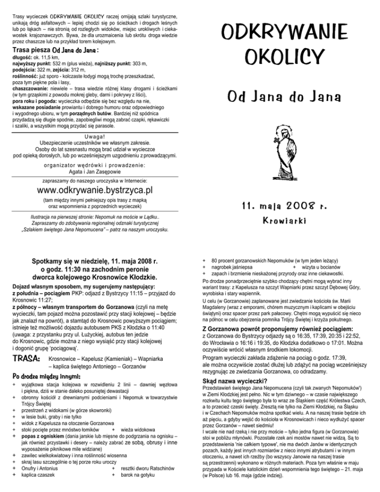 Trasy wycieczek ODKRYWANIE OKOLICY raczej omijają szlaki turystyczne, unikają dróg asfaltowych – lepiej chodzi się po ścieŜkach i drogach leśnych lub po łąkach – nie stronią od rozległych widoków, miejsc urokliwych i ciekawostek krajoznawczych. Bywa, Ŝe dla urozmaicenia lub skrótu droga wiedzie przez chaszcze lub na przykład torem kolejowym. Trasa piesza Od Jana do Jana : długość: ok. 11,5 km, najwyŜszy punkt: 532 m (plus wieŜa), najniŜszy punkt: 303 m, podejścia: 322 m, zejścia: 312 m, roślinność: juŜ sporo - kolczaste łodygi mogą trochę przeszkadzać, poza tym piękne pola i lasy, chaszczowanie: niewiele – trasa wiedzie róŜnej klasy drogami i ścieŜkami (w tym grząskimi z powodu mokrej gleby, darni i pokrywy z liści), pora roku i pogoda: wycieczka odbędzie się bez względu na nie, wskazane posiadanie prowiantu i dobrego humoru oraz odpowiedniego i wygodnego ubioru, w tym porządnych butów. Bardziej niŜ spódnica przydadzą się długie spodnie, zapobiegliwi mogą zabrać czapki, rękawiczki i szaliki, a wszystkim mogą przydać się parasole. ODKRYWANIE OKOLICY Od Jana do Jana Uwaga! Ubezpieczenie uczestników we własnym zakresie. Osoby do lat szesnastu mogą brać udział w wycieczce pod opieką dorosłych, lub po wcześniejszym uzgodnieniu z prowadzącymi. o r g a n iza t o r w ę d r ó w ki i p r o w a d ze n ie : Agata i Jan Zasępowie zapraszamy do naszego uroczyska w Internecie: www.odkrywanie.bystrzyca.pl (tam między innymi pełniejszy opis trasy z mapką oraz wspomnienia z poprzednich wycieczek) Ilustracja na pierwszej stronie: Nepomuk na moście w Lądku.. Zapraszamy do zdobywania regionalnej odznaki turystycznej „Szlakiem świętego Jana Nepomucena” – patrz na naszym uroczysku. Spotkamy się w niedzielę, 11. maja 2008 r. o godz. 11:30 na zachodnim peronie dworca kolejowego Krosnowice Kłodzkie. Dojazd własnym sposobem, my sugerujemy następujący: z południa – pociągiem PKP: odjazd z Bystrzycy 11:15 – przyjazd do Krosnowic 11:27; z północy – własnym transportem do Gorzanowa (czyli na metę wycieczki, tam pojazd moŜna pozostawić przy stacji kolejowej – będzie jak znalazł na powrót), a stamtąd do Krosnowic powyŜszym pociągiem; istnieje teŜ moŜliwość dojazdu autobusem PKS z Kłodzka o 11:40 (uwaga: z przystanku przy ul. ŁuŜyckiej, autobus ten jedzie do Krosnowic, gdzie moŜna z niego wysiąść przy stacji kolejowej i dogonić grupę ‘pociągową’. TRASA: Krosnowice – Kapelusz (Kamieniak) – Wapniarka – kaplica świętego Antoniego – Gorzanów Po drodze między innymi: + + + + + + + + + + + wyjątkowa stacja kolejowa w rozwidleniu 2 linii – dawniej węzłowa i piękna, dziś w stanie daleko posuniętej dewastacji obronny kościół z drewnianymi podcieniami i Nepomuk w towarzystwie Trójcy Świętej przestrzeń z widokami (w górze skowronki) w lesie buki, graby i nie tylko widok z Kapelusza na otoczenie Gorzanowa stoki pocięte przez mnóstwo łomików + wieŜa widokowa popas z ogniskiem (dania jarskie lub mięsne do podgrzania na ognisku – jak równieŜ przystawki i desery – naleŜy zabrać ze sobą, obrusy i inne wyposaŜenie piknikowe mile widziane) zawilec wielkokwiatowy i inna roślinność wiosenna skraj lasu szczególnie o tej porze roku uroczy Onufry i Antonius + resztki dworu Ratschinów kaplica czaszek + barok na gotyku 11. maja 2008 r. Krowiarki + 80 procent gorzanowskich Nepomuków (w tym jeden leŜący) + nagrobek jaśniepsa + wizyta u bocianów + zapach i brzmienie nieskaŜonej przyrody oraz inne ciekawostki. Po drodze ponadprzeciętnie szybko chodzący chętni mogą wybrać inny wariant trasy: z Kapelusza na szczyt Wapniarki przez szczyt Dębowej Góry, wyrobiska i stary wapiennik. U celu (w Gorzanowie) zaplanowane jest zwiedzanie kościoła św. Marii Magdaleny (wraz z emporami, chórem muzycznym i kaplicami w obejściu świątyni) oraz spacer przez park pałacowy. Chętni mogą wypuścić się nieco na północ w celu obejrzenia pomnika Trójcy Świętej i krzyŜa pokutnego. Z Gorzanowa powrót proponujemy równieŜ pociągiem: z Gorzanowa do Bystrzycy odjazdy są o 16:35, 17:39, 20:35 i 22:52, do Wrocławia o 16:16 i 19:35, do Kłodzka dodatkowo o 17:01. MoŜna oczywiście wrócić własnym środkiem lokomocji. Program wycieczki zakłada zdąŜenie na pociąg o godz. 17:39, ale moŜna oczywiście zostać dłuŜej lub zdąŜyć na pociąg wcześniejszy rezygnując ze zwiedzania Gorzanowa, co odradzamy. Skąd nazwa wycieczki? Przedstawień świętego Jana Nepomucena (czyli tak zwanych 'Nepomuków') w Ziemi Kłodzkiej jest pełno. Nic w tym dziwnego – w czasie największego rozkwitu kultu tego świętego była to wraz ze Śląskiem część Królestwa Czech, a to przecieŜ czeski święty. Zresztą nie tylko na Ziemi Kłodzkiej, na Śląsku i w Czechach Nepomuków moŜna spotkać wielu. A na naszej trasie będzie ich aŜ pięciu, a gdyby wejść do kościoła w Krosnowicach i nieco wydłuŜyć spacer przez Gorzanów – nawet siedmiu! I wcale nie nad rzeką i nie przy moście – tylko jedna figura (w Gorzanowie) stoi w pobliŜu młynówki. Pozostałe rzek ani mostów nawet nie widzą. Są to przedstawienia 'nie całkiem typowe', nie ma dwóch Janów w identycznych pozach, kaŜdy jest innych rozmiarów z nieco innymi atrybutami i w innym otoczeniu, a nawet ich rzeźby (bo wszyscy Janowie na naszej trasie są przestrzenni) wykonano w róŜnych materiach. Poza tym właśnie w maju przypada w Kościele katolickim dzień wspomnienia tego świętego – 21. maja (w Polsce) lub 16. maja (gdzie indziej). Spotkamy się w niedzielę, 11. maja 2008 r. o godz. 11:30 na zachodnim peronie dworca kolejowego Krosnowice Kłodzkie. Dojazd własnym sposobem, my sugerujemy następujący: z południa – pociągiem PKP: odjazd z Bystrzycy 11:15 – przyjazd do Krosnowic 11:27; z północy – własnym transportem do Gorzanowa (czyli na metę wycieczki, tam pojazd moŜna pozostawić 