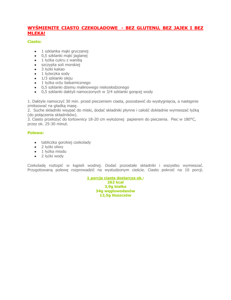 WYŚMIENITE CIASTO CZEKOLADOWE - BEZ GLUTENU, BEZ JAJEK I BEZ MLEKA! Ciasto: 1 szklanka mąki gryczanej 0,5 szklanki mąki jaglanej 1 łyżka cukru z wanilią szczypta soli morskiej 3 łyżki kakao 1 łyżeczka sody 1/3 szklanki oleju 1 łyżka octu balsamicznego 0,5 szklanki dżemu malinowego niskosłodzonego 0,5 szklanki daktyli namoczonych w 3/4 szklanki gorącej wody 1. Daktyle namoczyć 30 min. przed pieczeniem ciasta, pozostawić do wystygnięcia, a następnie zmiksować na gładką masę. 2. Suche składniki wsypać do miski, dodać składniki płynne i całość dokładnie wymieszać łyżką (do połączenia składników). 3. Ciasto przełożyć do tortownicy 18-20 cm wyłożonej papierem do pieczenia. Piec w 180°C, przez ok. 25-30 minut. Polewa: tabliczka gorzkiej czekolady 2 łyżki oliwy 1 łyżka miodu 2 łyżki wody Czekoladę roztopić w kąpieli wodnej. Dodać pozostałe składniki i wszystko wymieszać. Przygotowaną polewę rozprowadzić na wystudzonym cieście. Ciasto pokroić na 10 porcji. 1 porcja ciasta dostarcza ok.: 262 kcal 3,9g białka 34g węglowodanów 12,5g tłuszczów